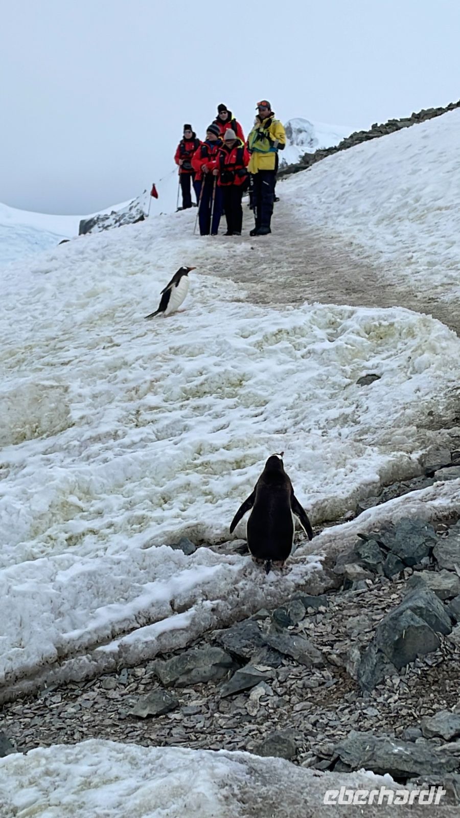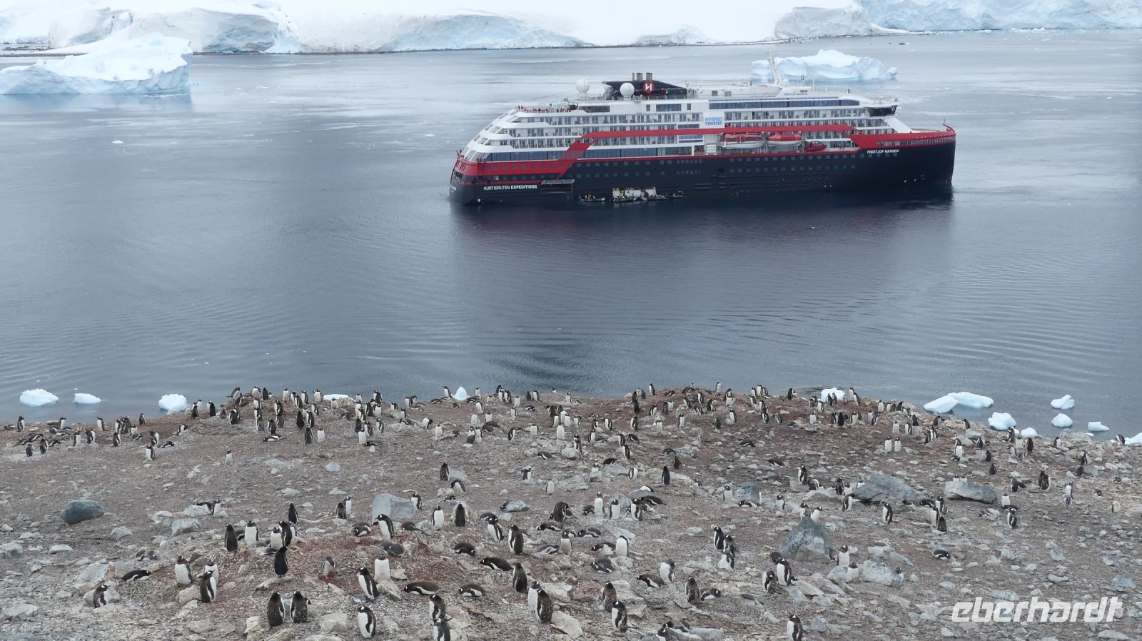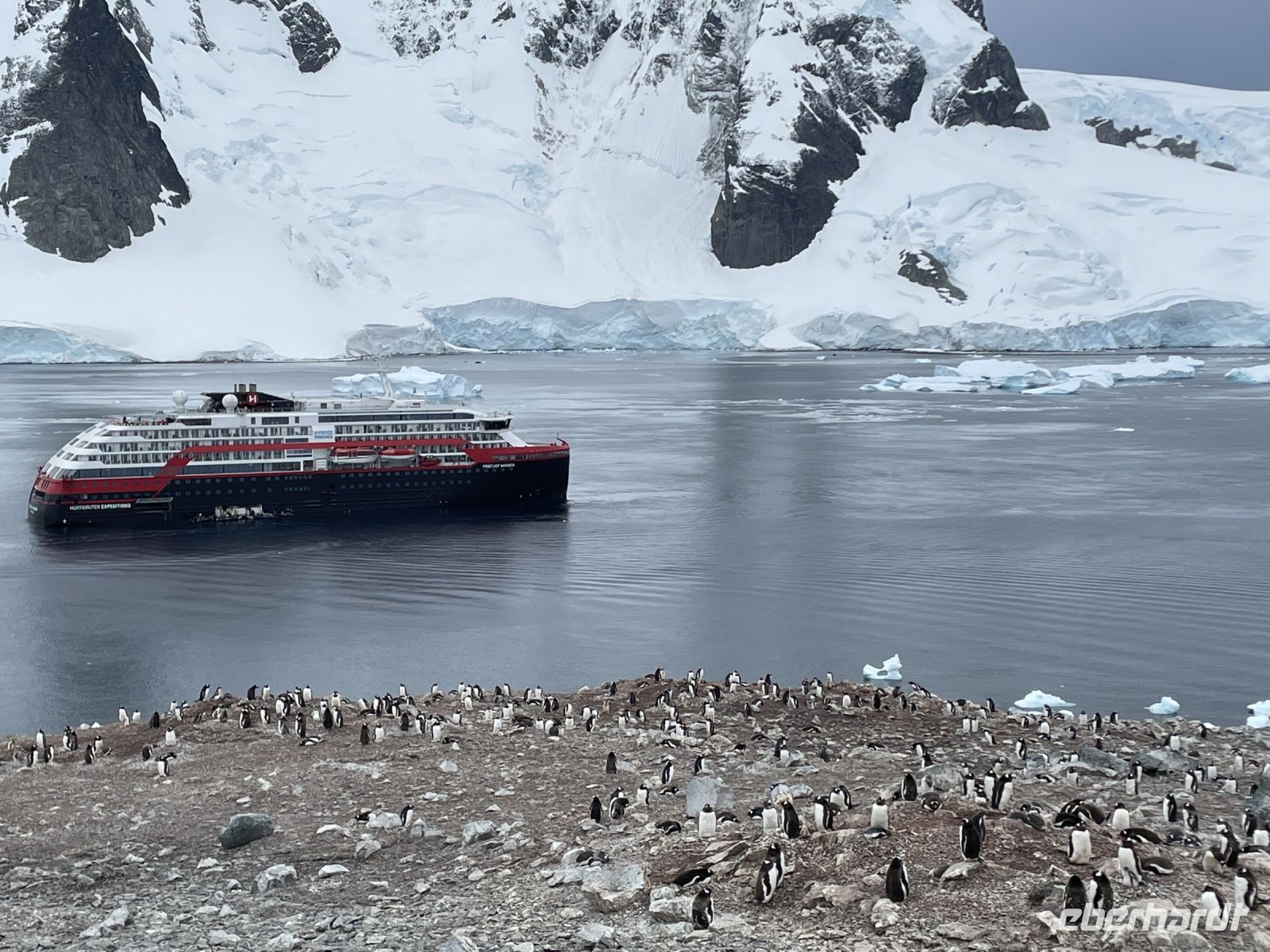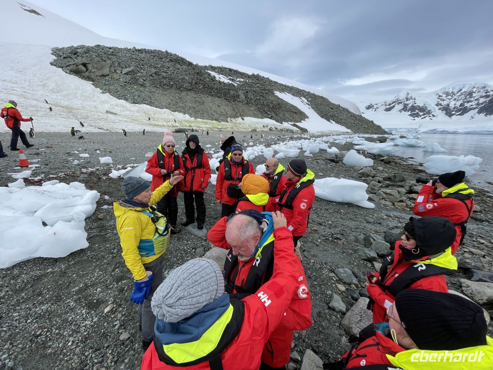 Am Samstagmorgen kommen wir in Neko Harbour an. Einige Gäste starten am Morgen zu einer Kajaktour, doch leider muss das Programm im Verlauf des Vormittags wegen schlechten Wetters abgesagt werden. Somit finden die weiteren Kajaktouren, die Fotocruise/Anlandungen nicht mehr statt. Einige Reisegäste (nicht von unserer Gruppe) sind sogar früh bei der ersten Kajakgruppe ins kalte Wasser gefallen, aufgrund des starkem Winds. Zum Glück hat jeder immer einen Überlebensanzug an. Nach dem Mittagessen wird wegen starkem Wind auch unsere Bootstour in der Aguirre-Passage abgesagt, doch zum Glück findet die für Nachmittag geplante Anlandung in Neko Harbour statt. Bei recht starkem Wellengang und grenzwertigen Wind, wagen wir die nächste Anlandung und fahren mit den Booten an die Anlandungsstelle. Dort angekommen überqueren wir eine sogenannte „Pinguin-Autobahn“ und sehen wieder viele Eselspinguine auf dem Schnee und auf den Felsen. Im Hintergrund sind gigantische Gletscher zu bewundern. Auch diese Anlandung ist trotz der schlechten Witterung ein großes Highlight. Wieder einmal kommen wir den Pinguinen recht nahe und können die süßen Tiere filmen und fotografieren. Ein toller Abschluss, denn einen weiteren Landgang wird es am nächsten Tag leider nicht geben. Am Abend erhalten wir nach dem Essen noch einige Informationen für den letzten Ausflugstag und anschließend nehmen wir an einer Versteigerung von Hurtigruten teil, bei der für einen guten Zweck Seekarten, Fahnen und Aufenthalte in Suiten versteigert werden.