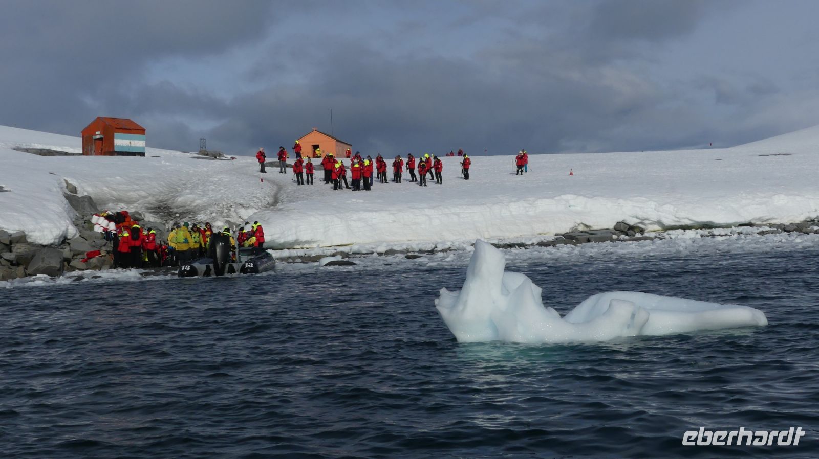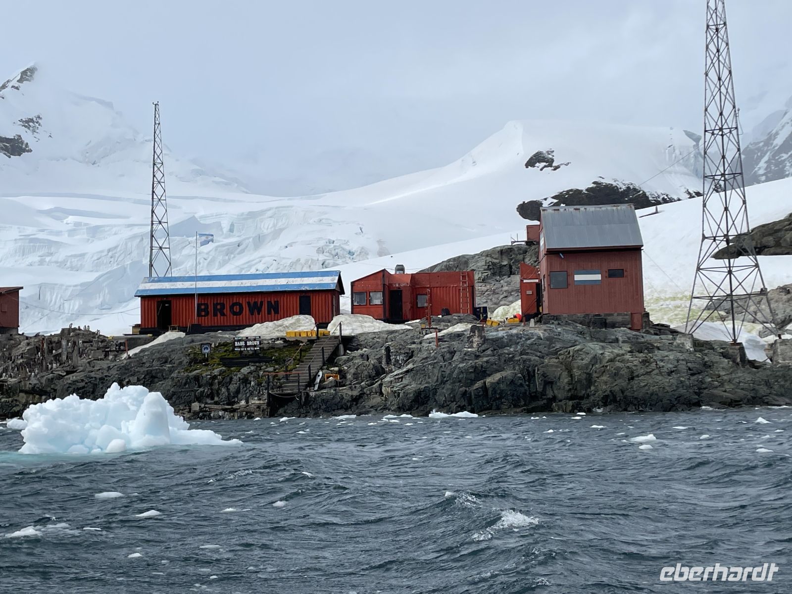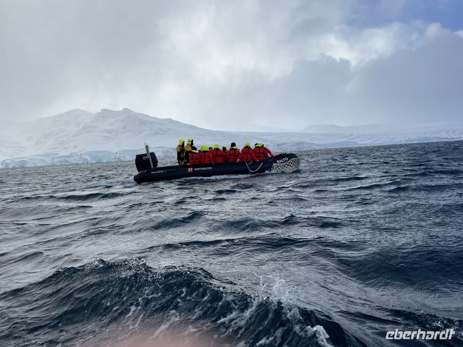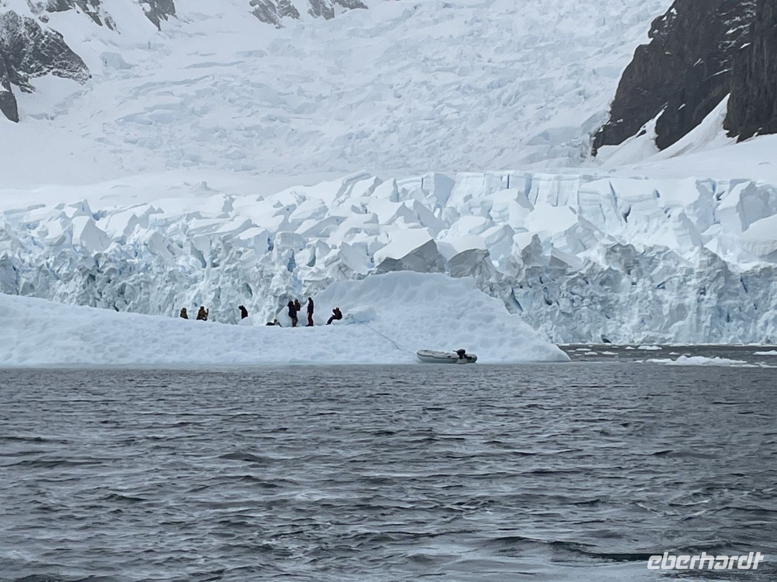 Für unseren neunten Tag steht nach dem Frühstück die eindrucksvolle Bootsfahrt zwischen Eisbergen und Eisschollen in der Skontorp Cove auf dem Programm. Wir sind etwa 40 Minuten unterwegs und sehen Eisberge, Eisschollen und die argentinische Forschungsstation Brown Station. Zudem sichten wir ein Filmteam mit einem Piano auf einer Eisscholle… wer weiß was hier gedreht wird. Bei den Bootsfahrten muss man sich besonders warm anziehen. Drei Kleidungsschichten und 2 Jacken, zudem Mütze, Schal und Handschuhe… denn der Wind zieht auf den längeren Bootsfahrten besonders kräftig. Da fühlen sich -2 Grad an wie -15 Grad. Nach der ausgiebigen Bootsfahrt mit Expeditionsleiterin Carina, geht es wieder zurück zum Schiff.