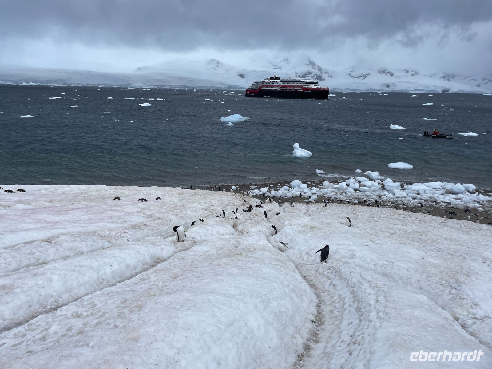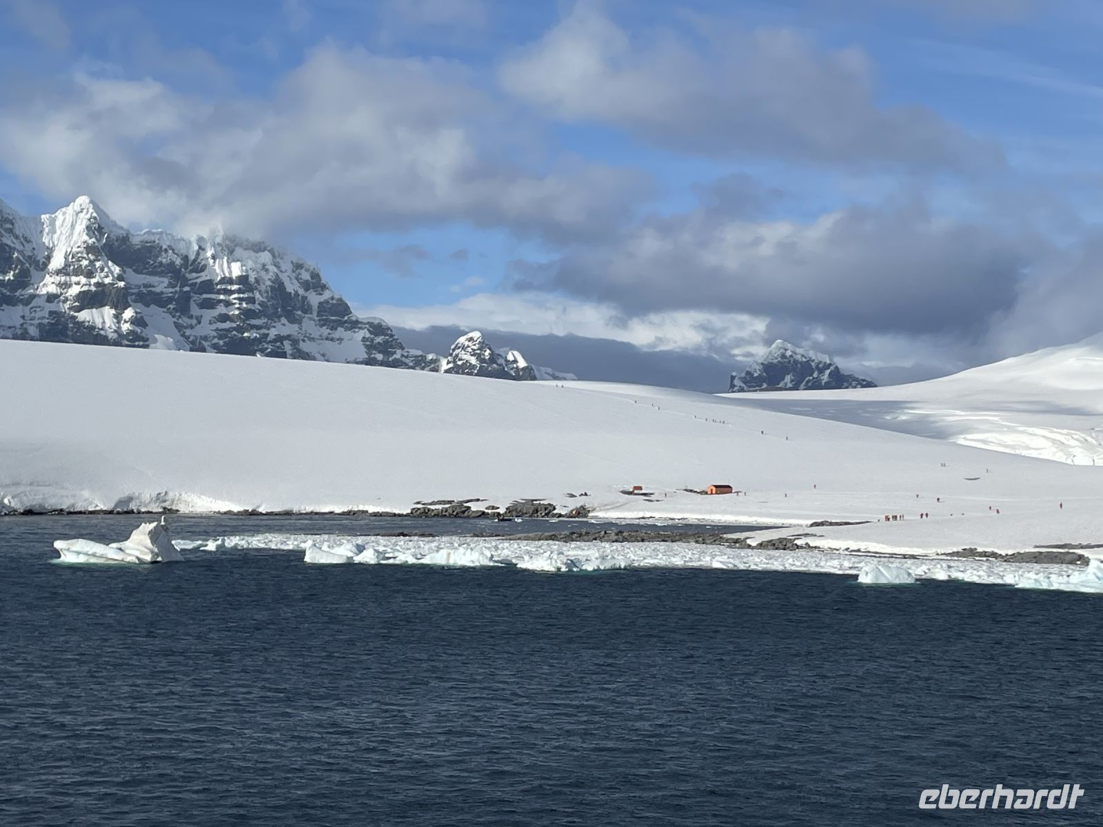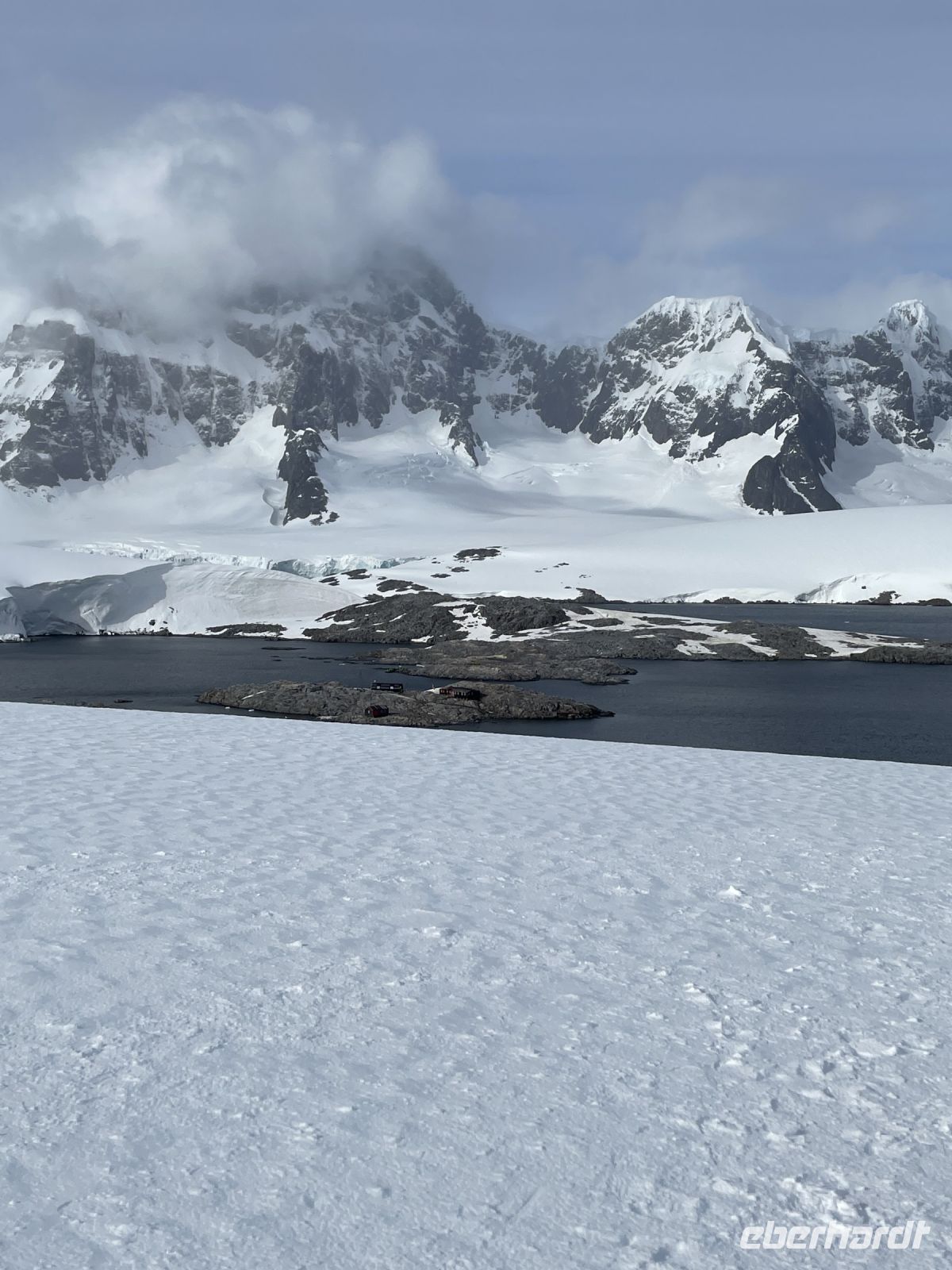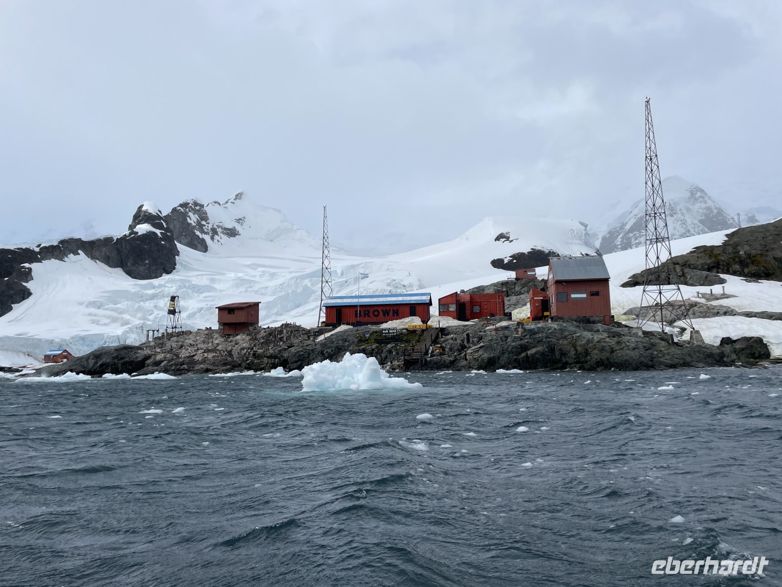 Für unseren neunten Tag steht nach dem Frühstück die eindrucksvolle Bootsfahrt zwischen Eisbergen und Eisschollen in der Skontorp Cove auf dem Programm. Wir sind etwa 40 Minuten unterwegs und sehen Eisberge, Eisschollen und die argentinische Forschungsstation Brown Station. Zudem sichten wir ein Filmteam mit einem Piano auf einer Eisscholle… wer weiß was hier gedreht wird. Bei den Bootsfahrten muss man sich besonders warm anziehen. Drei Kleidungsschichten und 2 Jacken, zudem Mütze, Schal und Handschuhe… denn der Wind zieht auf den längeren Bootsfahrten besonders kräftig. Da fühlen sich -2 Grad an wie -15 Grad. Nach der ausgiebigen Bootsfahrt mit Expeditionsleiterin Carina, geht es wieder zurück zum Schiff.