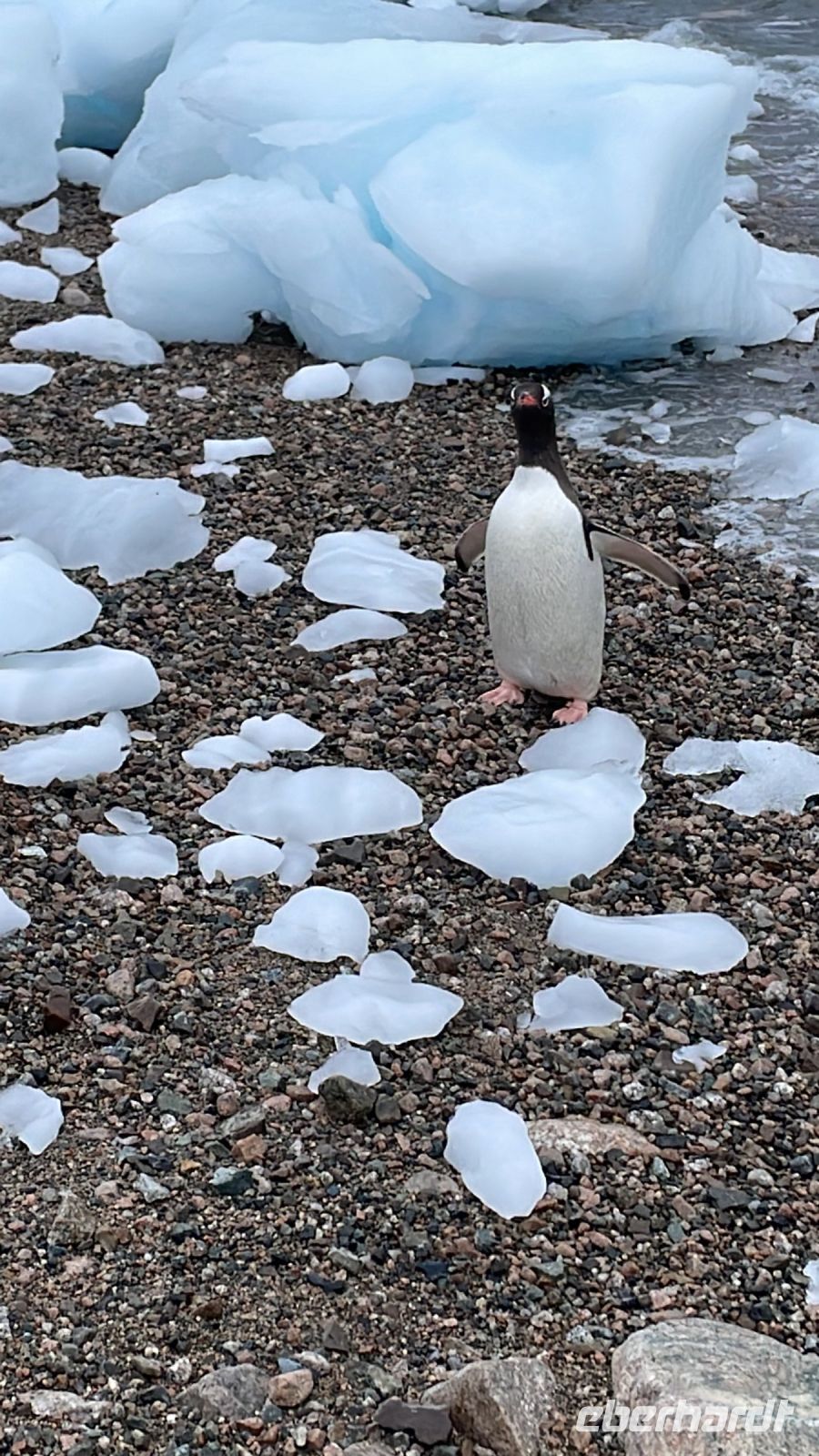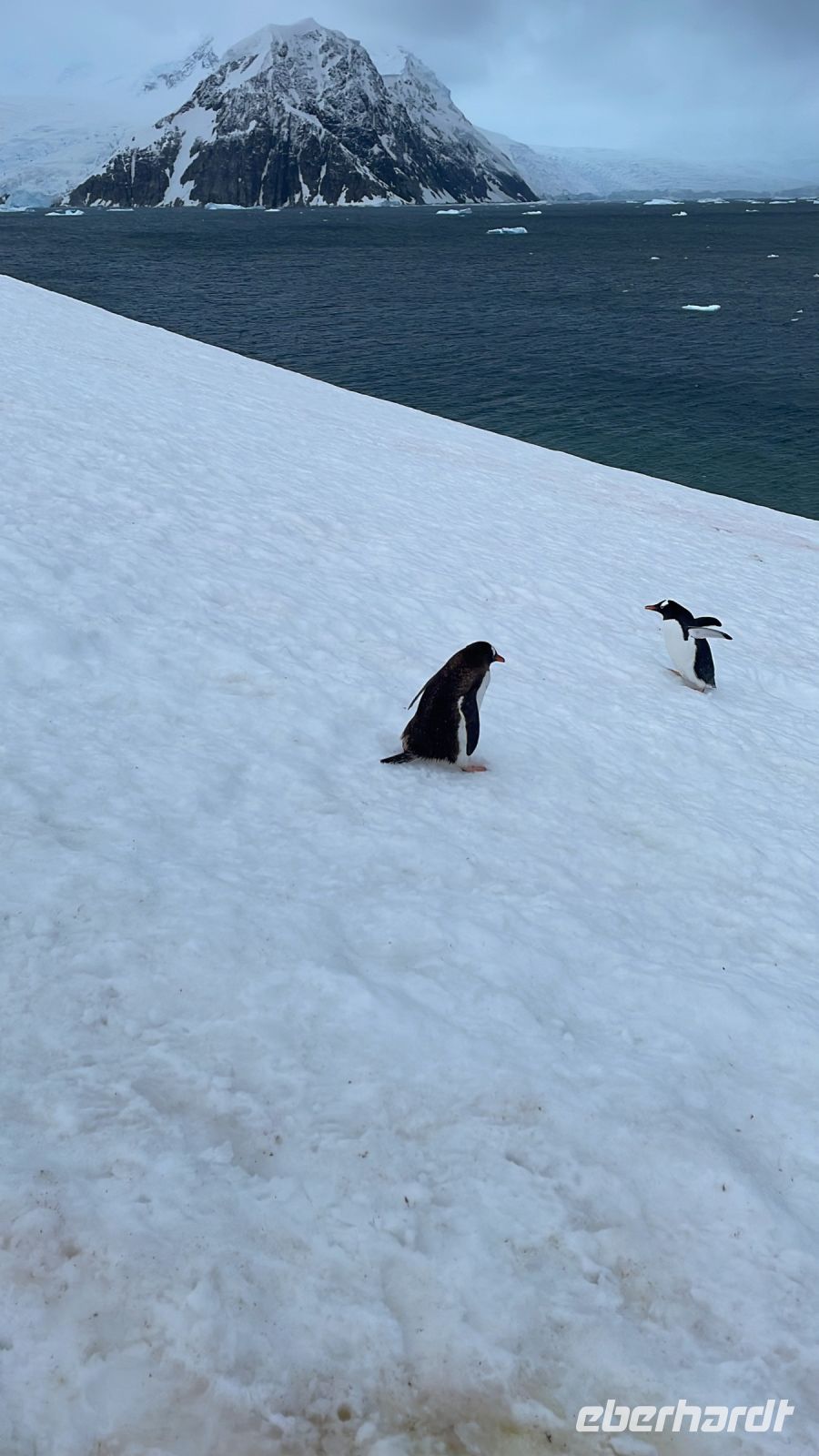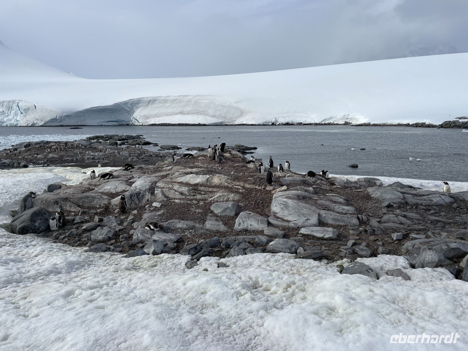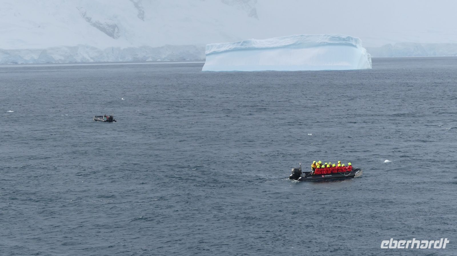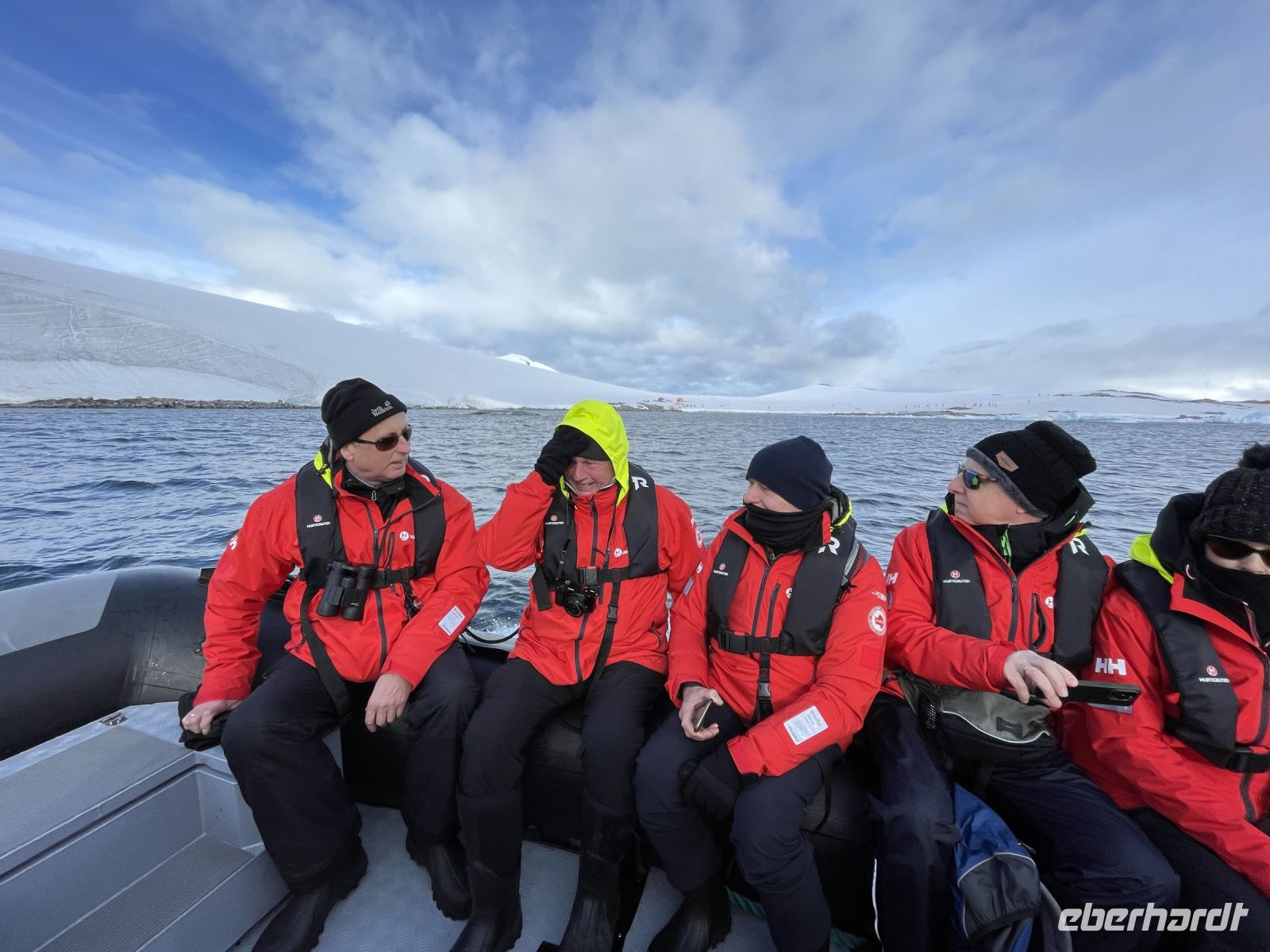 Für unseren neunten Tag steht nach dem Frühstück die eindrucksvolle Bootsfahrt zwischen Eisbergen und Eisschollen in der Skontorp Cove auf dem Programm. Wir sind etwa 40 Minuten unterwegs und sehen Eisberge, Eisschollen und die argentinische Forschungsstation Brown Station. Zudem sichten wir ein Filmteam mit einem Piano auf einer Eisscholle… wer weiß was hier gedreht wird. Bei den Bootsfahrten muss man sich besonders warm anziehen. Drei Kleidungsschichten und 2 Jacken, zudem Mütze, Schal und Handschuhe… denn der Wind zieht auf den längeren Bootsfahrten besonders kräftig. Da fühlen sich -2 Grad an wie -15 Grad. Nach der ausgiebigen Bootsfahrt mit Expeditionsleiterin Carina, geht es wieder zurück zum Schiff.