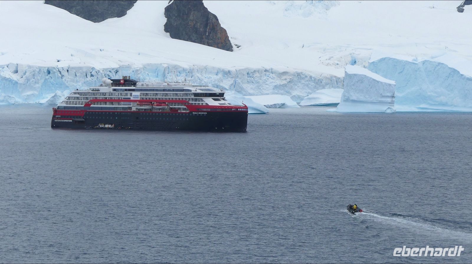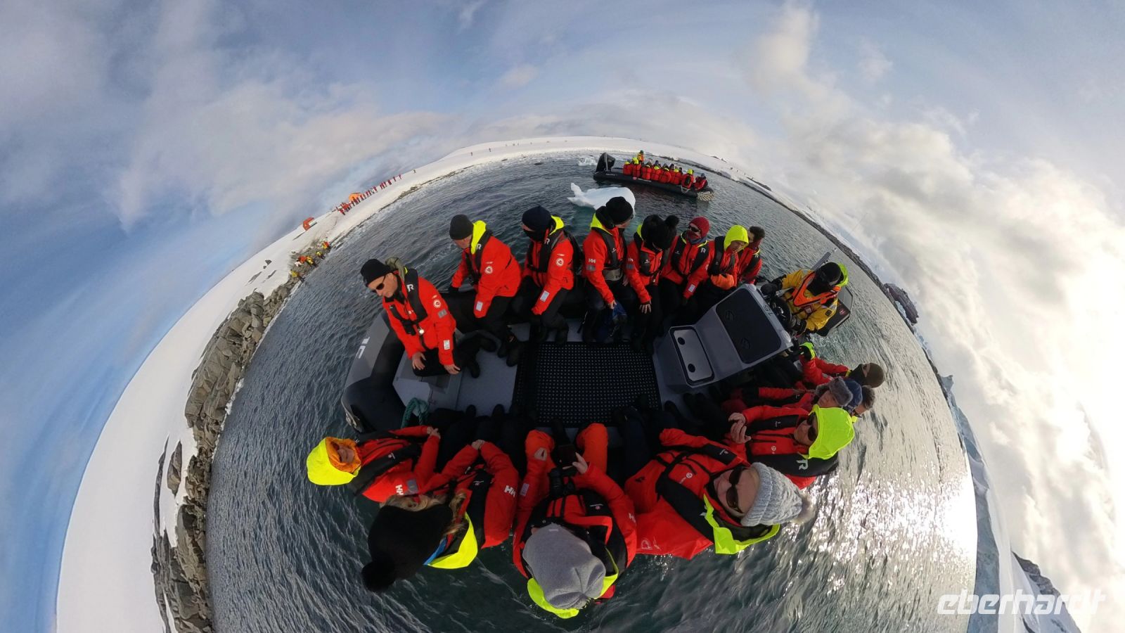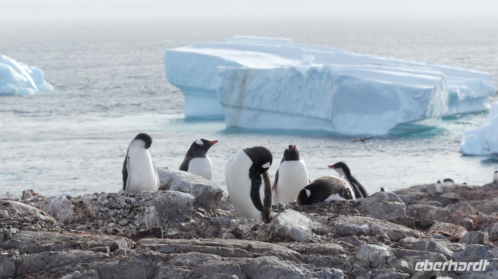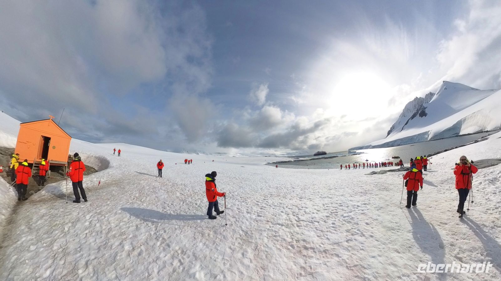 Für unseren neunten Tag steht nach dem Frühstück die eindrucksvolle Bootsfahrt zwischen Eisbergen und Eisschollen in der Skontorp Cove auf dem Programm. Wir sind etwa 40 Minuten unterwegs und sehen Eisberge, Eisschollen und die argentinische Forschungsstation Brown Station. Zudem sichten wir ein Filmteam mit einem Piano auf einer Eisscholle… wer weiß was hier gedreht wird. Bei den Bootsfahrten muss man sich besonders warm anziehen. Drei Kleidungsschichten und 2 Jacken, zudem Mütze, Schal und Handschuhe… denn der Wind zieht auf den längeren Bootsfahrten besonders kräftig. Da fühlen sich -2 Grad an wie -15 Grad. Nach der ausgiebigen Bootsfahrt mit Expeditionsleiterin Carina, geht es wieder zurück zum Schiff.