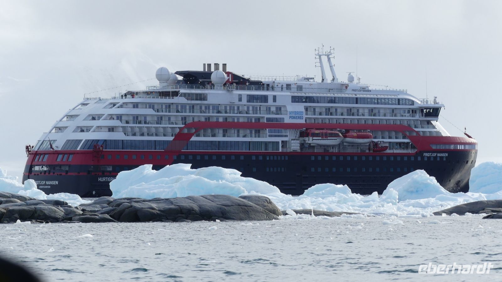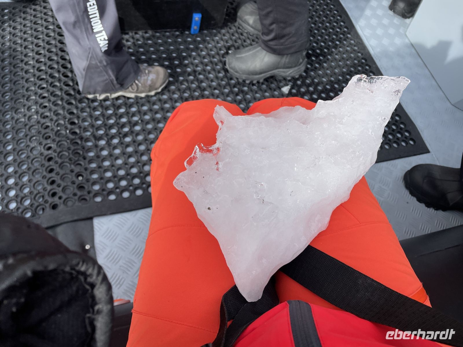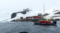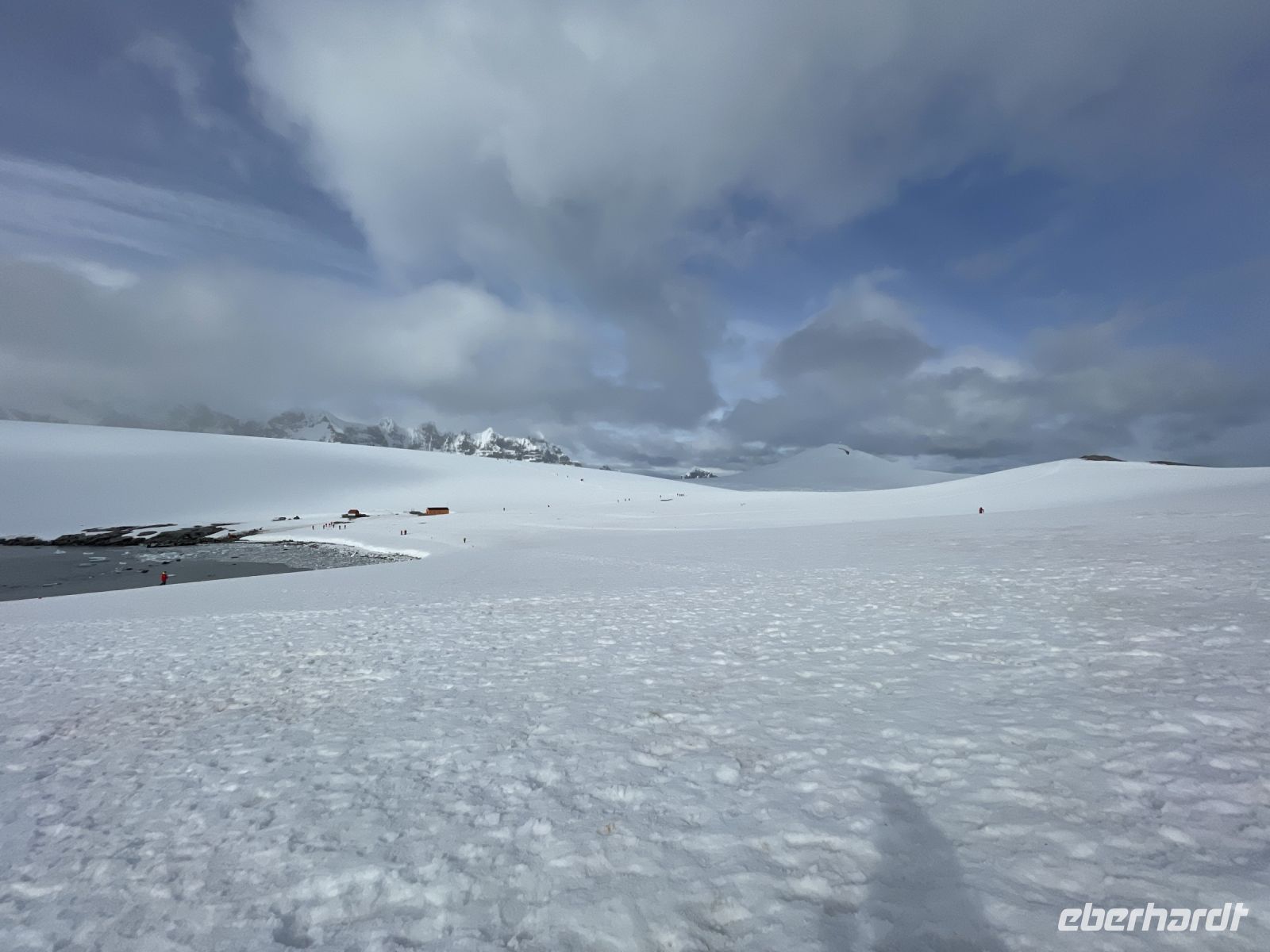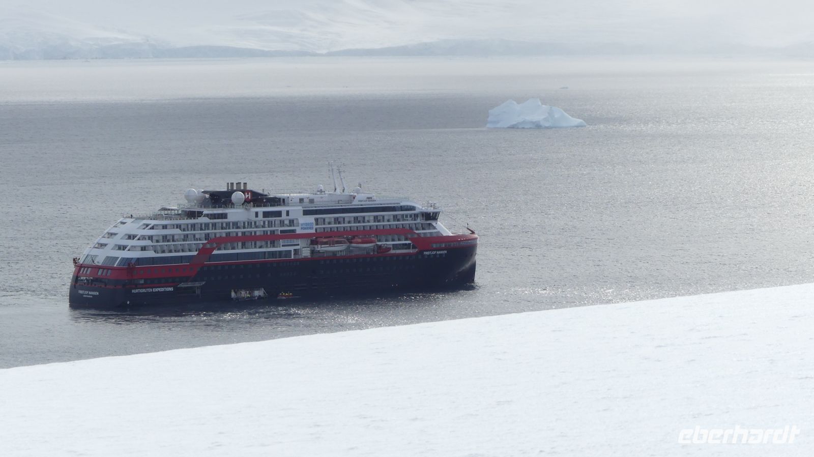 Für unseren neunten Tag steht nach dem Frühstück die eindrucksvolle Bootsfahrt zwischen Eisbergen und Eisschollen in der Skontorp Cove auf dem Programm. Wir sind etwa 40 Minuten unterwegs und sehen Eisberge, Eisschollen und die argentinische Forschungsstation Brown Station. Zudem sichten wir ein Filmteam mit einem Piano auf einer Eisscholle… wer weiß was hier gedreht wird. Bei den Bootsfahrten muss man sich besonders warm anziehen. Drei Kleidungsschichten und 2 Jacken, zudem Mütze, Schal und Handschuhe… denn der Wind zieht auf den längeren Bootsfahrten besonders kräftig. Da fühlen sich -2 Grad an wie -15 Grad. Nach der ausgiebigen Bootsfahrt mit Expeditionsleiterin Carina, geht es wieder zurück zum Schiff.