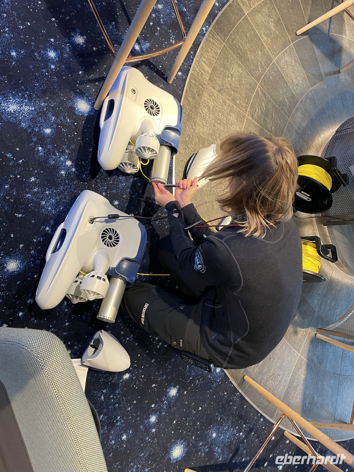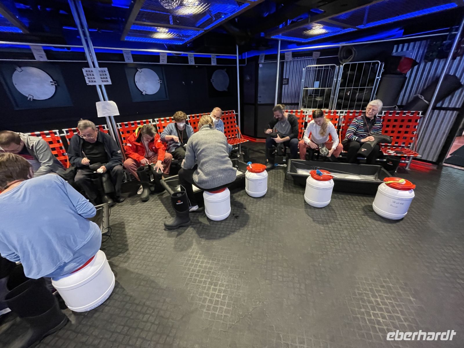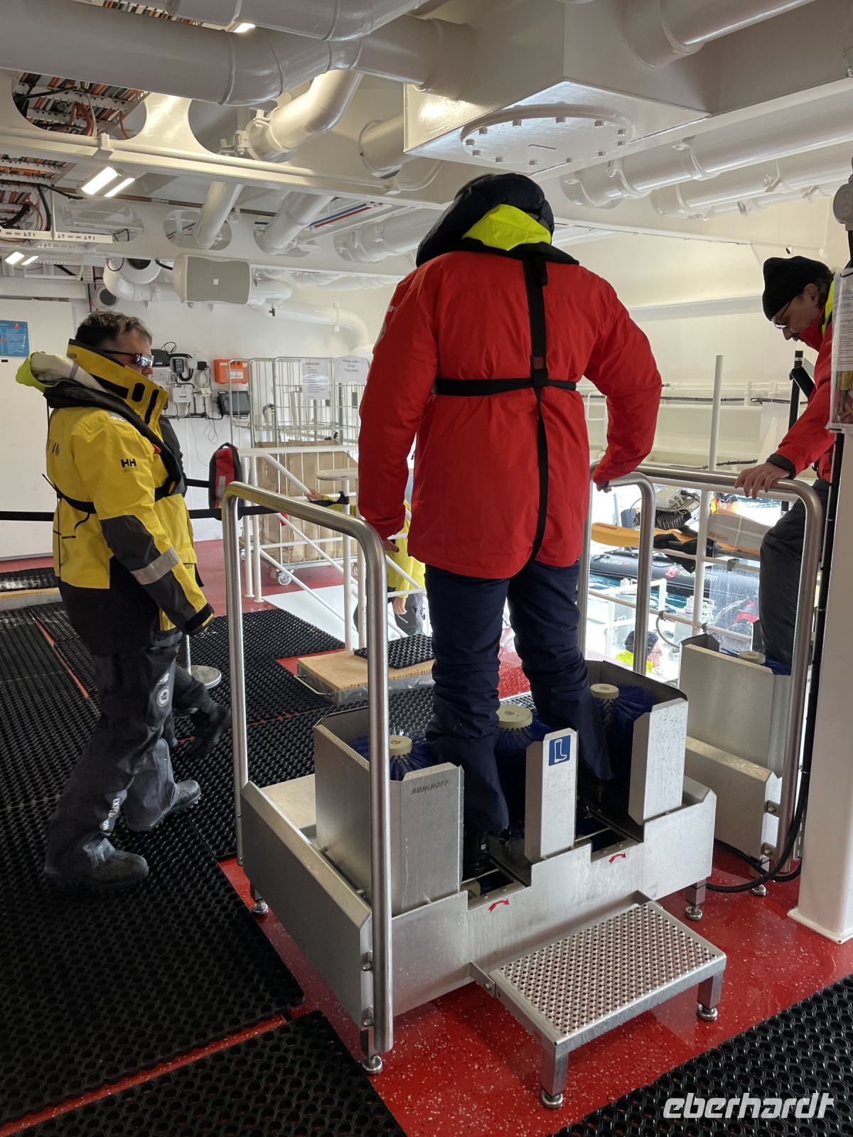 Am Montag erhalten wir nach dem Frühstück unsere Gummistiefel und unsere Gruppenabzeichen, die wir auf die Jacke drauf heften. Wir sind in die Gruppe der Weddel Seals eingeteilt und werden in Zukunft in unseren Gruppen für die jeweiligen Landgänge oder anderen Aktivitäten aufgerufen.