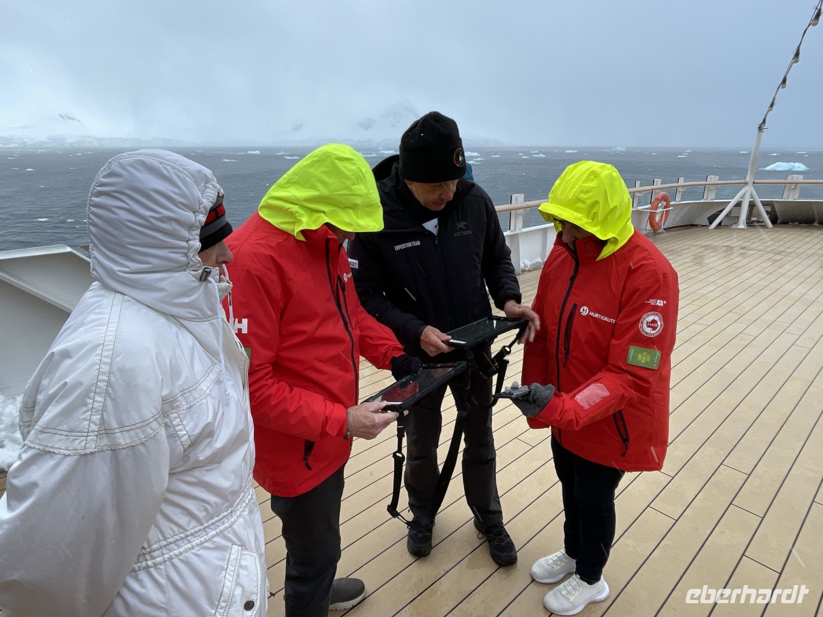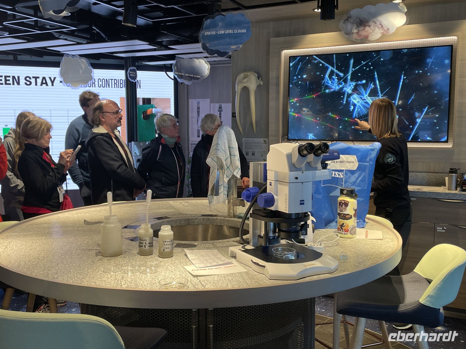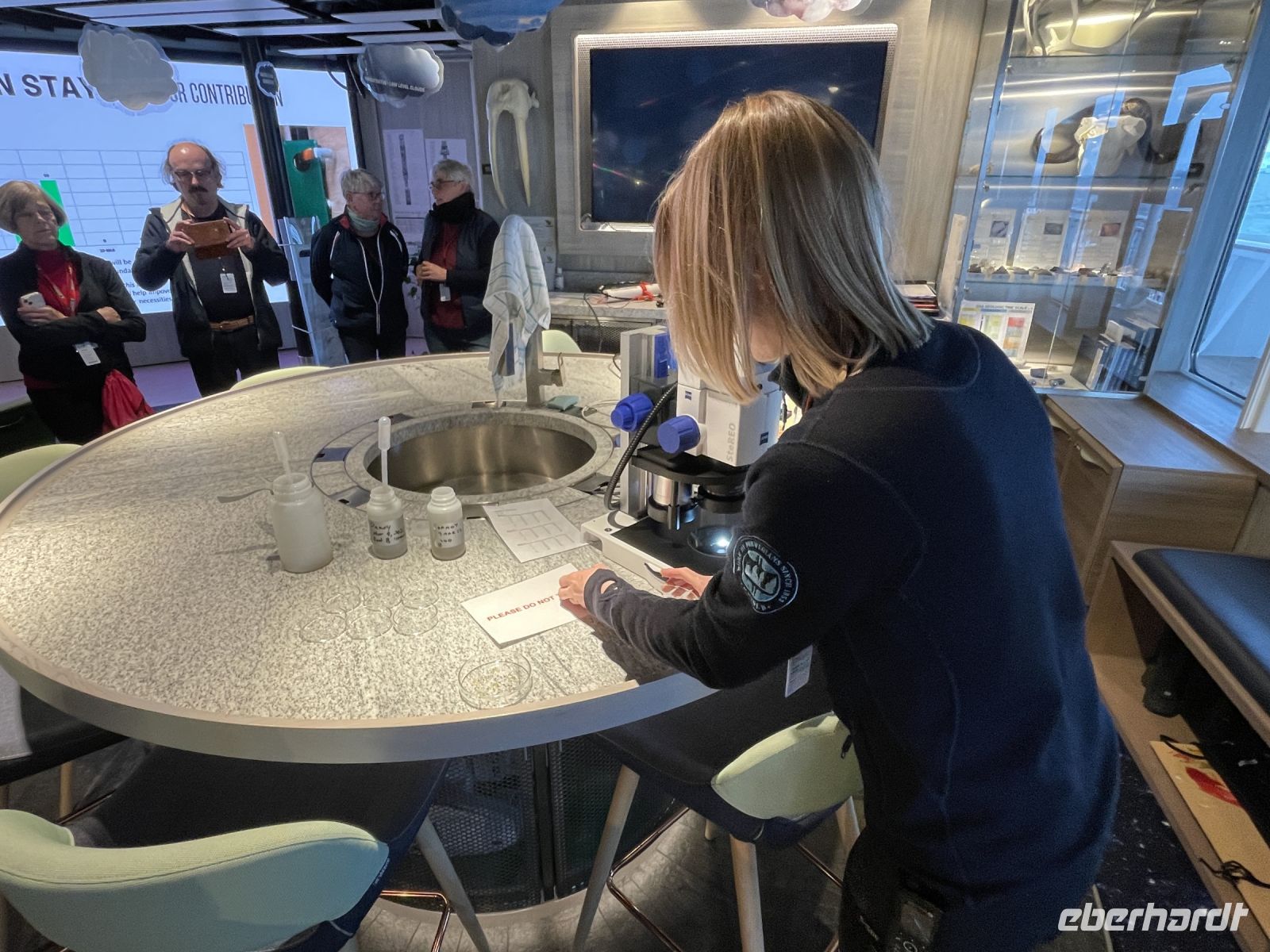 Auf Danco Island sehen wir viele Eselspinguine und haben Zeit um Fotos zu knipsen und die Insel über einen Weg bergauf zu erkunden. Überall sind wie immer kleine Fahnen abgesteckt, die uns den Weg markieren. Zudem steht aller 100m ein Mitarbeiter vom Exp.Team bzw. ein Wissenschaftler, der gerne Auskunft über die Pinguine gibt. Oben angekommen haben wir eine tolle Aussicht über die Bucht und die Pinguinkolonie. Einige Eselspinguine halten sich natürlich nicht an die abgesteckten Fahnen und kommen uns recht nah. Wir bleiben in dem Moment stehen und lassen den Pinguinen natürlich den Vortritt. Ein wunderschönes Erlebnis! Nach über einer Stunde an Land geht es mit den Booten wieder zurück aufs Schiff. Laut der IAATO Vorschrift, dürfen nur maximal 100 Gäste zur gleichen Zeit an Land sein. Nach dem aufregenden ersten Landgang, haben alle etwas Freizeit um die Erlebnisse zu verarbeiten. Zum Abendessen treffen wir uns heute im Lindstrøm Restaurant und verbringen den restlichen Abend im Science Center, wo wir neue Informationen zum morgigen Landgang erhalten. Anschließend widmen sich einige von uns noch der Wissenschaft und untersuchen gesammelte Wasserproben unter dem Mikroskop.