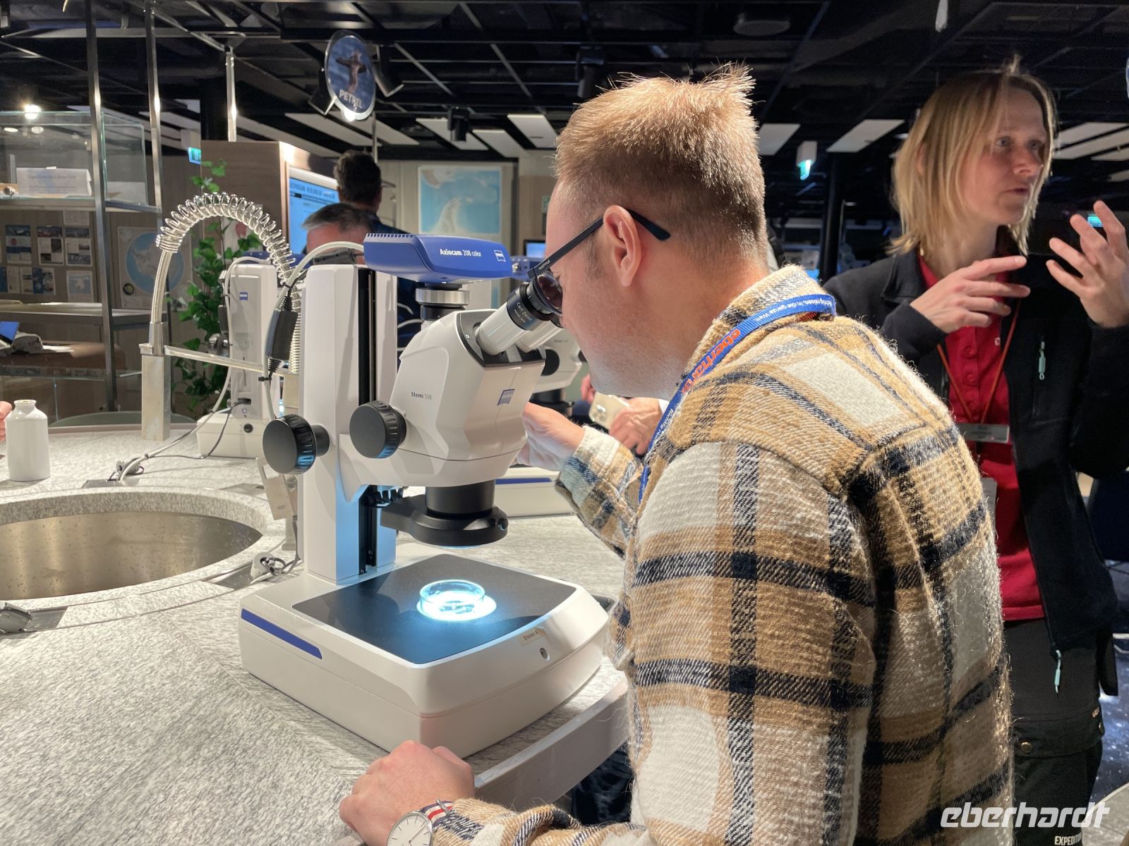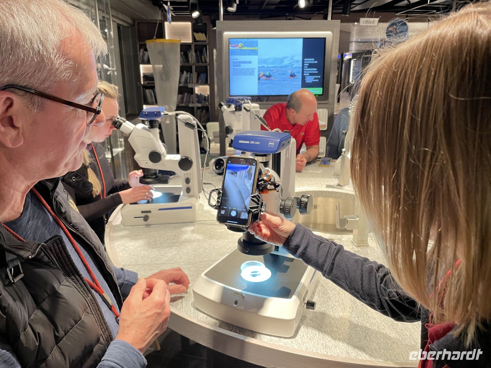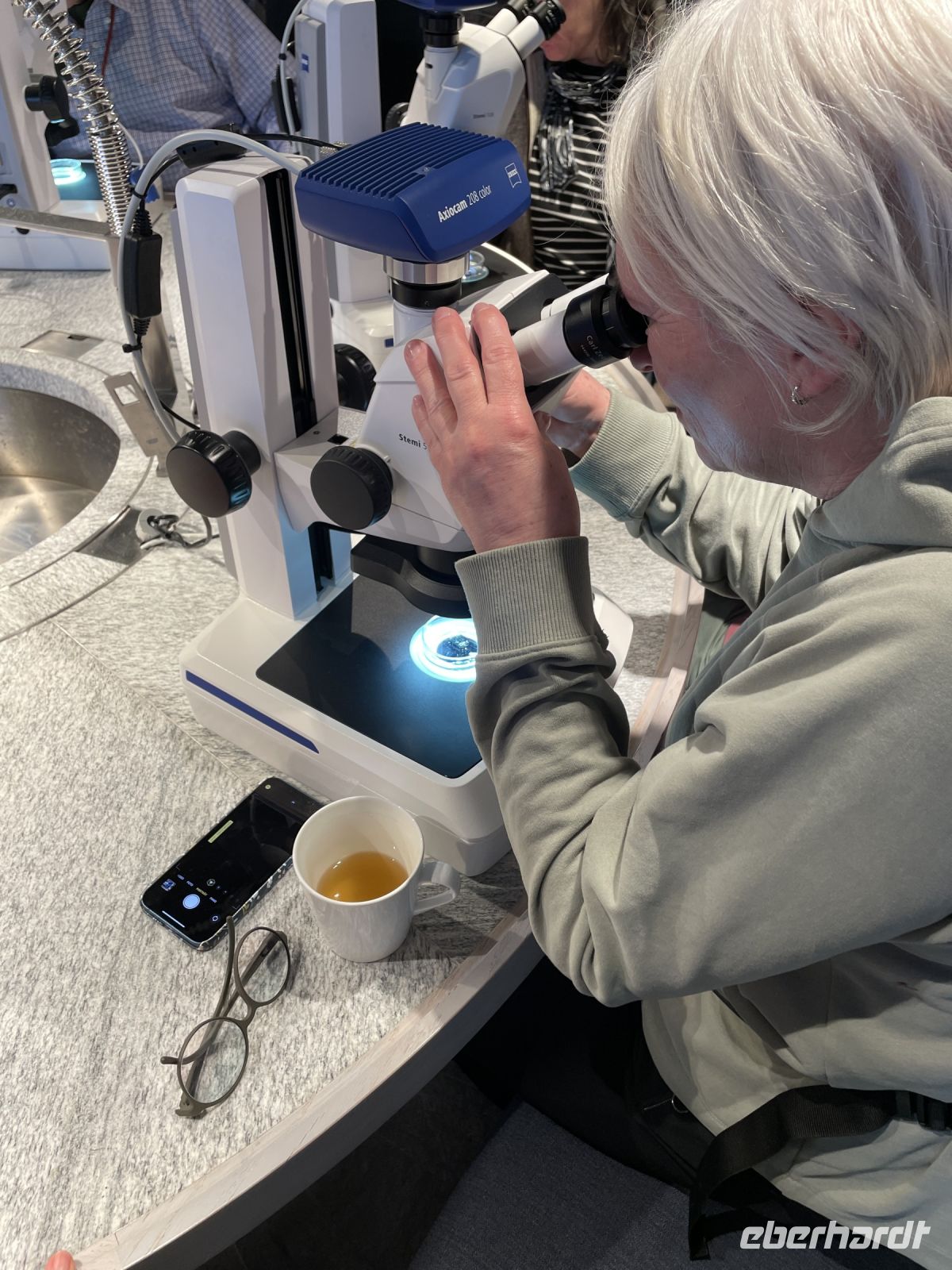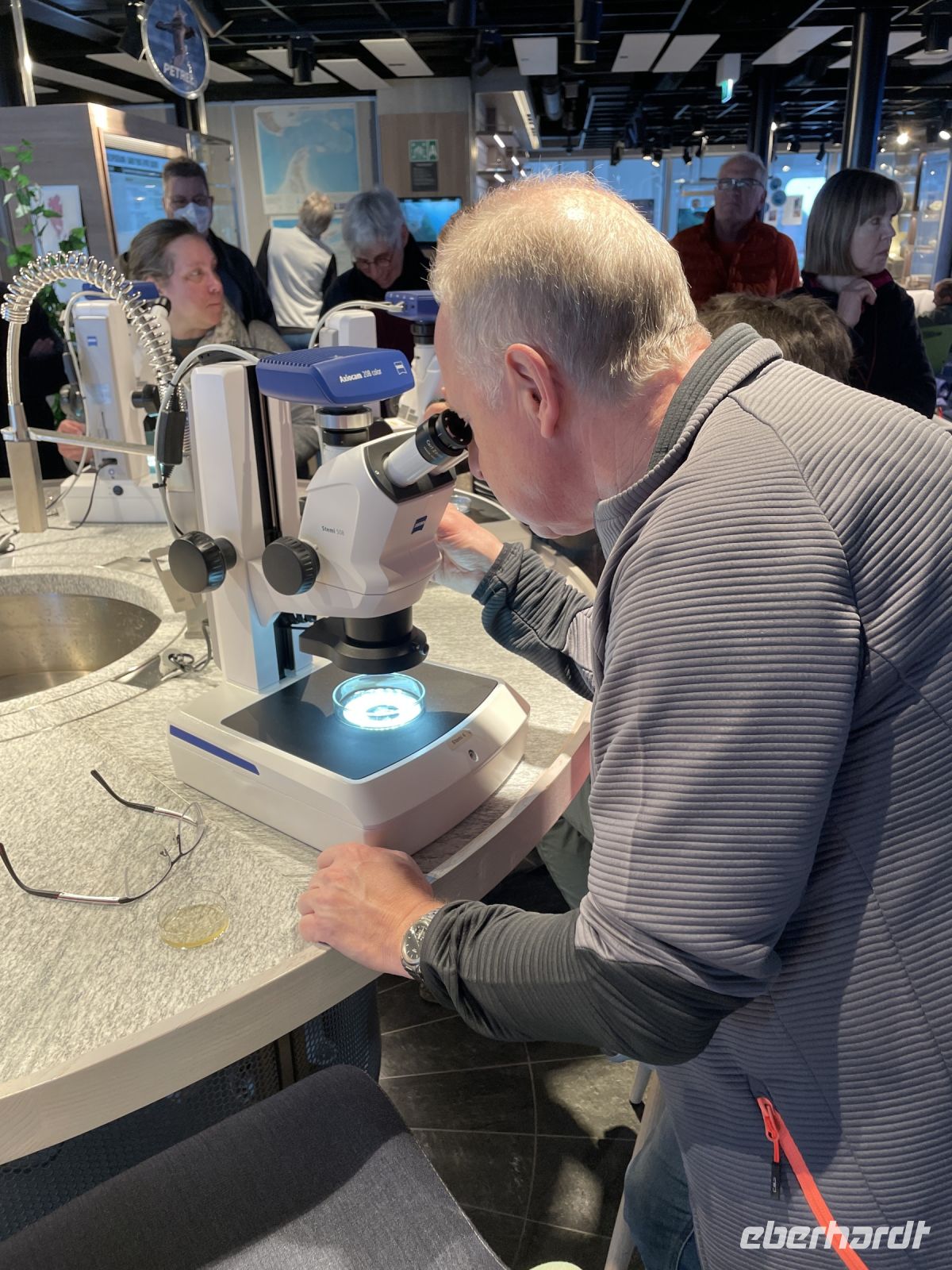 Auf Danco Island sehen wir viele Eselspinguine und haben Zeit um Fotos zu knipsen und die Insel über einen Weg bergauf zu erkunden. Überall sind wie immer kleine Fahnen abgesteckt, die uns den Weg markieren. Zudem steht aller 100m ein Mitarbeiter vom Exp.Team bzw. ein Wissenschaftler, der gerne Auskunft über die Pinguine gibt. Oben angekommen haben wir eine tolle Aussicht über die Bucht und die Pinguinkolonie. Einige Eselspinguine halten sich natürlich nicht an die abgesteckten Fahnen und kommen uns recht nah. Wir bleiben in dem Moment stehen und lassen den Pinguinen natürlich den Vortritt. Ein wunderschönes Erlebnis! Nach über einer Stunde an Land geht es mit den Booten wieder zurück aufs Schiff. Laut der IAATO Vorschrift, dürfen nur maximal 100 Gäste zur gleichen Zeit an Land sein. Nach dem aufregenden ersten Landgang, haben alle etwas Freizeit um die Erlebnisse zu verarbeiten. Zum Abendessen treffen wir uns heute im Lindstrøm Restaurant und verbringen den restlichen Abend im Science Center, wo wir neue Informationen zum morgigen Landgang erhalten. Anschließend widmen sich einige von uns noch der Wissenschaft und untersuchen gesammelte Wasserproben unter dem Mikroskop.