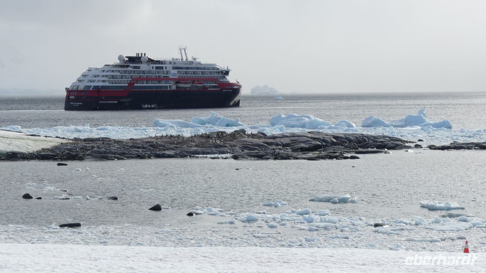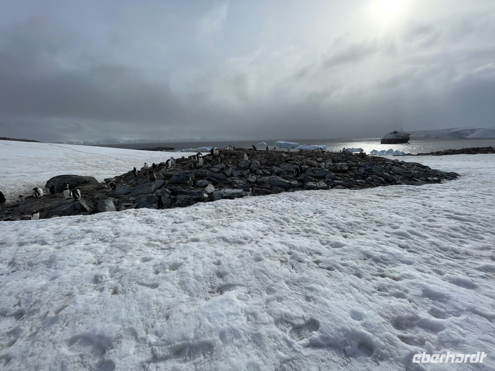 Bei der heutigen Anlandung scheint des Öfteren auch die Sonne, zudem ist diese Anlandungsstelle landschaftlich mit die schönste der Reise. Alle sind wieder begeistert und nach etwa 1,5h an Land, steigen wir wieder auf die Boote, um zurück zum Schiff zu fahren und treffen uns im Aune Restaurant wieder zum Mittagessen. Für Nachmittag war eigentlich noch eine Bootsfahrt in der Bucht von Port Lockroy geplant, die aber wegen starkem Wind leider ausfällt. Wir hatten Vormittag einfach Glück mit dem Wetter und sind froh, dass unsere Gruppe so früh dran war mit der Anlandung. Nachmittag ist also etwas Freizeit und den Abend lassen wir nach dem Essen und Infomeeting gemütlich in der Explorer Lounge auf Deck 10 ausklingen.