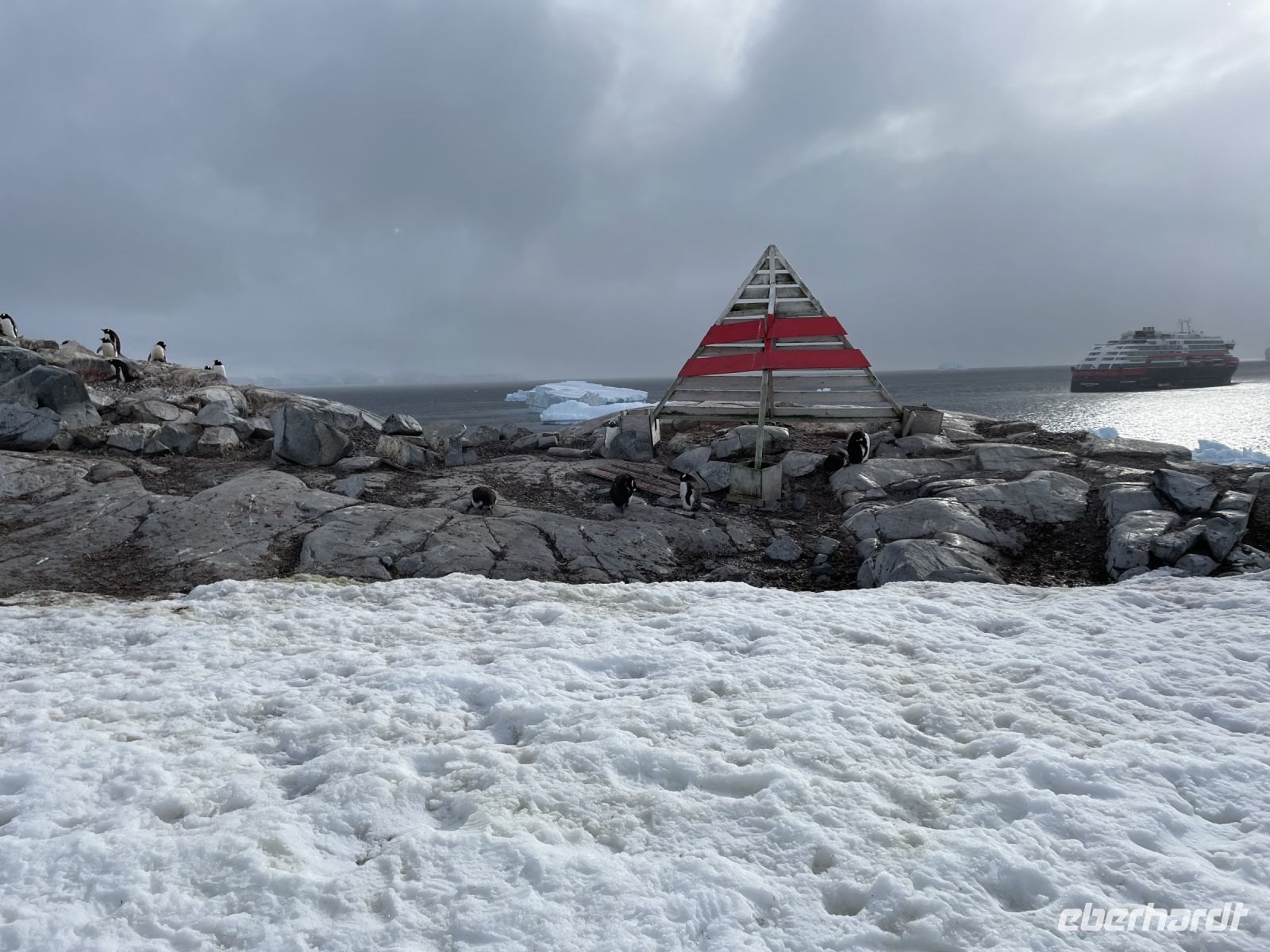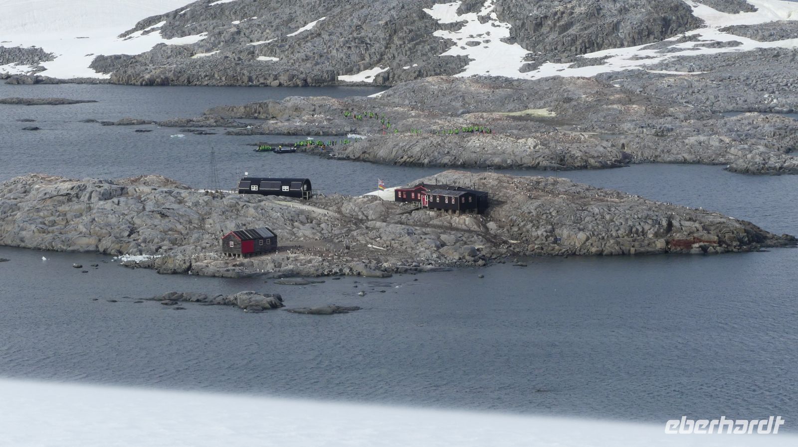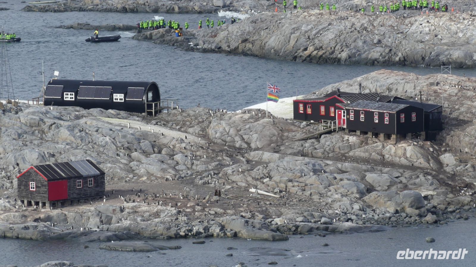 Am Donnerstag landen wir nach einem ausgiebigen Frühstück mit dem Boot am Damoy Point auf Anvers Island an. Wir sehen unter anderem eine argentinische und britische Schutzhütte die von 1970-1992 genutzt wurde, um Waren einzulagern und Forscher unterzubringen. Danach sehen wir eine weitere Eselspinguin-Kolonie und wer will, spaziert mit mir noch auf einen Berg, von dem aus wir die Forschungsstation Port Lockroy und ein anderes Expeditionsschiff sehen. Port Lockroy haben die Briten gegen Ende des zweiten Weltkriegs als Basis erbaut und dort befindet sich auch das kleinste Postamt der Welt. Zur Zeit werden Postbeamte gesucht die sich dort um die Post der Touristen zu kümmern und ganz nebenbei die Population der Pinguine zu zählen.