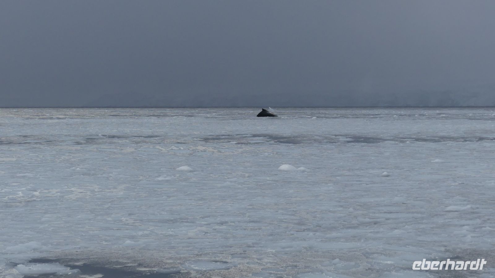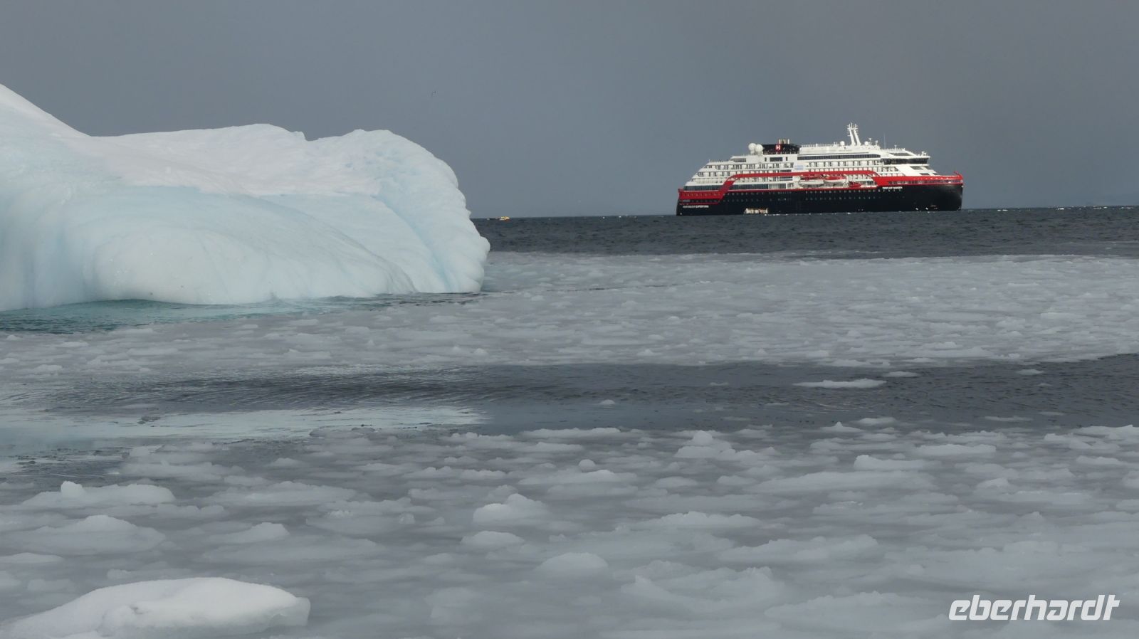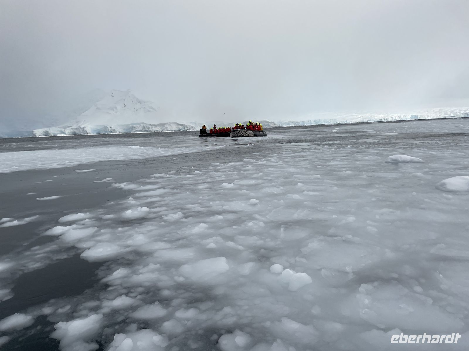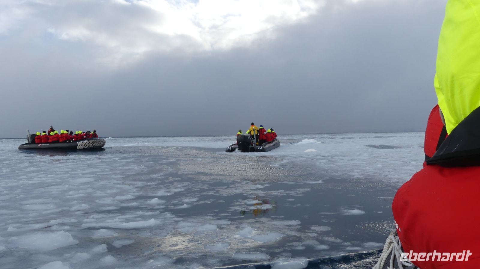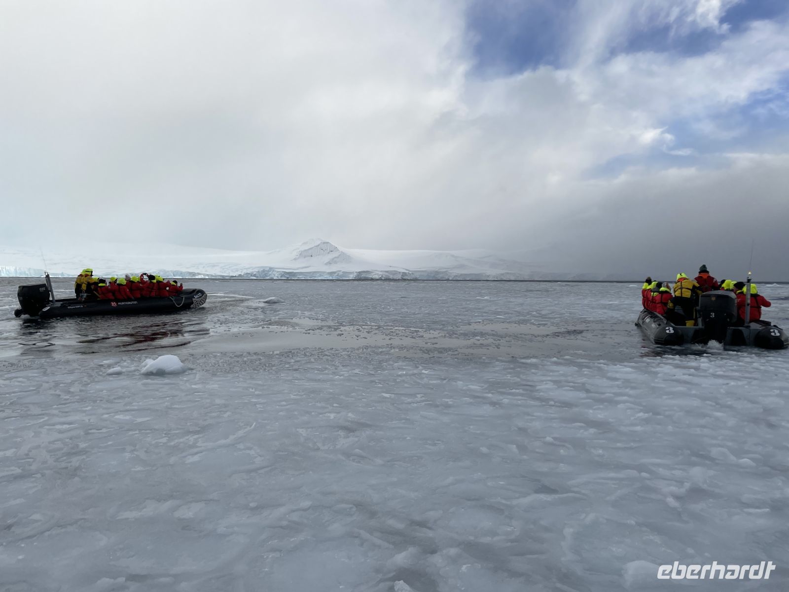 Unser elfter Reisetag beginnt mit der Ankunft in der Fournier Bay. Der Vormittag ist mit Ausflügen mit den Wissenschaftsbooten und einer Bootstour gefüllt. Wir fahren etwa 30 Minuten auf das Eismeer hinaus und sehen von Weitem einige Buckelwale und kleinere Eisberge. Besonders eindrucksvoll ist heute das gefrorene Meereis, welches erst bei ca. -3 bis -5 Grad gefriert. Milchartig und flockig sieht das teilweise gefrorene Salzwasser aus. Ein tolles Naturschauspiel.