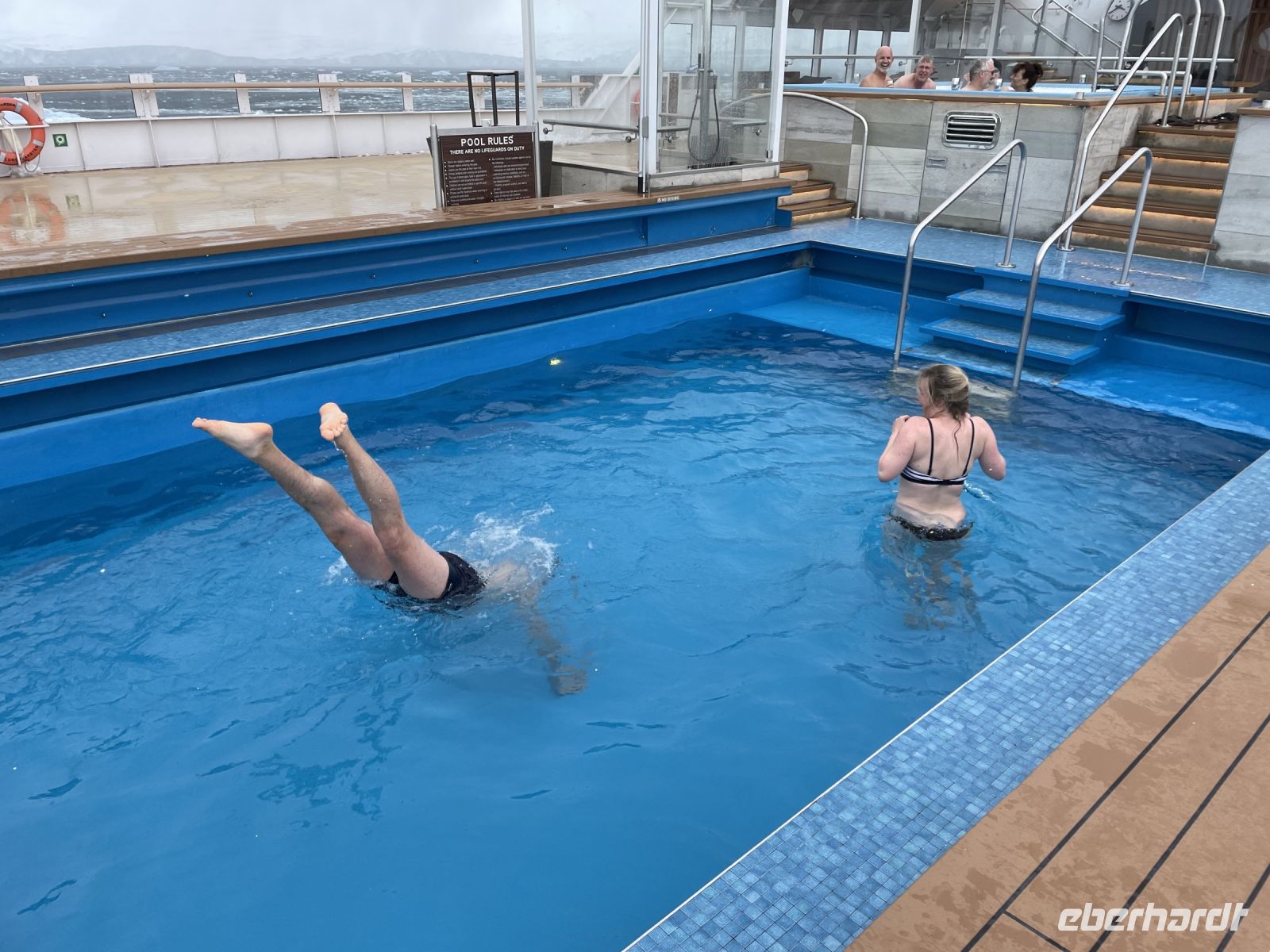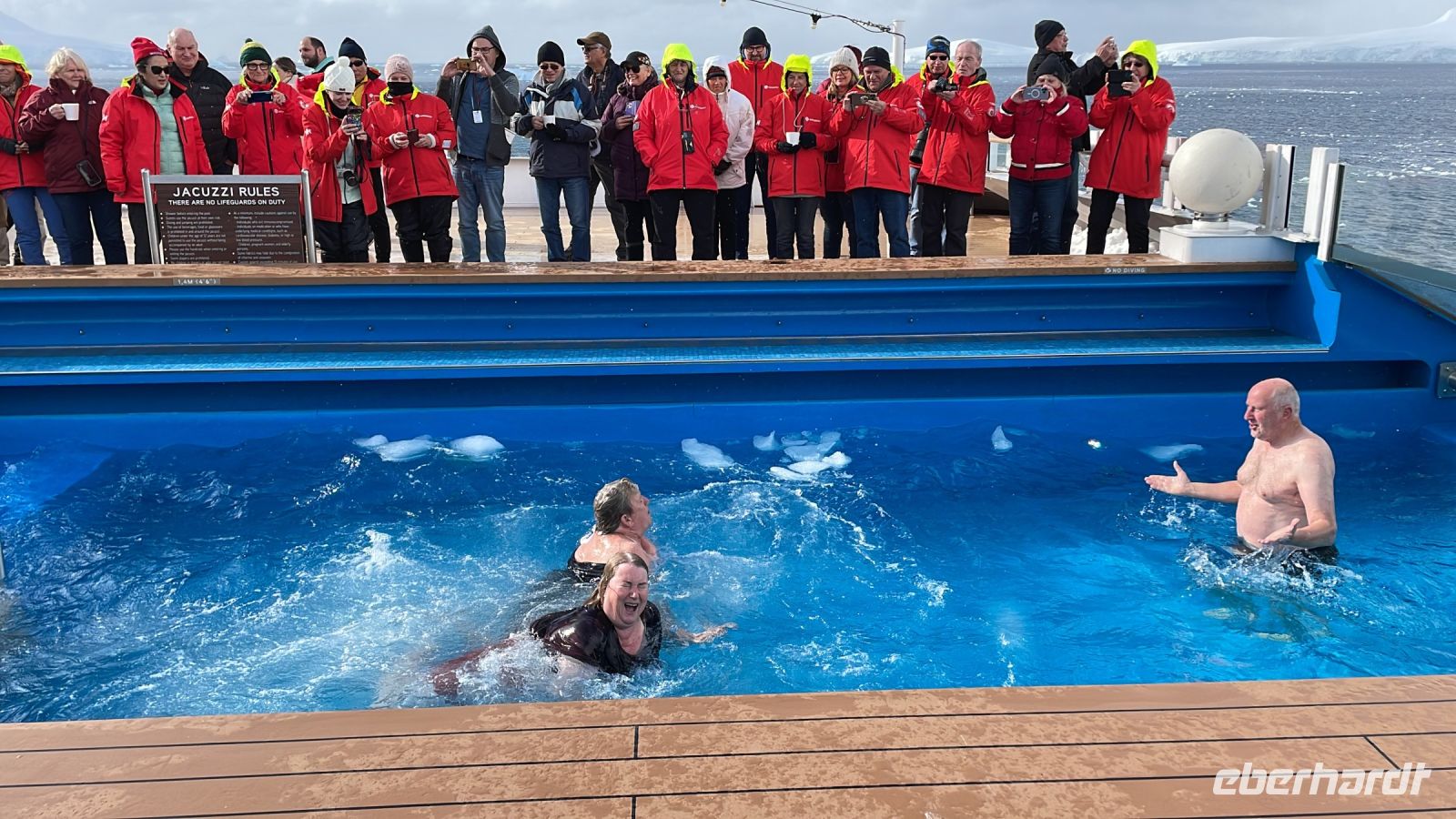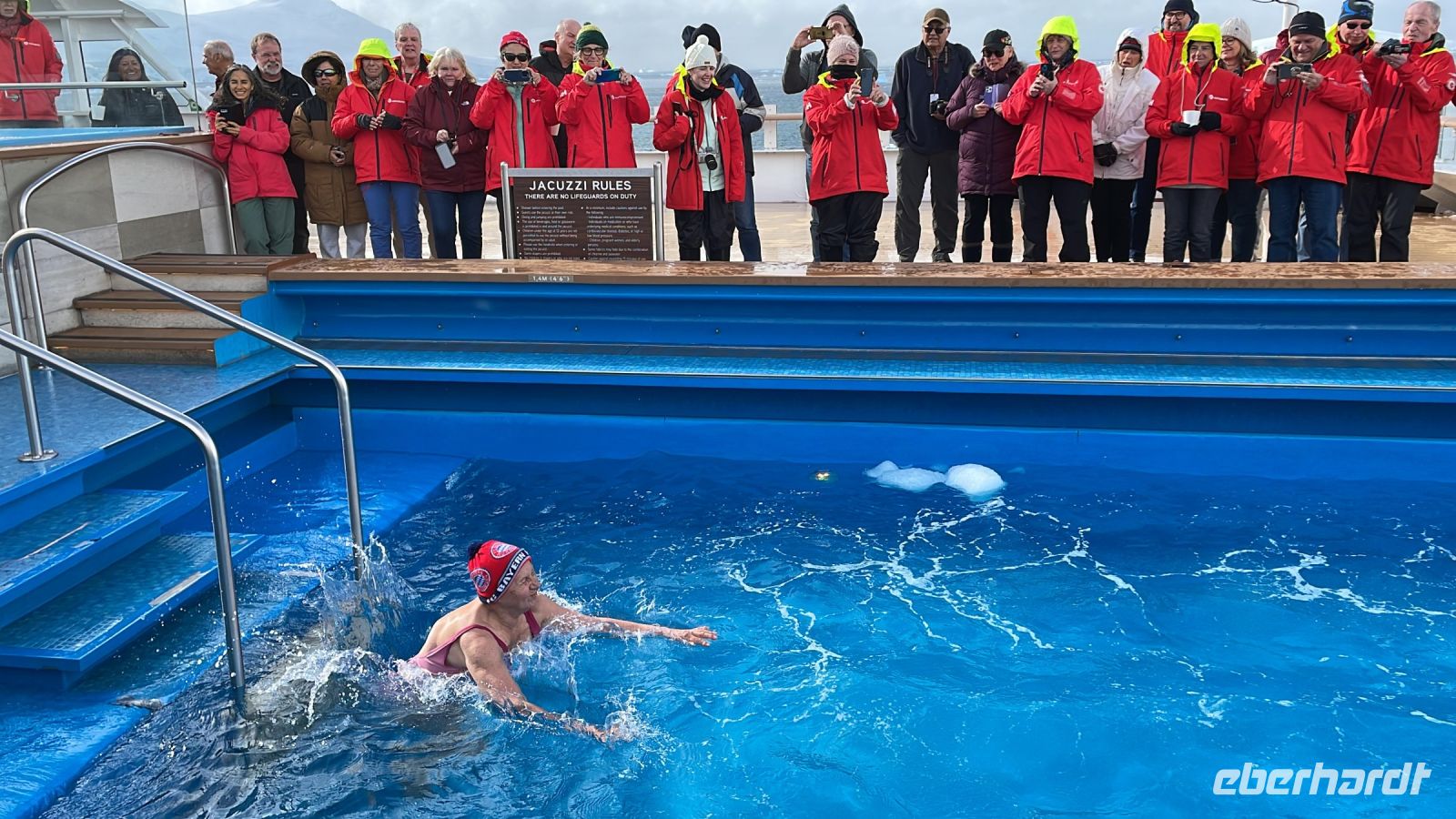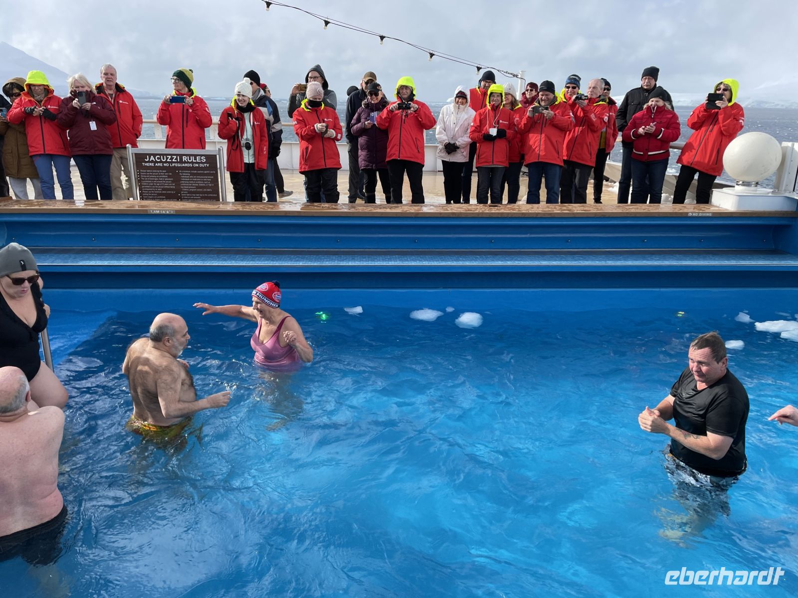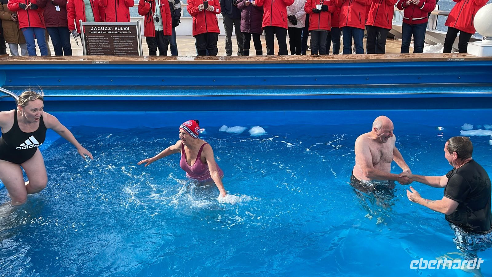 Nach dem Mittagessen treffen wir uns für einen Vortrag über Eis und Klimawandel im Science Center wieder. Am späten Nachmittag ein weiterer mit dem Titel: Antarktisches Meereis – Einblicke in das größte geophysikalische Phänomen der Welt. Anschließend können wir außerdem auf Deck 10 am Eisbaden im kaltem Salzwasserpool teilnehmen und dazu einen Glühwein trinken. 3 mutige unserer Gruppe trauen sich freiwillig. Zum Abendessen treffen wir uns im Lindstrøm Restaurant wieder und erhalten Informationen über die Ausschiffung am letzten Tag.