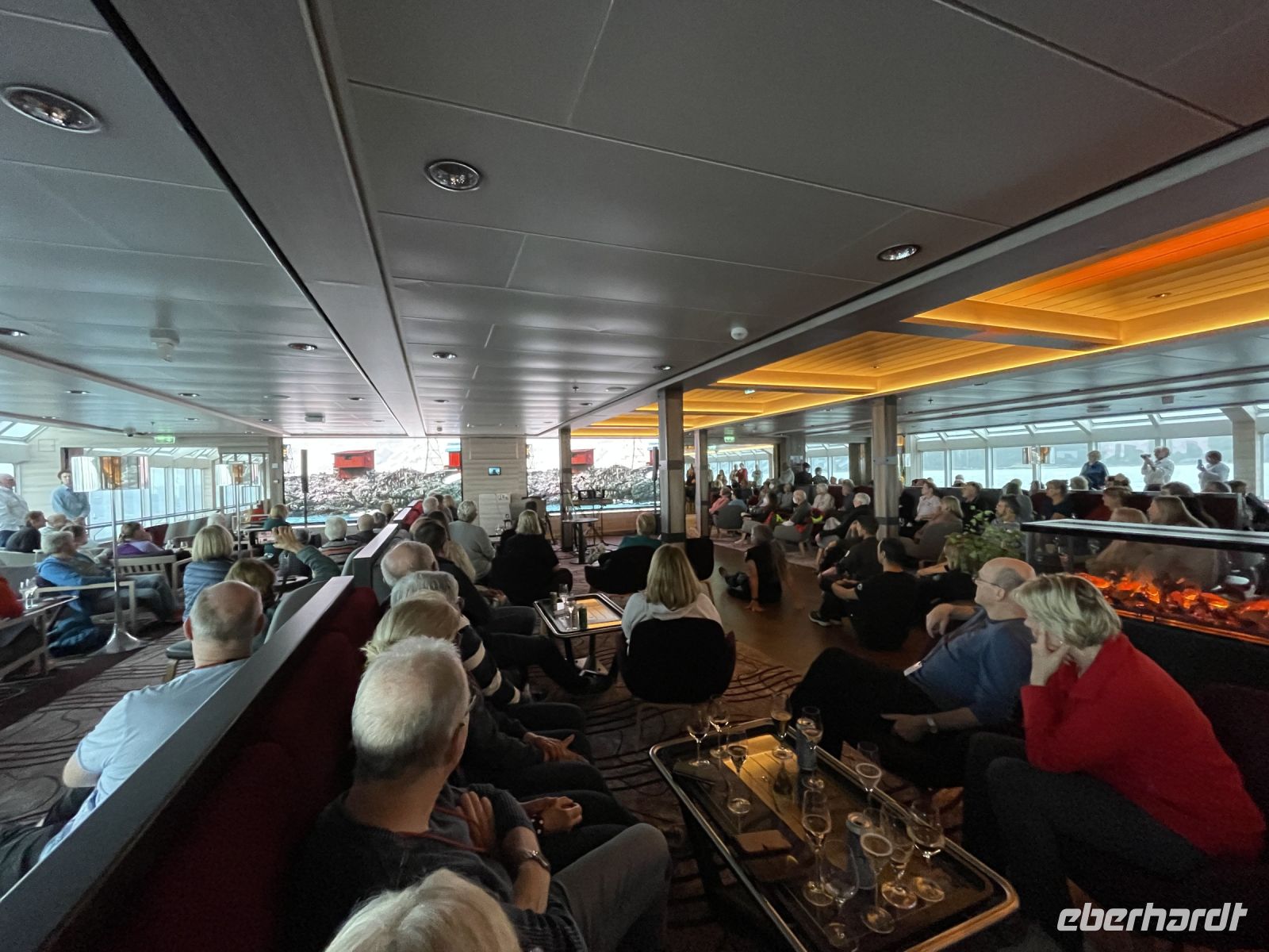 Später genießen wir unser Mittagessen im Fredheim-Restaurant, gefolgt von einem spannenden Vortrag über Shackleton und seine Antarktis Expeditionsreisen. Nach dem Abendessen im Aune Restaurant erhalten wir wieder einige Informationen für den nächsten Tag und sitzen gemütlich auf Deck 10 zusammen.