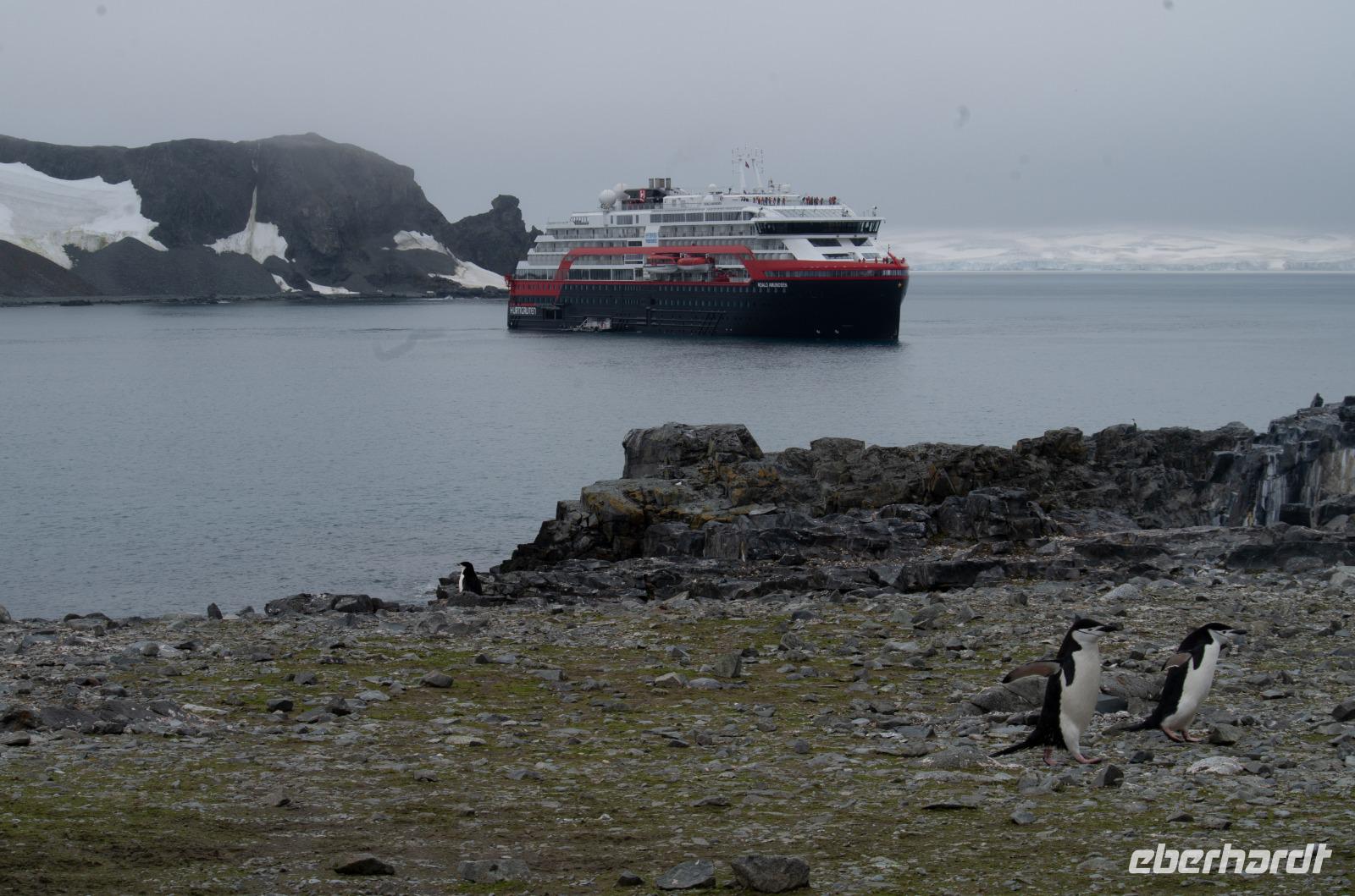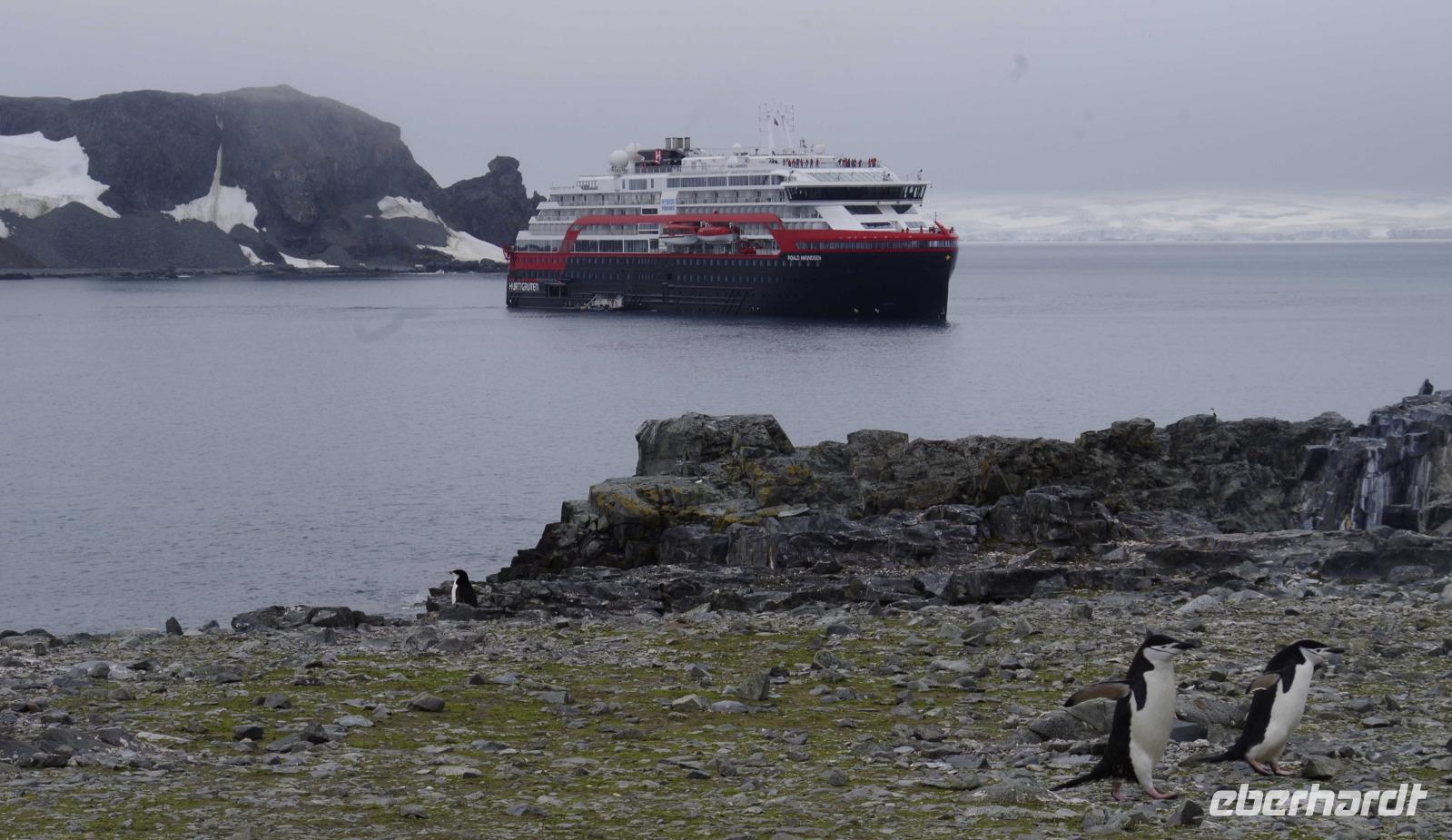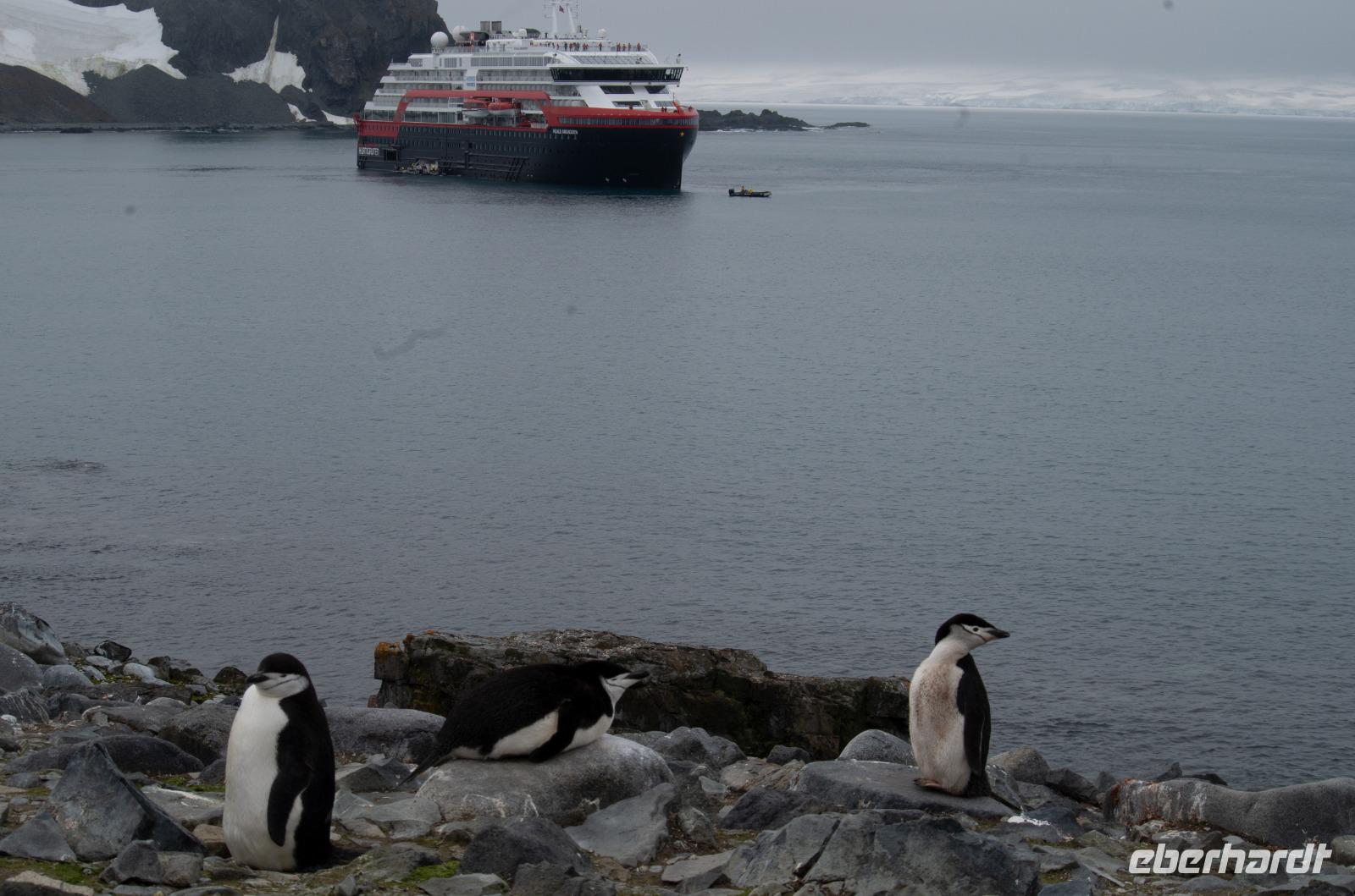 Unser heutiger Stop: Half Moon Island. Bevor wir jedoch die kleine Insel besichtigen können, erhalten wir am Vormittag eine Kajakeinweisung für die, die sich für eine kostenpflichtige Kajaktour eingeschrieben haben. Am Nachmittag bringen uns kleine Boote nach 5 Minuten Fahrt schließlich auf Half Moon Island. Hier haben wir eine Stunde Zeit, um uns individuell die spektakuläre Landschaft mit Gletschern und Bergen anzusehen. Das Highlight: die Esel- und Zügel-Pinguine, die sich bis auf wenige Zentimetern den Gästen nähern. Die Wege sind mit Fahnen und Kegeln abgesteckt, damit wir den Pinguinen nicht zu nahekommen. Doch daran halten sich natürlich die kleinen Tierchen nicht... manchmal laufen sie kreuz und quer und uns direkt vor die Füße. Es einfach goldig in mitten tausender Pinguine zu stehen. WOW!Ein Reisegast unserer Gruppe wagt sich sogar ins kühle Nass, denn Hurtigruten hat zum Polarbaden geladen - dem südlichsten Beach Club der Welt sozusagen. Das ganze wird von einem Arzt betreut und einige Pinguine schauen sogar ganz gespannt umher. :-DZurück zum Schiff geht es wieder mit den Schlauchbooten.Bei einem gemeinsamen Abendessen haben wir Zeit den Tag Revue passieren zu lassen. Alle Gäste haben tolle Foto- und Bildaufnahmen gemacht - so kann es weitergehen.