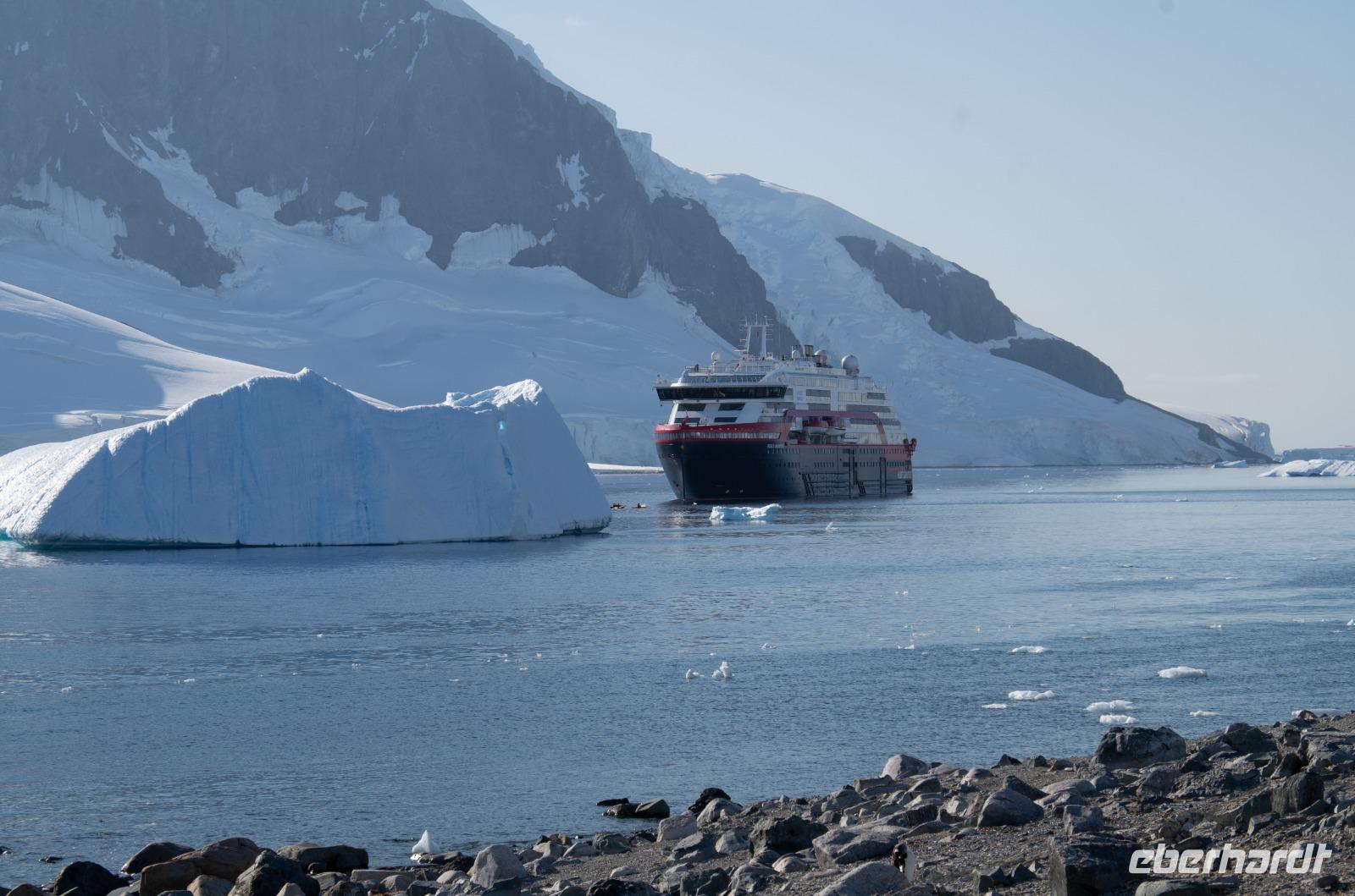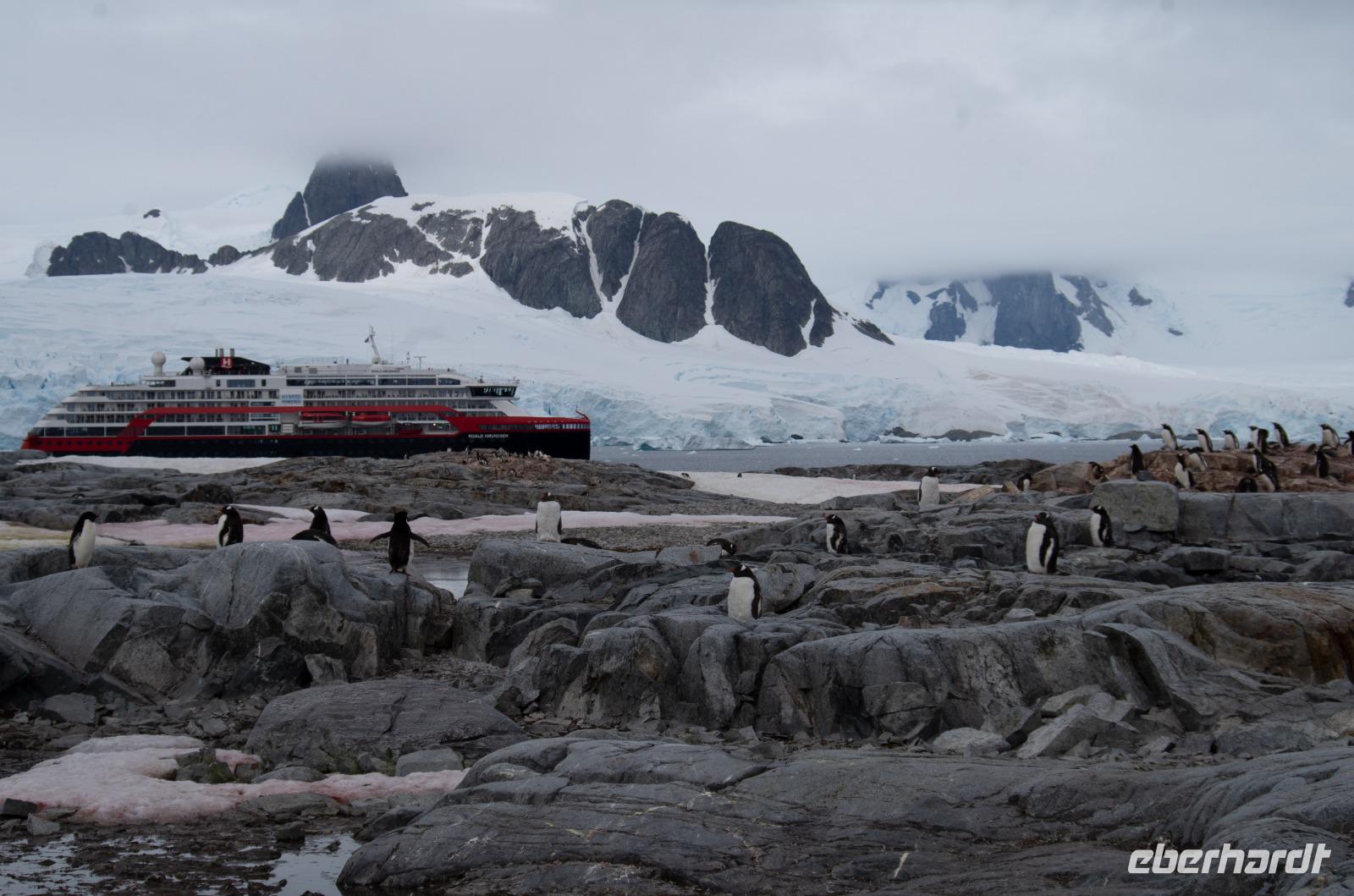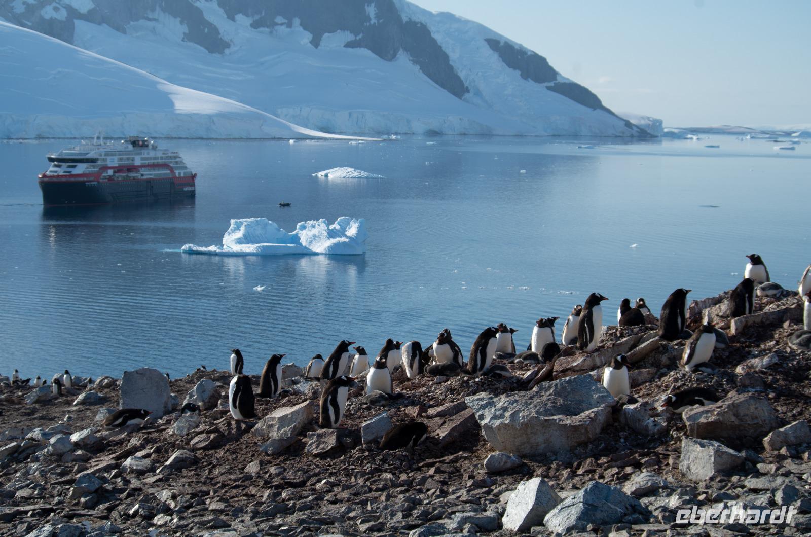 Unser heutiger Stop: Half Moon Island. Bevor wir jedoch die kleine Insel besichtigen können, erhalten wir am Vormittag eine Kajakeinweisung für die, die sich für eine kostenpflichtige Kajaktour eingeschrieben haben. Am Nachmittag bringen uns kleine Boote nach 5 Minuten Fahrt schließlich auf Half Moon Island. Hier haben wir eine Stunde Zeit, um uns individuell die spektakuläre Landschaft mit Gletschern und Bergen anzusehen. Das Highlight: die Esel- und Zügel-Pinguine, die sich bis auf wenige Zentimetern den Gästen nähern. Die Wege sind mit Fahnen und Kegeln abgesteckt, damit wir den Pinguinen nicht zu nahekommen. Doch daran halten sich natürlich die kleinen Tierchen nicht... manchmal laufen sie kreuz und quer und uns direkt vor die Füße. Es einfach goldig in mitten tausender Pinguine zu stehen. WOW!Ein Reisegast unserer Gruppe wagt sich sogar ins kühle Nass, denn Hurtigruten hat zum Polarbaden geladen - dem südlichsten Beach Club der Welt sozusagen. Das ganze wird von einem Arzt betreut und einige Pinguine schauen sogar ganz gespannt umher. :-DZurück zum Schiff geht es wieder mit den Schlauchbooten.Bei einem gemeinsamen Abendessen haben wir Zeit den Tag Revue passieren zu lassen. Alle Gäste haben tolle Foto- und Bildaufnahmen gemacht - so kann es weitergehen.