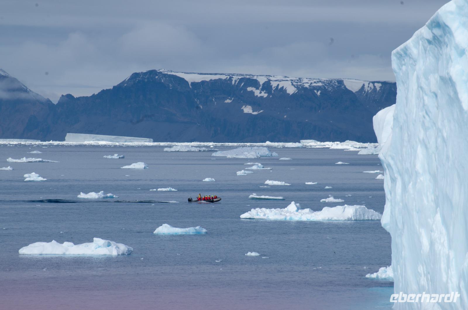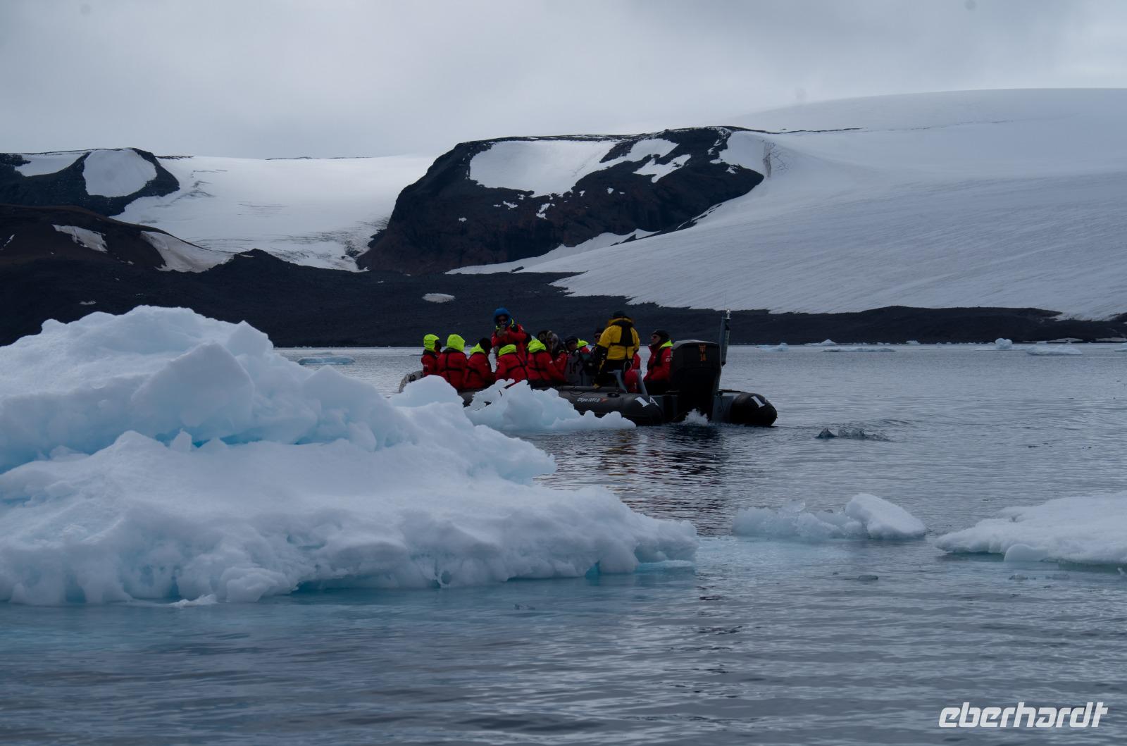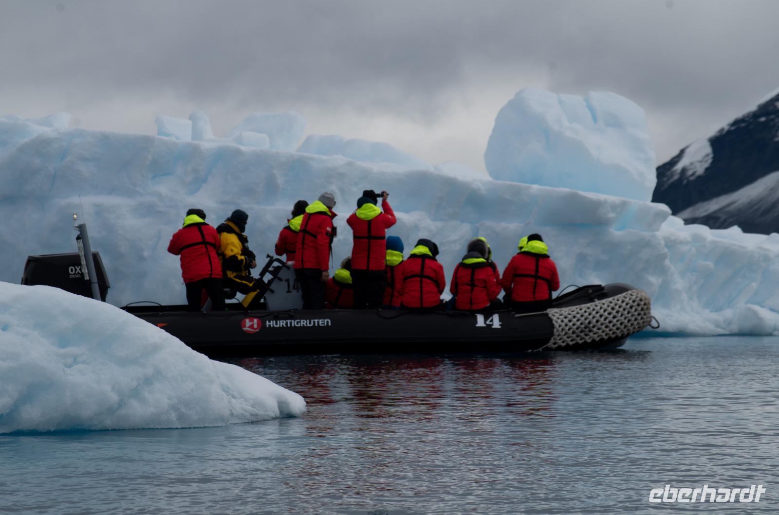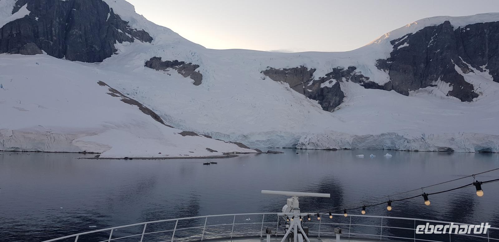 Jede Reise durch die Antarktis ist eine Expedition. Eine Entdeckertour durch Eisberge und Eisschollen. Das erleben wir besonders an Tag 8 bei der beeindruckenden Fahrt durch den Antarktik-Sound. Von Deck aus blicken wir auf die gigantischen Eisformationen und freuen uns auf unsere bevorstehende Bootsfahrt. Nach dem Mittagessen geht es endlich los. Wir gehen warm angezogen, mit Gummistiefeln und Schwimmweste auf Bootstour zu den imposanten und wunderschönen Eisbergen. Bei wunderbarem Wetter fahren wir durch spektakuläre Eisberglandschaften und Eisschollen. Dabei sehen wir immer wieder einheimische Tiere wie Vögel und Pinguine in ihrer natürlichen Umgebung... perfekte Fotomotive also. Die Gruppe ist ausnahmslos begeistert.Wieder an Board können wir heute gleich zwei interessanten Vorträgen lauschen: Ein Vortrag über Wale und Robben und eine Präsentation der Antarktis Entdecker Anfang des 19. Jahrhunderts.Wieder ein unglaublicher Tag in einer anderen Welt. Nach dem Abendessen steht noch das tägliche Infobreefing für den nächsten Tag an, bevor wir danach noch nach einigen Eisbergen Ausschau halten und schließlich zu Bett gehen.