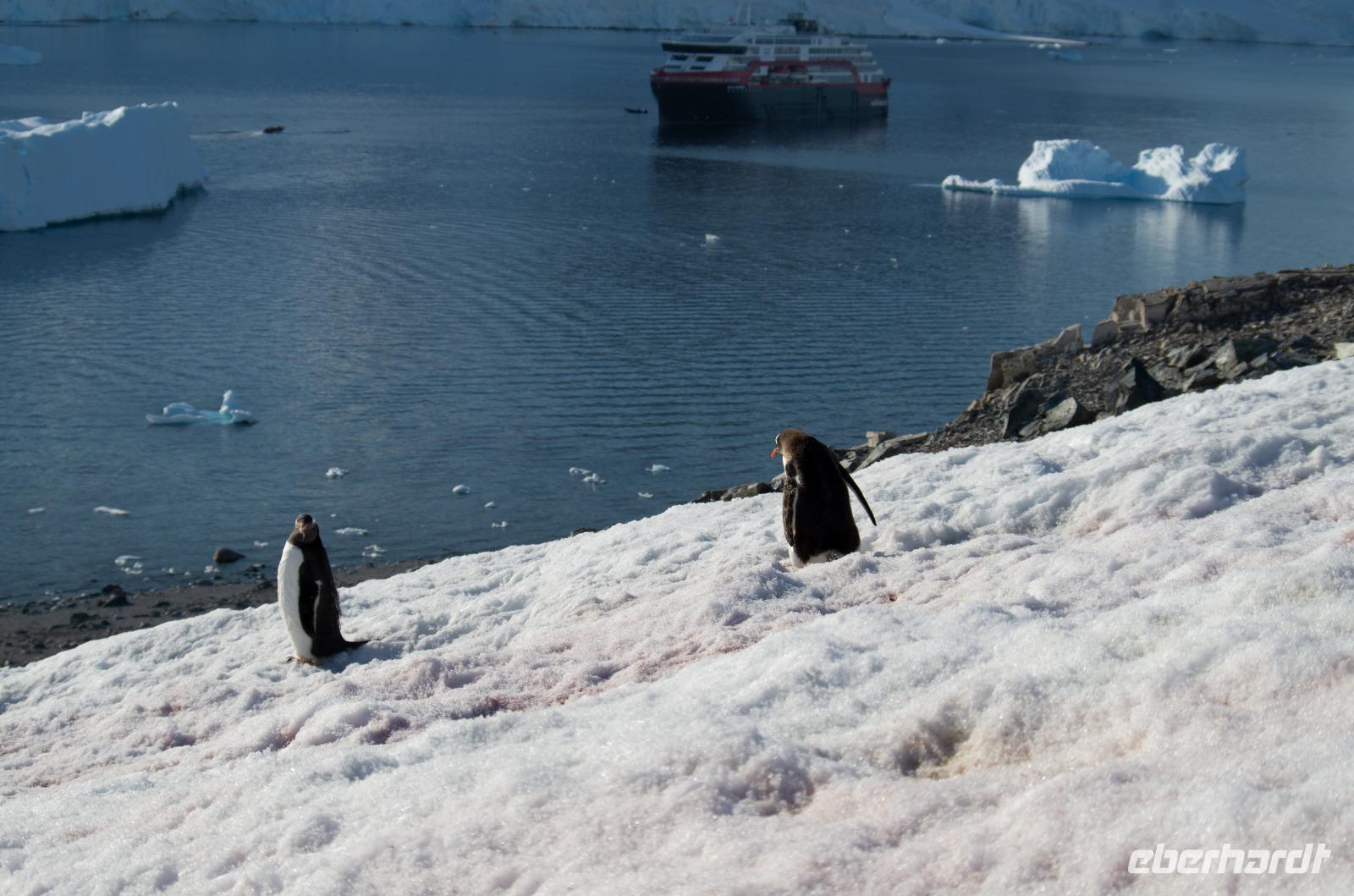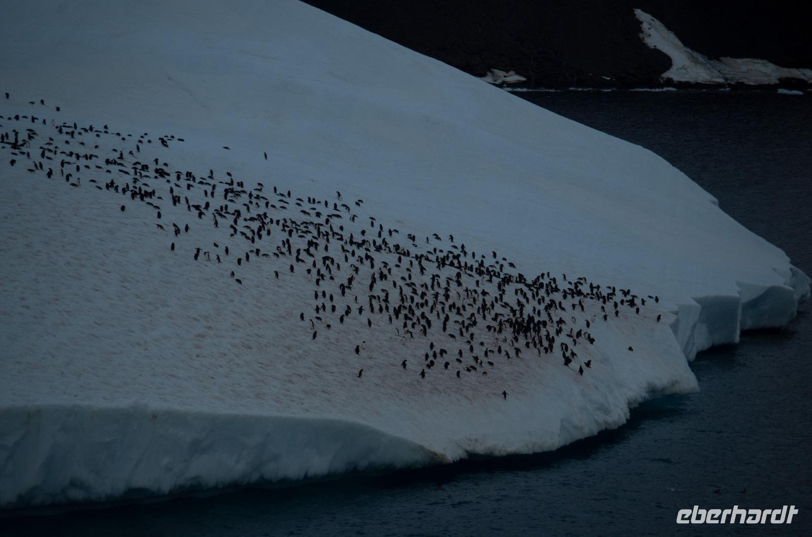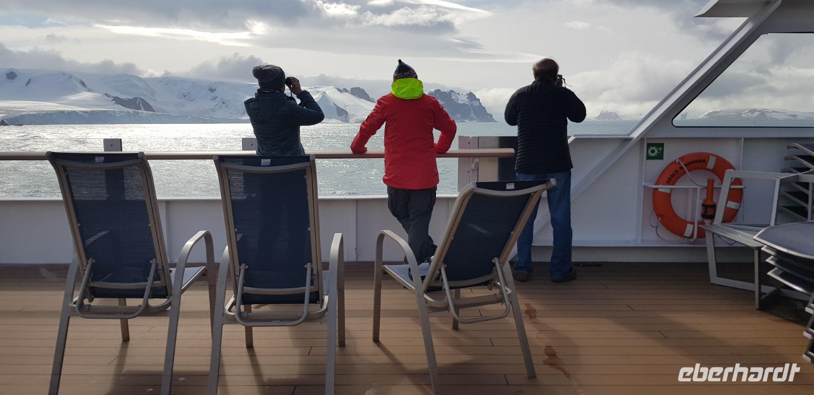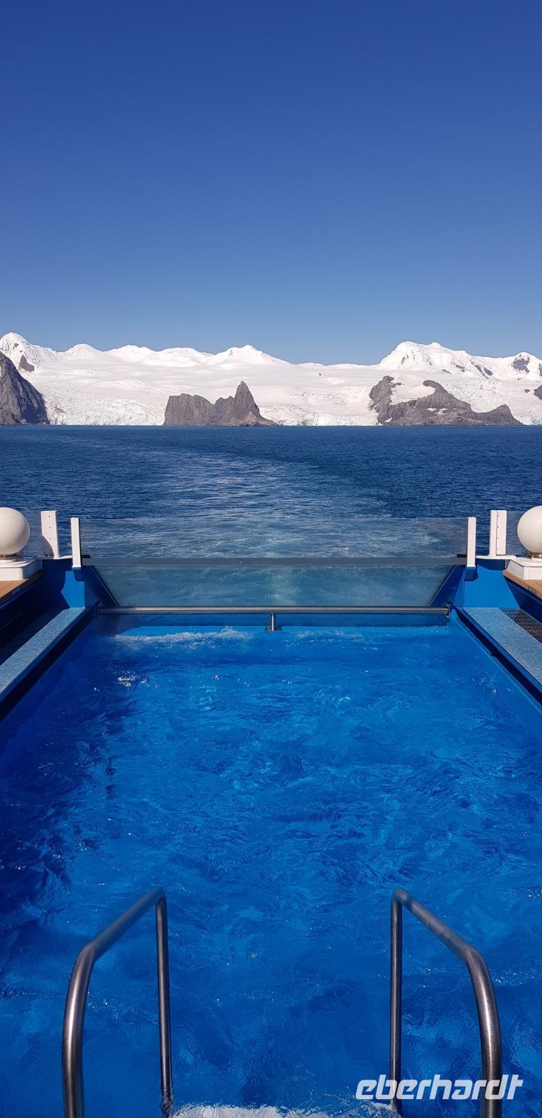 Heute steht Danco Island auf unserem Plan. Die 1,5 km lange Insel liegt im südlichen Abschnitt des Errera-Kanals. Zunächst heißt es aber Badezeit. Wir genießen gemeinsam den Pool am Sonnendeck des Schiffes und schlemmen bei einem BBQ auf dem Pooldeck. Am späten Nachmittag dann die Anlandung nach Ducan Island. Vor dem Schiff taucht plötzlich ein Minkwal auf, um uns zu begrüßen. Zum Glück haben wir unsere Kameras in der Hand und können diese Szene festhalten. Auf der Insel entdecken wir wieder zahlreiche Adeli Pinguine, die sichtlich das schöne Wetter genießen.Gemeinsam laufen wir durch den Schnee den Berg hinauf und erleben eine tolle Aussicht auf unser Schiff in der beeindruckenden Eis-Landschaft. Hier bietet sich auch die Möglichkeit für ein schnelles Gruppenfoto bei blauem Himmel. Heute ist übrigens der wärmste Tag, mit der höchsten Temperatur der je in der Antarktis gemessen wurde. Bei uns ca. 10 Grad, doch in einer Forschungsstation weiter nördlich sogar 18Grad! Der Klimawandel lässt Grüßen. Zurück an Board genießen wir zusammen das Abendessen und beobachten bei einem Drink an der Bar die vielen Eisberge der Umgebung.