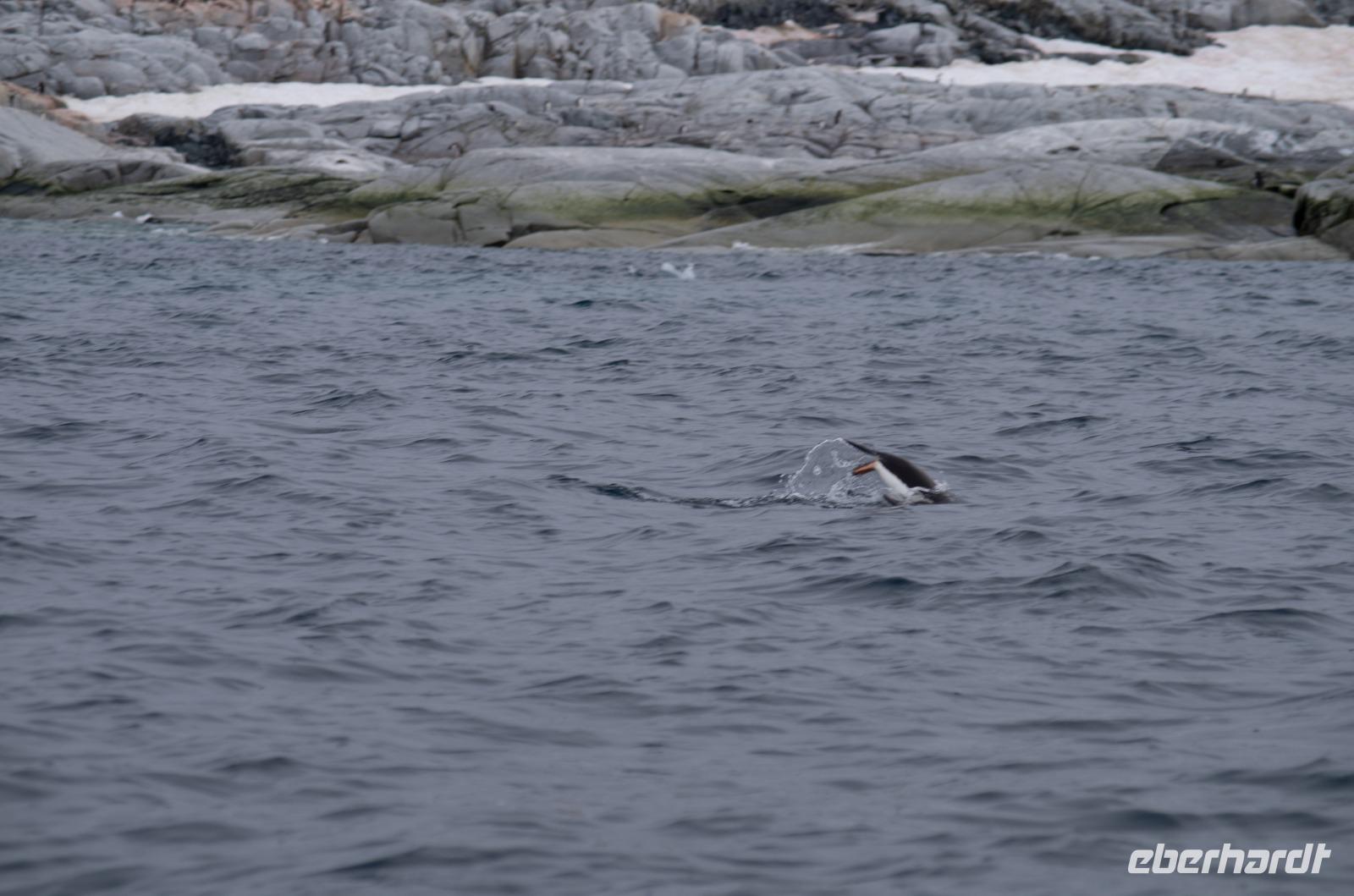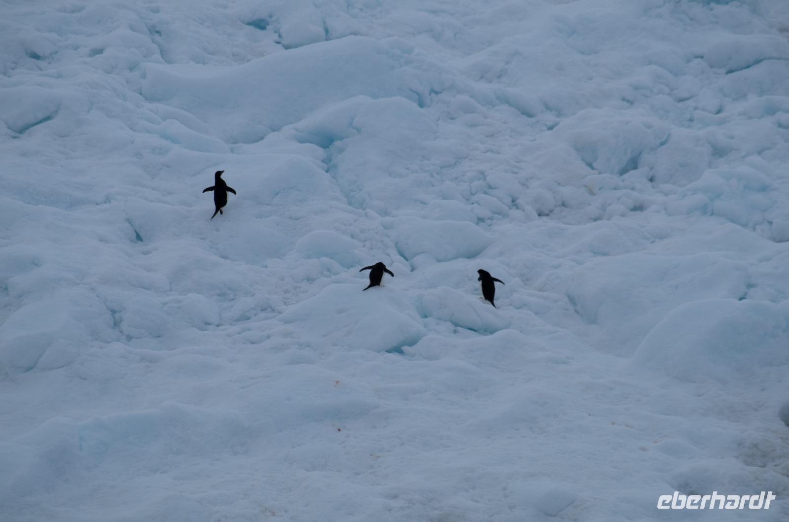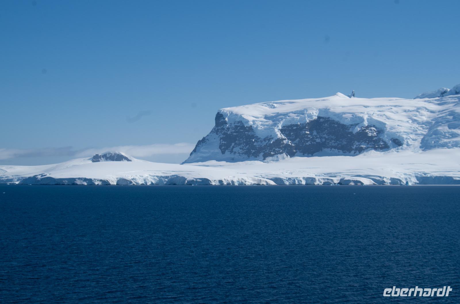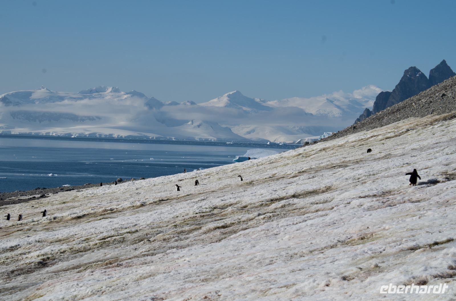 Heute steht Danco Island auf unserem Plan. Die 1,5 km lange Insel liegt im südlichen Abschnitt des Errera-Kanals. Zunächst heißt es aber Badezeit. Wir genießen gemeinsam den Pool am Sonnendeck des Schiffes und schlemmen bei einem BBQ auf dem Pooldeck. Am späten Nachmittag dann die Anlandung nach Ducan Island. Vor dem Schiff taucht plötzlich ein Minkwal auf, um uns zu begrüßen. Zum Glück haben wir unsere Kameras in der Hand und können diese Szene festhalten. Auf der Insel entdecken wir wieder zahlreiche Adeli Pinguine, die sichtlich das schöne Wetter genießen.Gemeinsam laufen wir durch den Schnee den Berg hinauf und erleben eine tolle Aussicht auf unser Schiff in der beeindruckenden Eis-Landschaft. Hier bietet sich auch die Möglichkeit für ein schnelles Gruppenfoto bei blauem Himmel. Heute ist übrigens der wärmste Tag, mit der höchsten Temperatur der je in der Antarktis gemessen wurde. Bei uns ca. 10 Grad, doch in einer Forschungsstation weiter nördlich sogar 18Grad! Der Klimawandel lässt Grüßen. Zurück an Board genießen wir zusammen das Abendessen und beobachten bei einem Drink an der Bar die vielen Eisberge der Umgebung.
