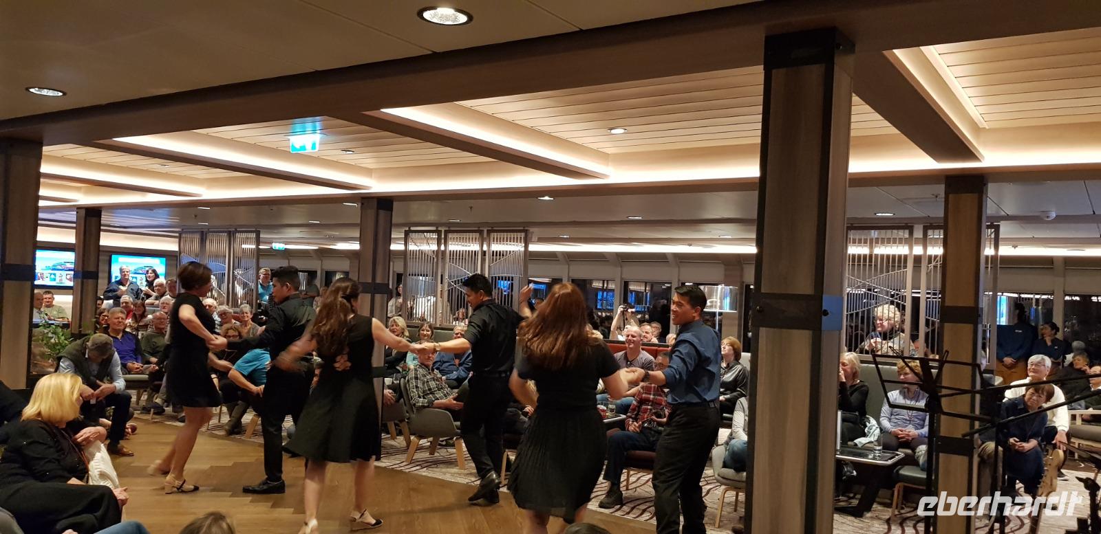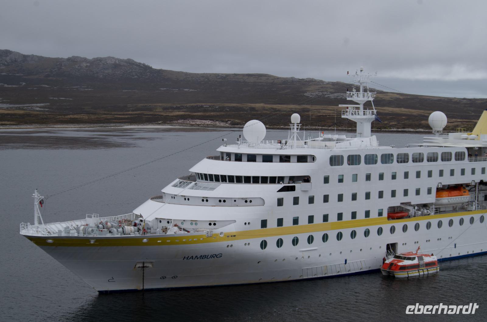 Nach dem Frühstück kommen wir auch schon an einer Bucht von West Point Island an. Wir fahren mit den Zodiacs an Land, begleitet werden wir von Delphinen im Meer. Die Gäste haben nun die Optionen mit den Jeeps oder zu Fuß auf die andere Seite der Insel, zu den Felsenpinguinen, zu gelangen. Aber nicht nur diese eine Pinguinart hat sich hier versteckt, wir bestaunen außerdem Eselspinguine und Albatrosse mit ihren Kücken. Danach spazieren wir zurück und besuchen das Schafshaus (Wollehaus), sehen einige Schafe im Stall und genießen bei Kaffee und Kuchen die gemütliche Atmosphäre.Zum Mittagessen sind wir zurück auf dem Schiff und genießen den restlichen Tag an Bord. Am Abend erwartet uns dann noch ein kleines Highlight unserer erlebnisreichen Reise: die Crew-Verabschiedungsshow mit Live Band und tollen Tanzeinlagen - alle sind begeistert.