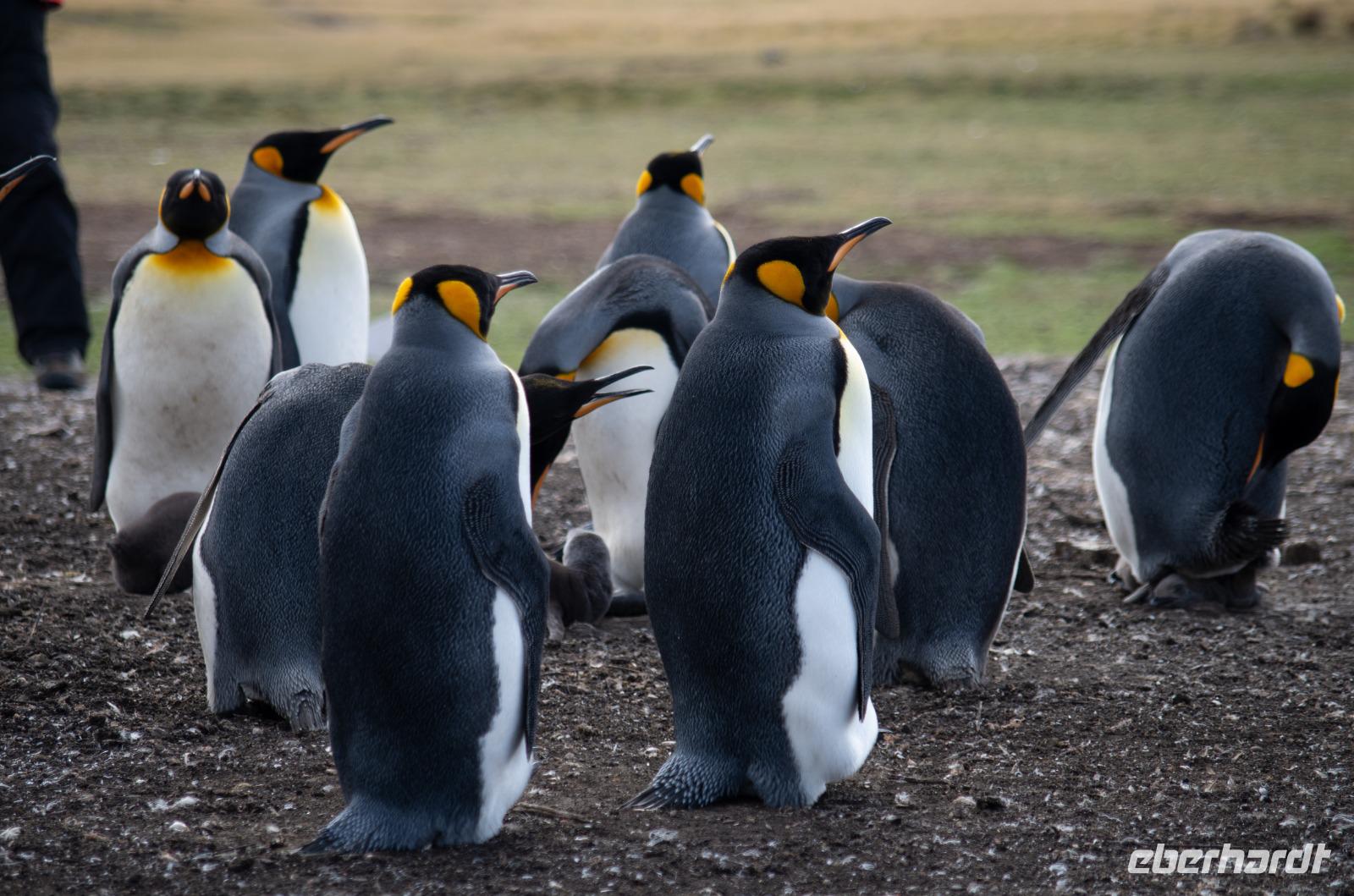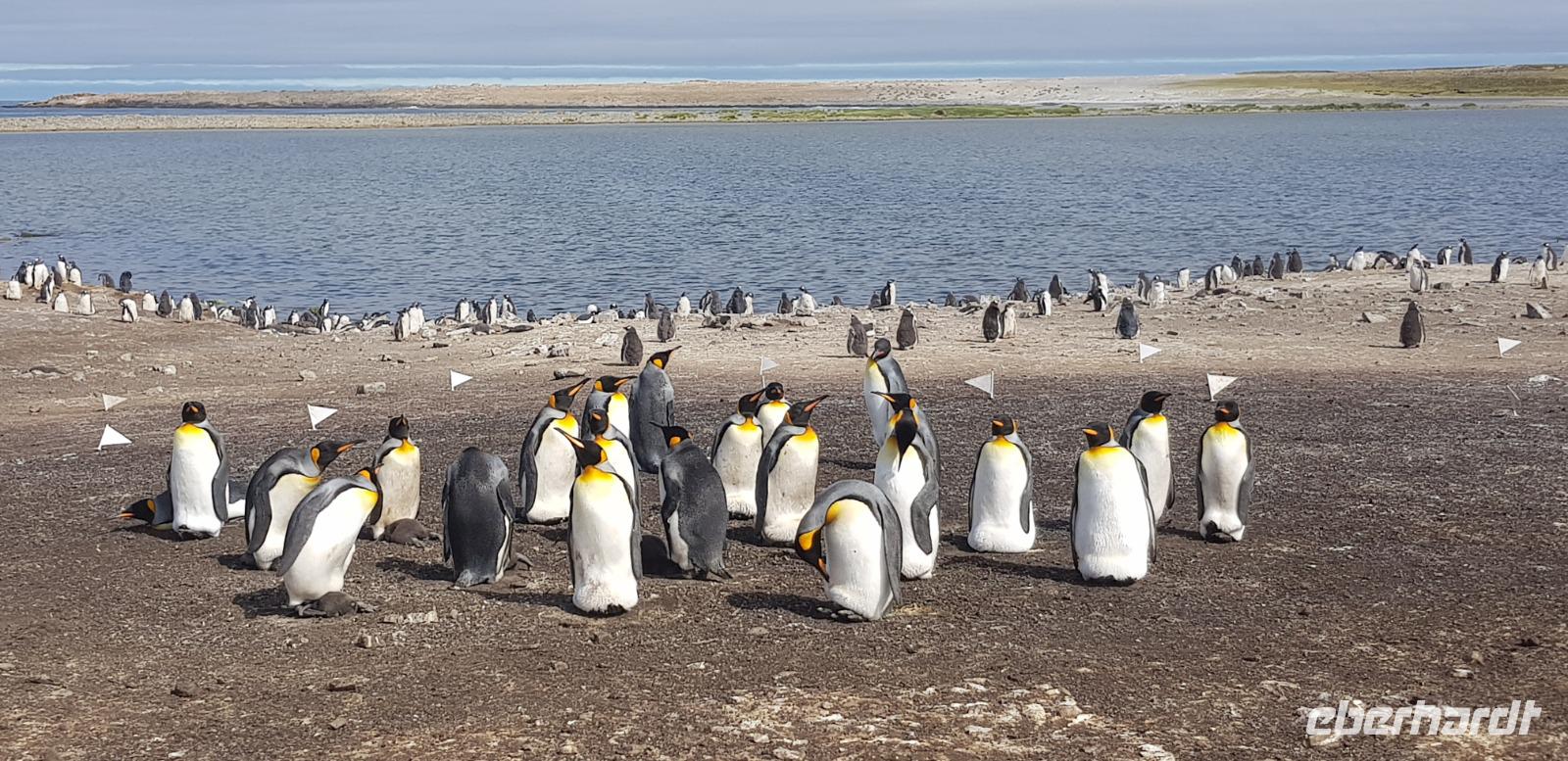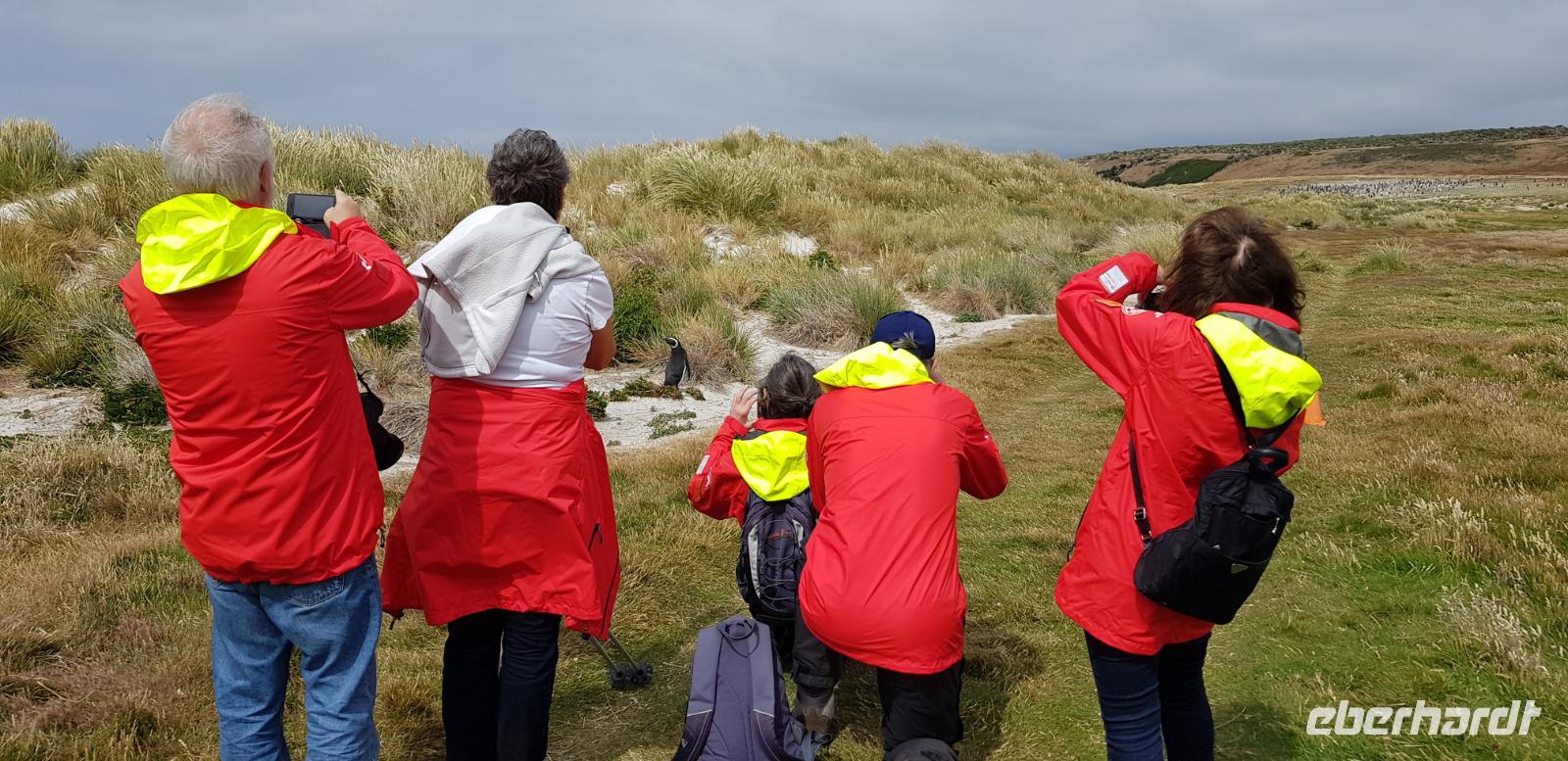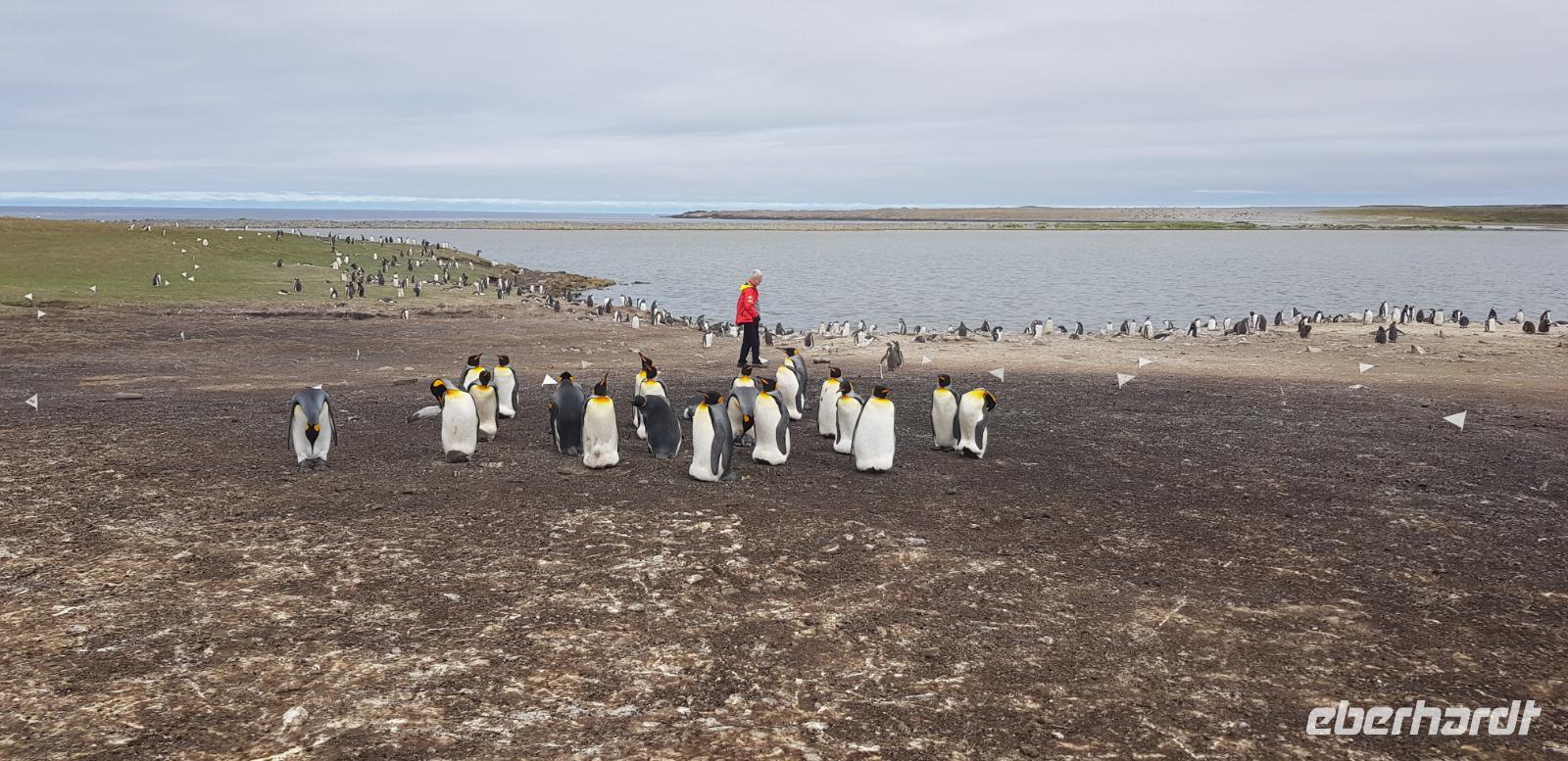 „Endlich" wieder an Land: Nach den vergangenen Seetagen können wir heute das Land auf den Falkland Islands betreten. Bereits am Vormittag betreten wir den Pier der Insel und fahren anschließend ins Zentrum nach Stanley zum Visitorcenter. Hier haben wir ca. eine Stunde Aufenthalt und schauen uns u.a. das Jublie Haus, die Kathedrale, das Walfisch Denkmal zur Erinnerung an 100 Jahre Britische Kolonie und die Post Office an. Es folgt ein wahres Highlight unserer Reise: die Bluff Cove Tour. Mit einem kleinen Bus fahren wir ca. 30min in nördlicher Richtung. Von einem Treffpunkt aus, geht es 4er Jeeps weiter über das unwegsame Gelände zum Strand von Bluff Cove. Hier treffen wir auf viele prächtige Königspinguine. Die über 1m großen Tierchen stehen in einer kleinen Gruppe im Kreis und schützen Ihre Jungtiere. Auch hier sind wieder Fahnen gesteckt, damit niemand zu nah ran geht. In aller Ruhe filmen und fotografieren wir die süßen Tiere. Bei einem kleinen Spaziergang am Strand sehen wir außerdem noch Adelie- Pinguine, zum Schluss gibt es noch Kaffee und Kuchen, doch die meisten beobachten in der Zeit lieber die Tierwelt.Danach geht es wieder zurück nach Stanley. Hier haben wir noch genügend Zeit für den Besuch des Falkland Museums, des Kriegdenkmals von 1982 sowie dem Besuch eines Pubs - der natürlich auch nicht fehlen darf. Wir haben viel erlebt und kehren pünktlich zum gemeinsamen Abendessen mit dem letzten Shuttlebus zurück zum Schiff.