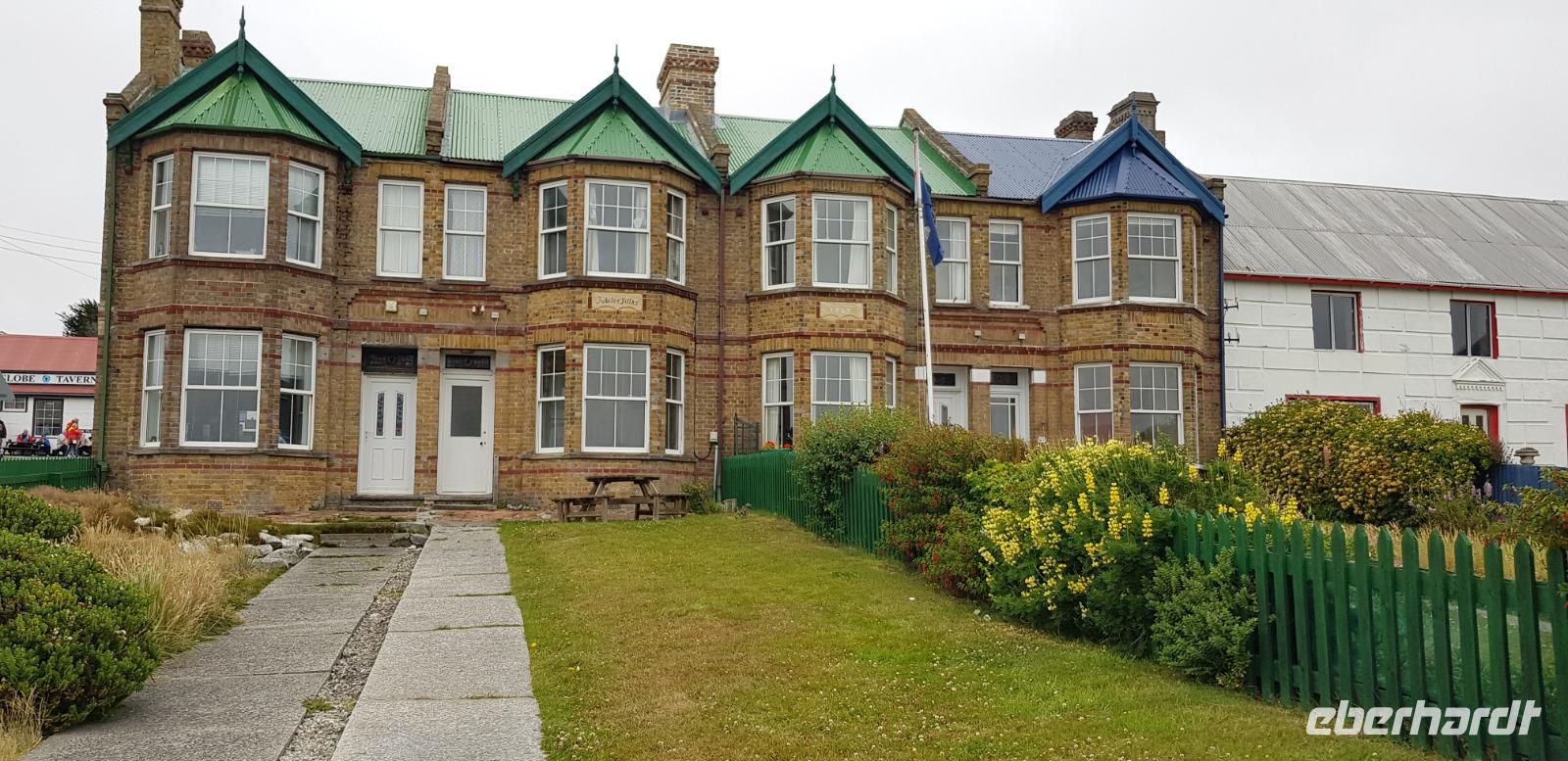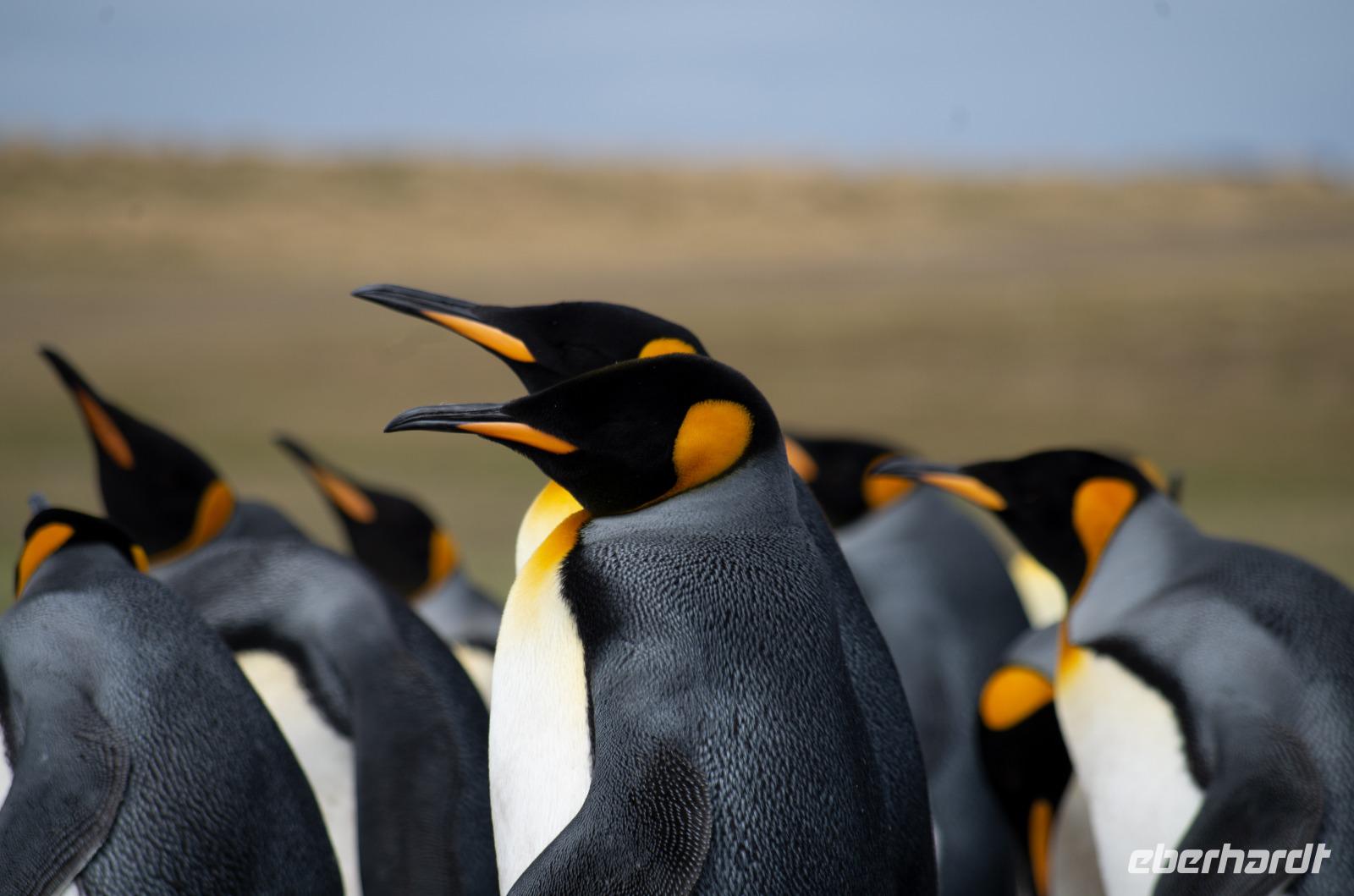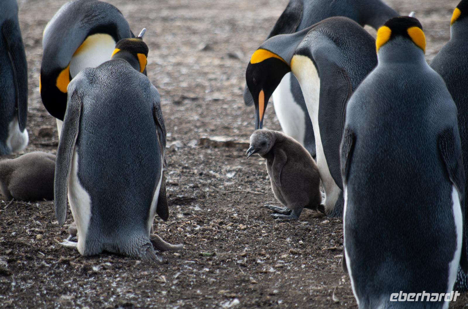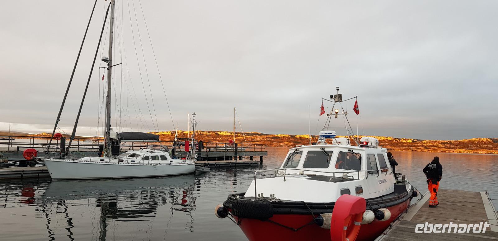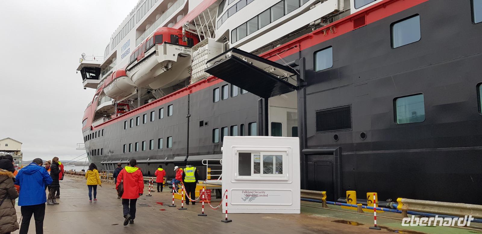 „Endlich" wieder an Land: Nach den vergangenen Seetagen können wir heute das Land auf den Falkland Islands betreten. Bereits am Vormittag betreten wir den Pier der Insel und fahren anschließend ins Zentrum nach Stanley zum Visitorcenter. Hier haben wir ca. eine Stunde Aufenthalt und schauen uns u.a. das Jublie Haus, die Kathedrale, das Walfisch Denkmal zur Erinnerung an 100 Jahre Britische Kolonie und die Post Office an. Es folgt ein wahres Highlight unserer Reise: die Bluff Cove Tour. Mit einem kleinen Bus fahren wir ca. 30min in nördlicher Richtung. Von einem Treffpunkt aus, geht es 4er Jeeps weiter über das unwegsame Gelände zum Strand von Bluff Cove. Hier treffen wir auf viele prächtige Königspinguine. Die über 1m großen Tierchen stehen in einer kleinen Gruppe im Kreis und schützen Ihre Jungtiere. Auch hier sind wieder Fahnen gesteckt, damit niemand zu nah ran geht. In aller Ruhe filmen und fotografieren wir die süßen Tiere. Bei einem kleinen Spaziergang am Strand sehen wir außerdem noch Adelie- Pinguine, zum Schluss gibt es noch Kaffee und Kuchen, doch die meisten beobachten in der Zeit lieber die Tierwelt.Danach geht es wieder zurück nach Stanley. Hier haben wir noch genügend Zeit für den Besuch des Falkland Museums, des Kriegdenkmals von 1982 sowie dem Besuch eines Pubs - der natürlich auch nicht fehlen darf. Wir haben viel erlebt und kehren pünktlich zum gemeinsamen Abendessen mit dem letzten Shuttlebus zurück zum Schiff.