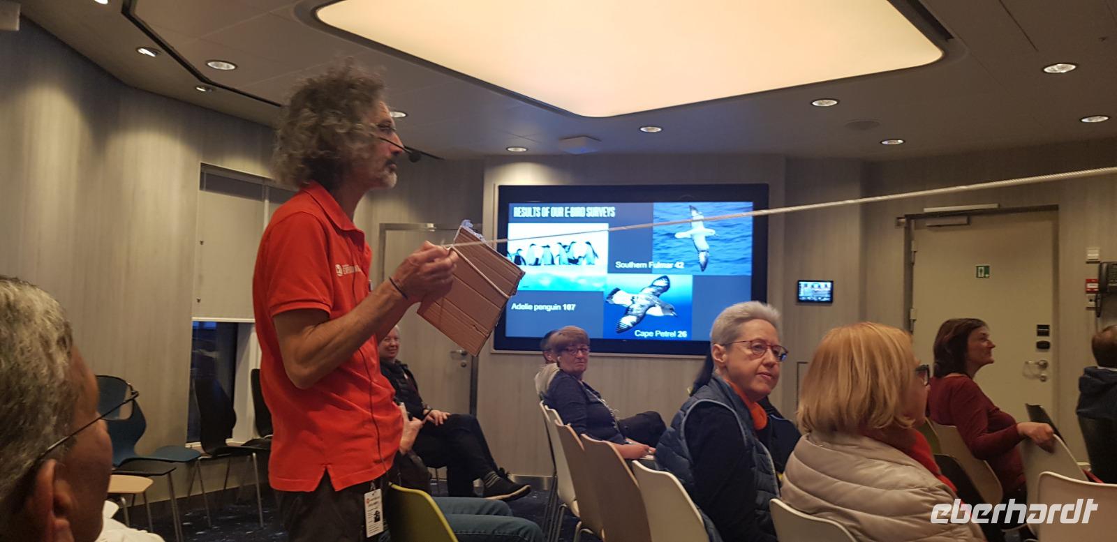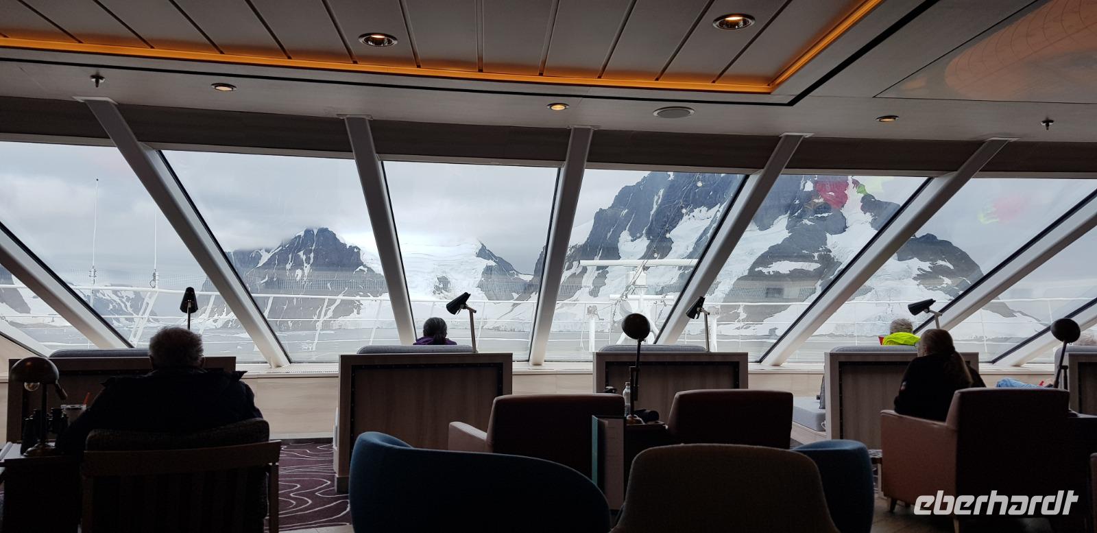 Heute ist ein Seetag. Wir genießen die tolle Aussicht vom Schiff durch die eisige Landschaft der Antarktis und erhalten interessante Fakten zum Leben und Entstehung des Kontinents bei verschiedenen Vorträgen. So auch von Herrn Prof. Dr. Noack, ein Reisegast aus unserer Gruppe, der einen interessanten Vortrag über seine Zeit in der Antarktis hält. Er selbst war als Wissenschaftlicher bzw. Vermesser im Jahr 1990 für ein Jahr auf dem südlichsten Kontinent der Erde.Wir sind begeistert und hätten noch viel länger seinem Vortrag lauschen können, doch leider ist die Zeit im Auditorium immer etwas begrenzt. Zum heutigen Abendessen, haben wir eine Reservierung im Bezahlrestaurant - Lindstróm.
