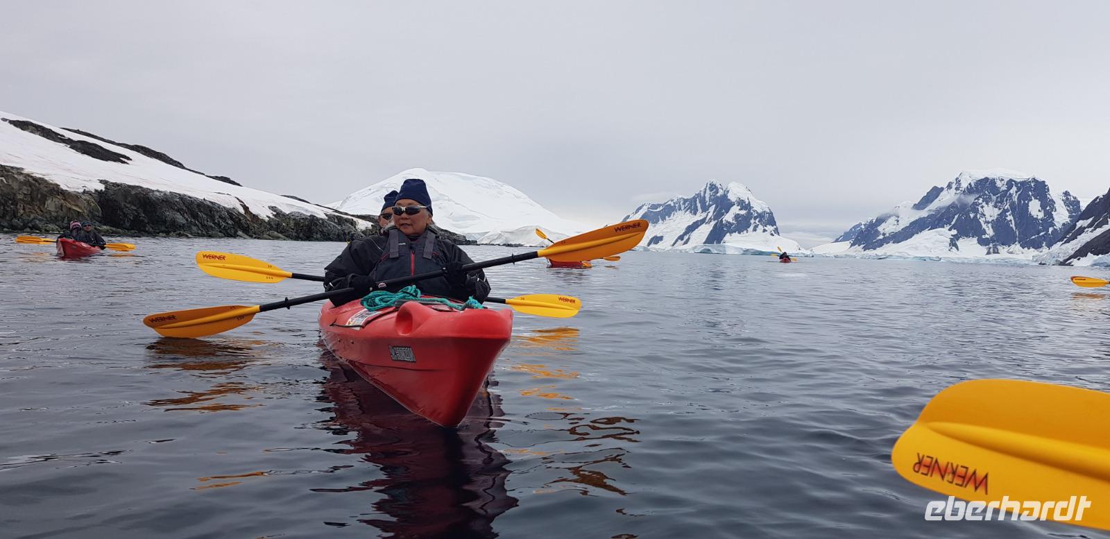 Peterman Island ist eine kleine, unbewohnte Insel der Antarktis und unser Tagesziel für Tag 12 der Reise. Nach dem Frühstück treffen wir uns an Deck, um die Durchfahrt durch den Lemaire Kanal gemeinsam zu beobachten. Bereits am frühen Nachmittag landen wir schließlich auf Petermann Island an. Da die Insel durch viele Felsen geprägt ist, hilft uns ein erfahrenes Expeditionsteam beim Aussteigen. Wir bleiben eine Stunde auf der Insel und beobachten eine große Pinguin-Kolonie in ihrer natürlichen Umgebung. Am späten Nachmittag sind wir zurück auf dem Schiff. Für einige Gäste heißt es jetzt: rauf aufs Kajak. Die Kajaktouren konnten zu Beginn der Reise gebucht werden. Die Ausrüstung erhält man an Board inklsive Anzüge und Schuhe. Zunächst fahren wir mit den Zodiacs, eine Art Schlauchboot, aufs Meer hinaus und neben uns tauchen zwei Humpback Wale auf, wir sind begeistert. Vor allem die chinesischen Mitbürger, erfreuen sich besonders laut über dieses Spektakel. Anschließend steigen wir um in die Kajaks und paddeln durch die Eisberge. Ein wirklich großartiges und einzigartiges Erlebnis am Ende des Tages. Nach dem Abendbrot und dem abendlichen Infomeeting sitzen wir noch gemeinsam in der Explorer Lounge und werten die Bilder & Videos vom Tag aus.