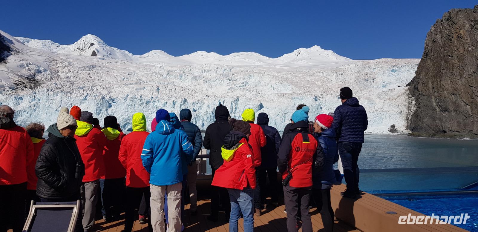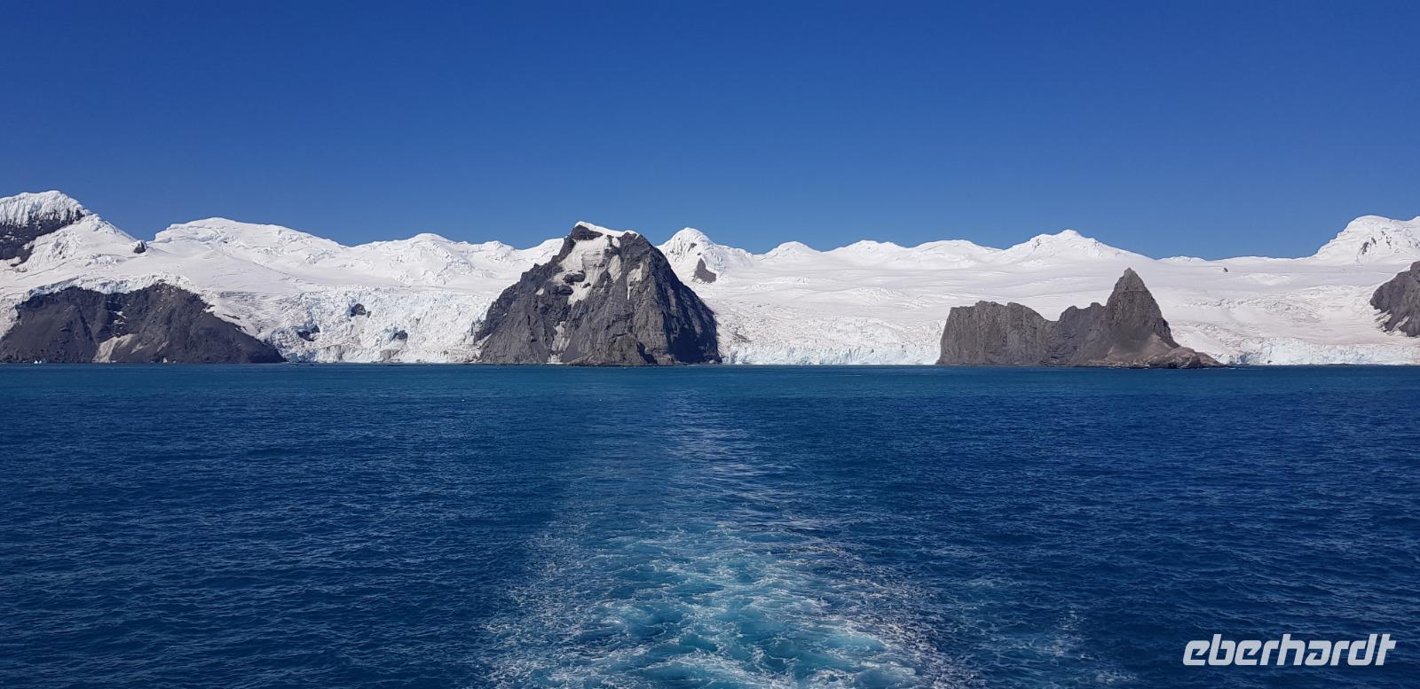Geschichte wird zur Realität: Nachdem wir gestern einem Vortrag über die Shackletons Endurance Expedition zuhören durften, erreichen wir heute Elephant Island, wo Shackleton damals seine Crew absetze. Leider ist auch hier kein Landgang möglich, wir werden dafür aber mit einem tollen Ausblick auf die Gletscher belohnt. An Board geht es anschließen weiter mit einem Vortrag über Arved Fuchs im Kielwasser von Shackleton und einem Vortrag über die Wale.