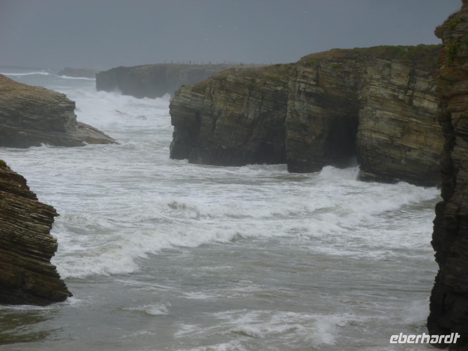 Die Flut umtoste die bizarr geformten Felstore an der Praia das Catedrais bei Ribadeo, der Strand war gesperrt, doch eine Wanderung oberhalb möglich mit Aussichtspunkten auf die malerische wilde Küste.