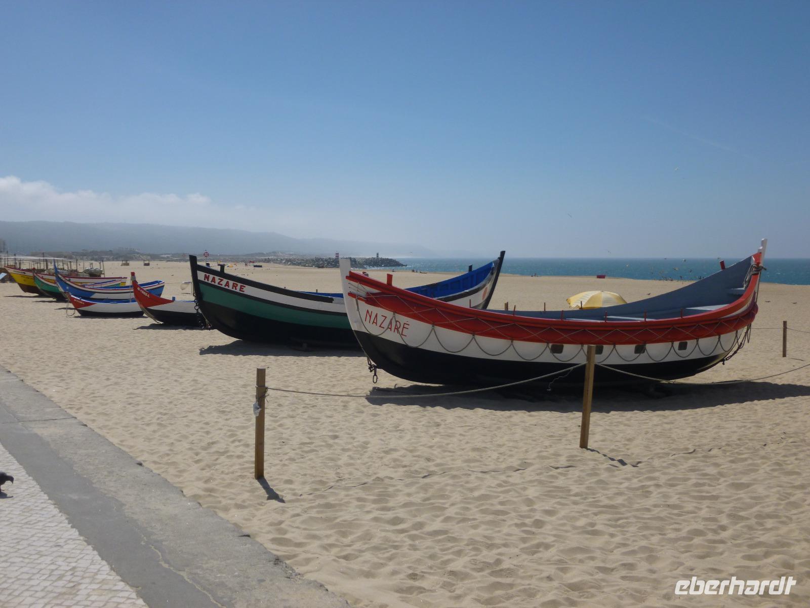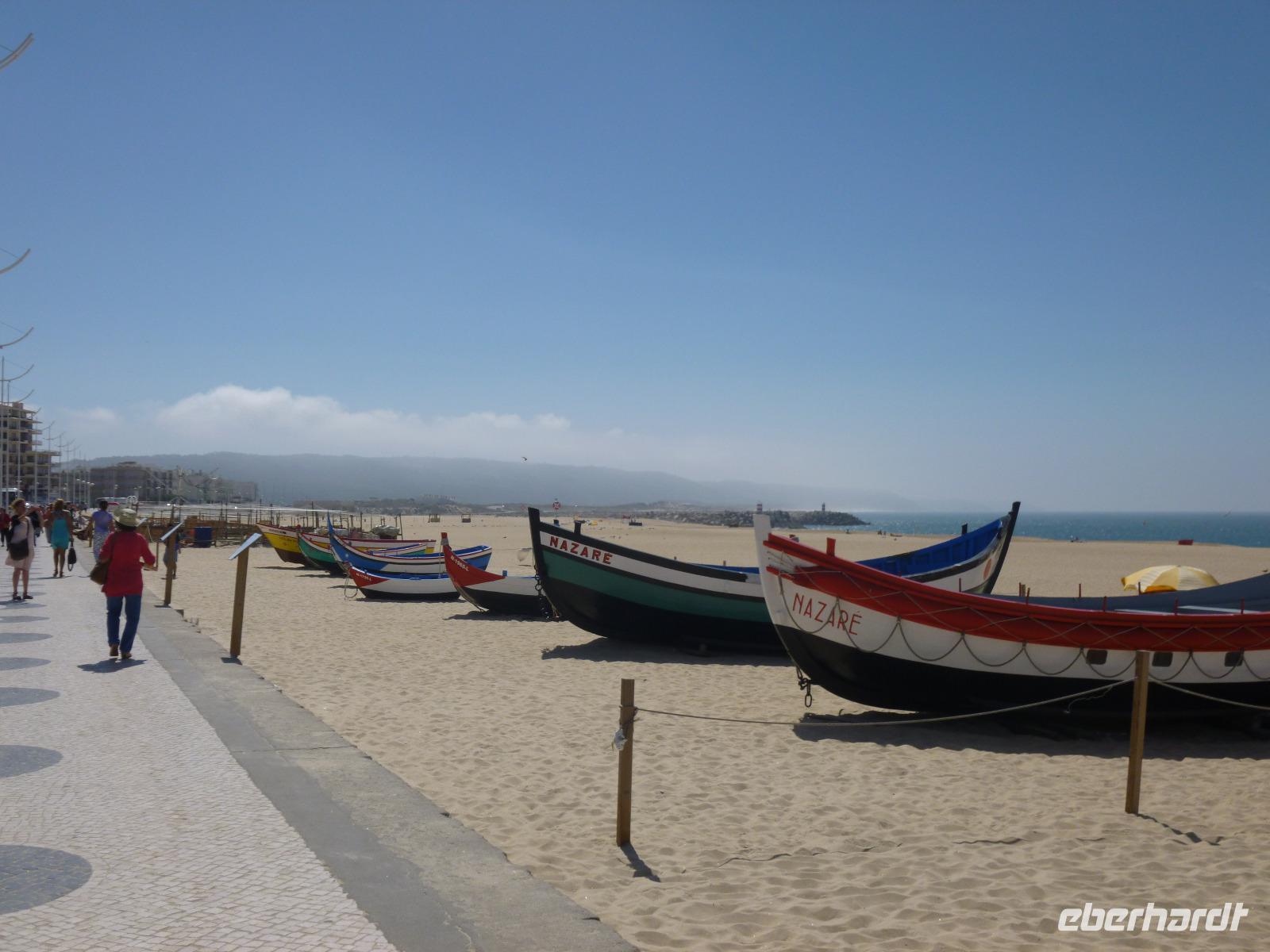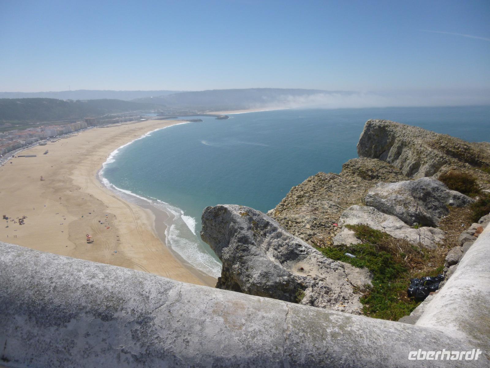 Das Fischerdorf Nazaré mit seinen bunten Booten am Strand liegt an einer sanft geschwungenen herrlichen Bucht, die wir vom hoch auf einem Fels gelegenen Nebenort Sitio (110 m Höhe) betrachten konnten gleich neben der winzigen Gedenkkapelle für die Errettung eines Ritters (im 12. Jahrhundert gestiftet) und der barocken Nossa Senhora de Nazaré-Kirche.