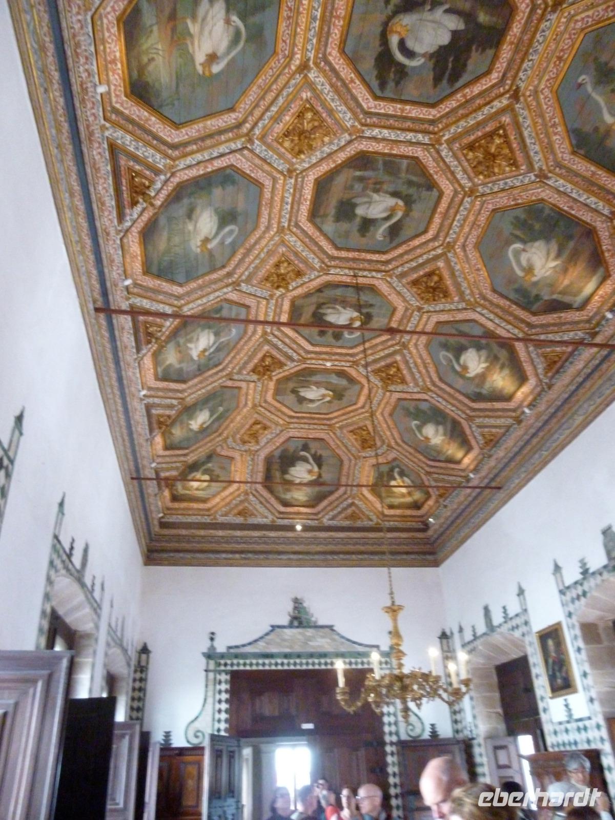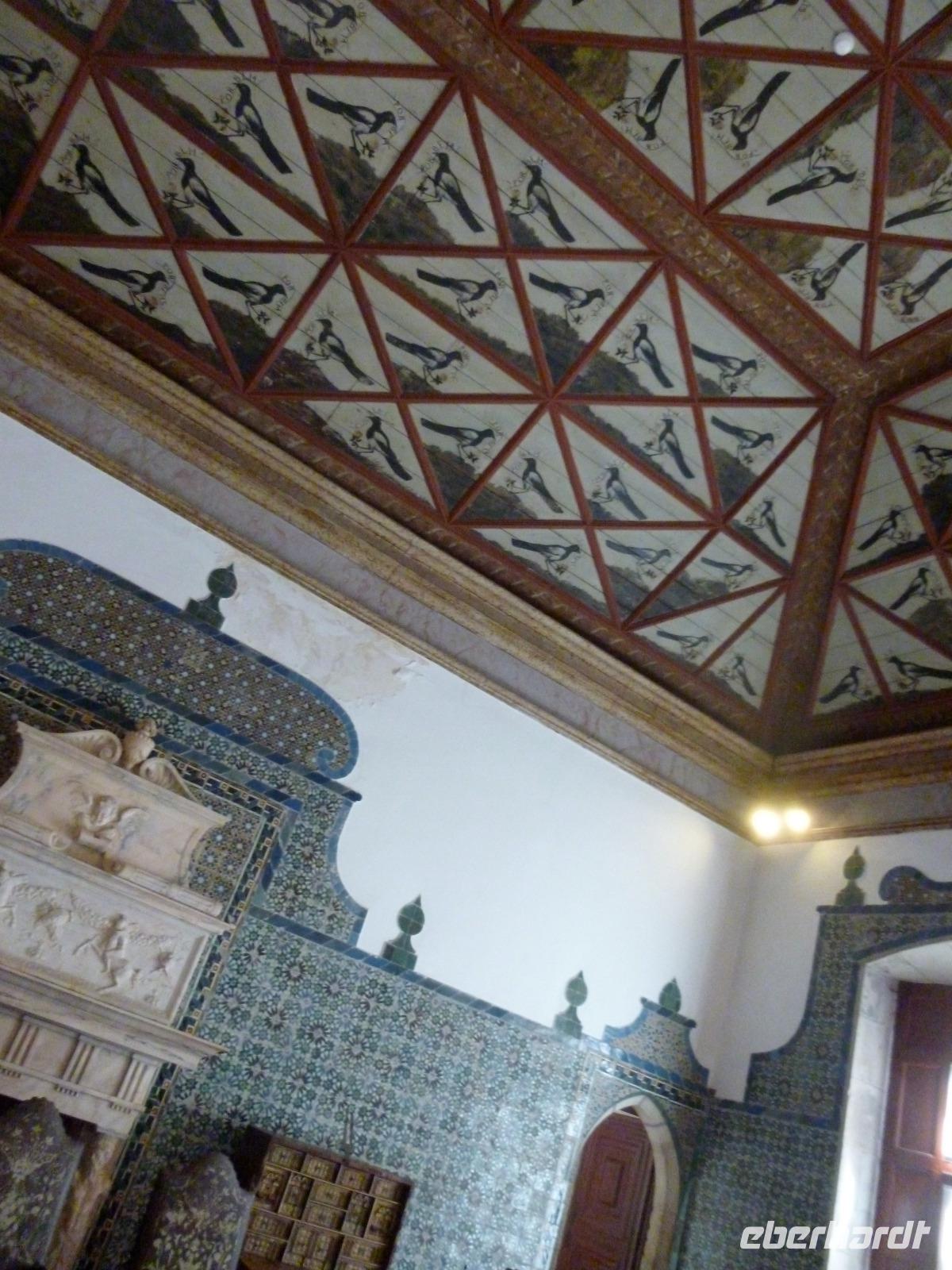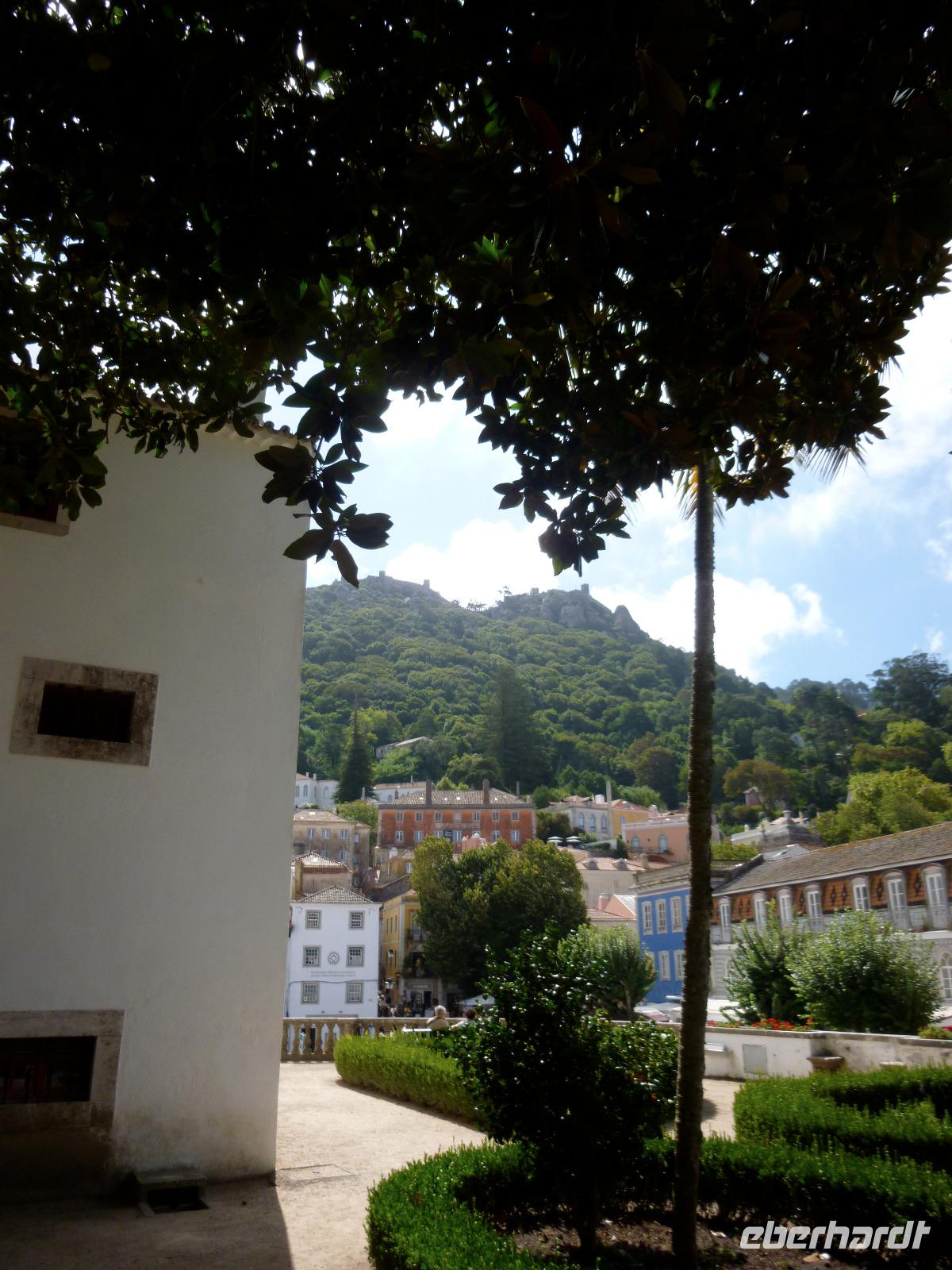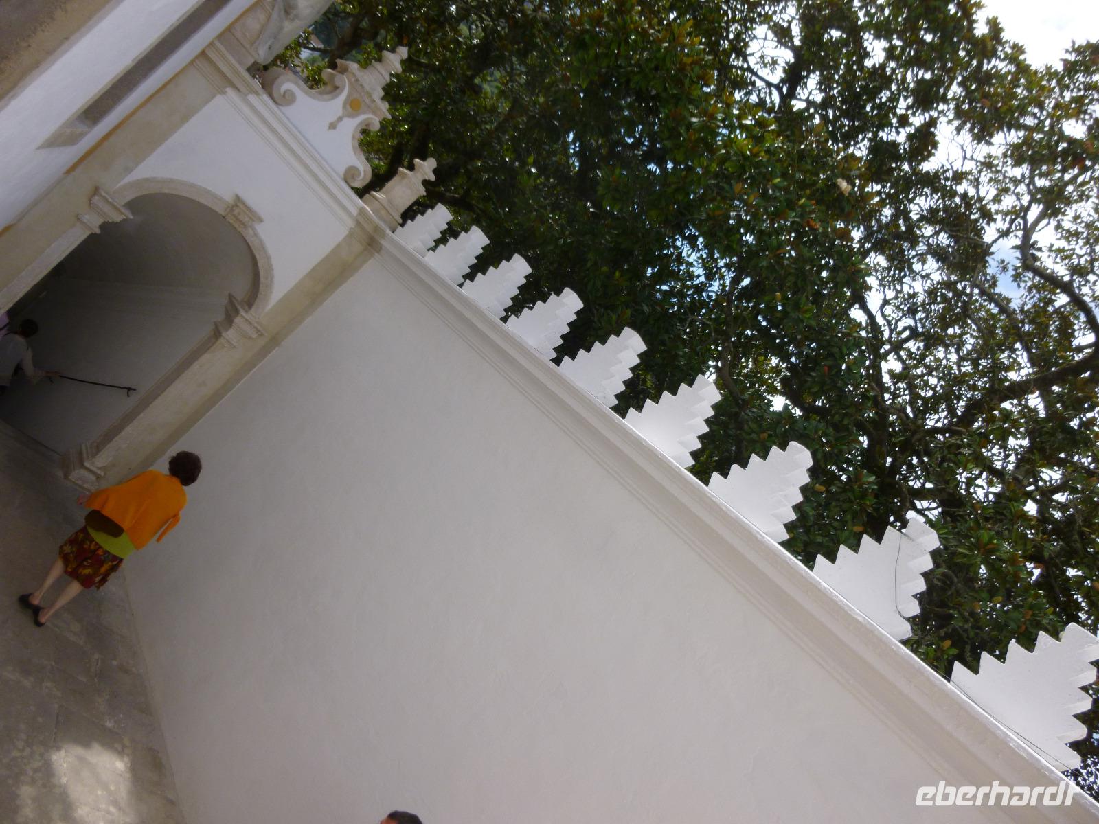 In Sintra besuchten wir mit Ines nicht den eklektischen Neuschwansteinpalast de Pena, sondern den gotischen Palast in der Altstadt mit den bizarren beiden weißen Küchen-Schornsteinen. Wir bestaunten dort den Schwanen-, Elstern- und Wappensaal sowie das Gefängnis eines Königs und die Küche. Wer wollte, betrat noch den Garten mit Wasserspielen und dem Ausblick zum Fels-Hügel.