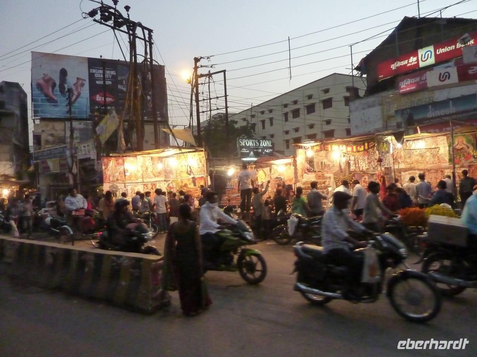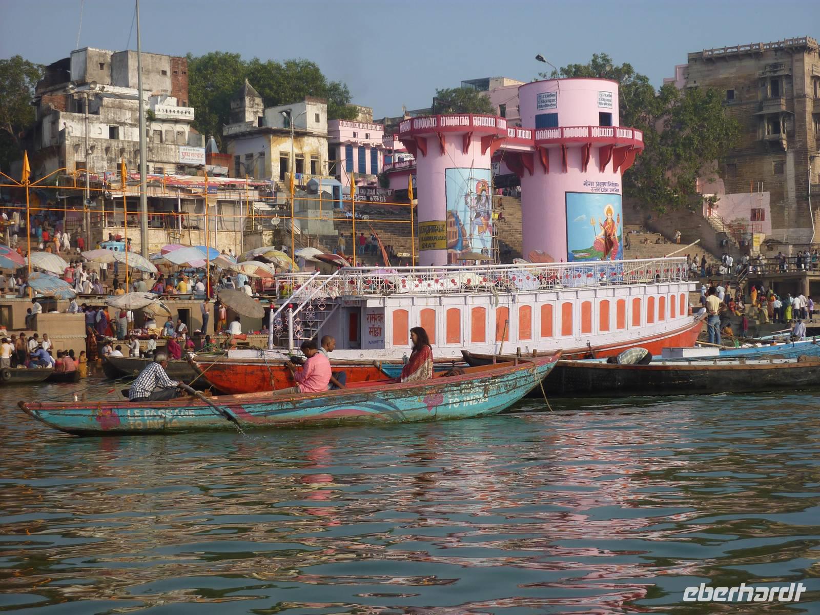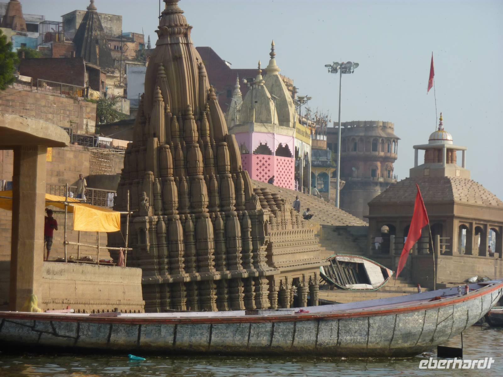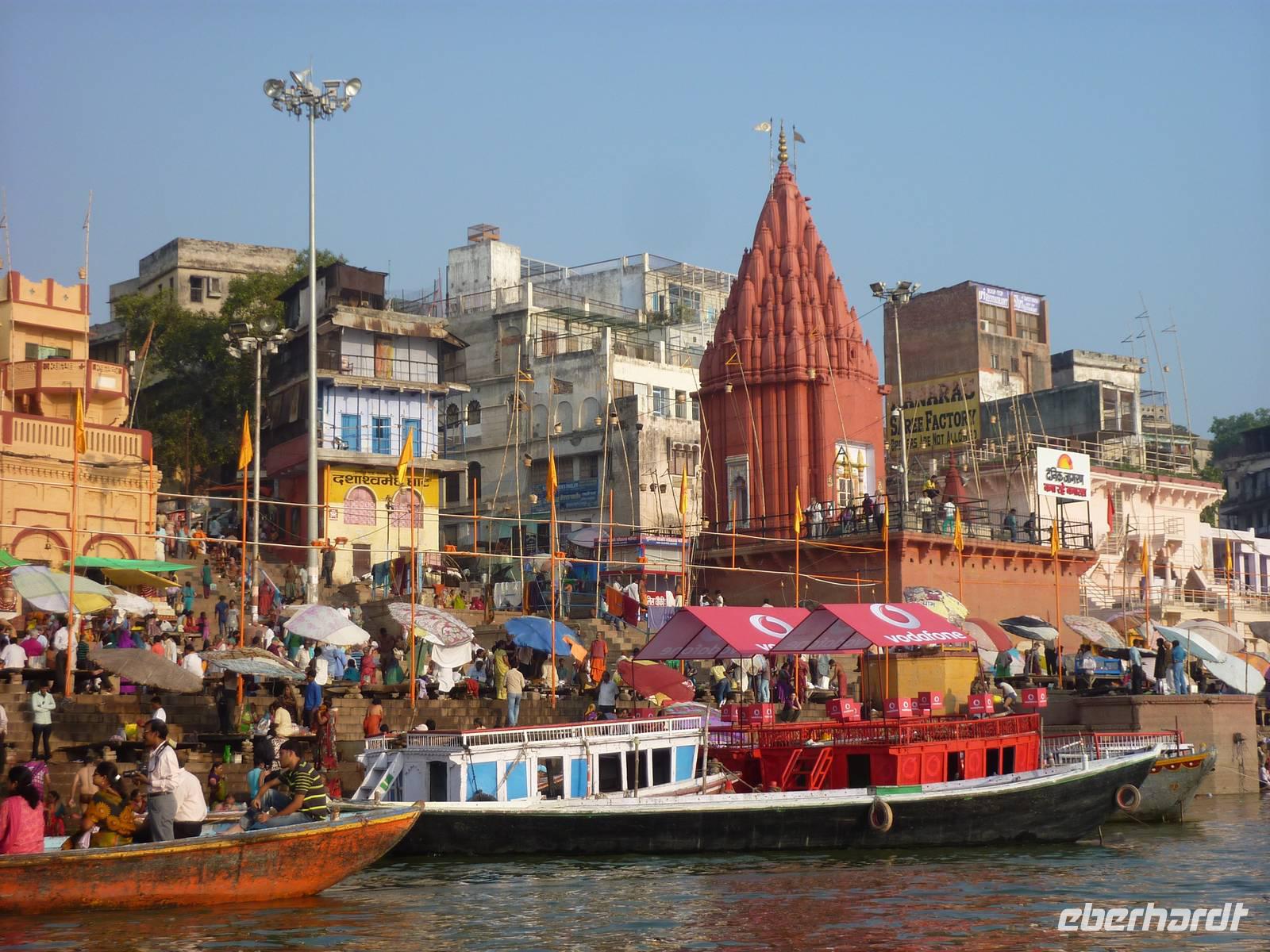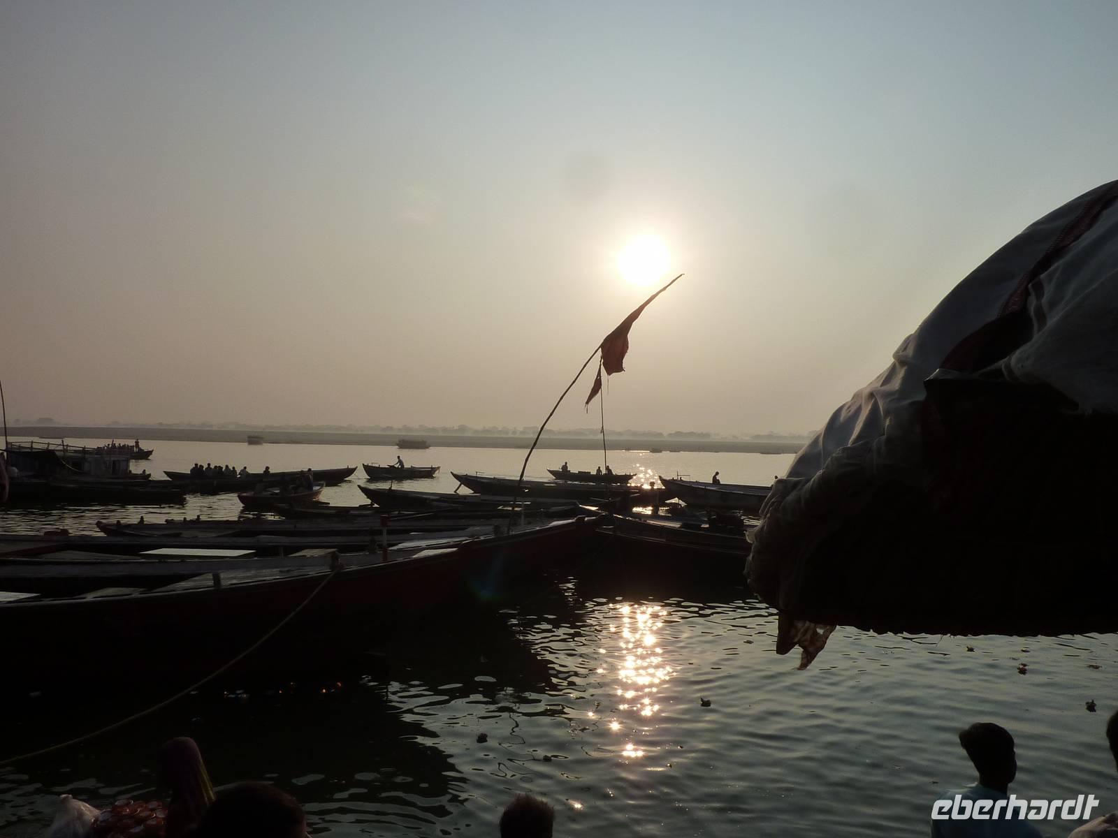 Bereits um 05.45 Uhr klingelte der Wecker, 6.15 Uhr Frühstück, naja was man zu solch nachtschlafender Zeit eben so frühstücken kann und auf zum Flughafen nach Dehli. Nach ca. 5 Stunden Busfahrt errreichten wir den Flughafen und somit unseren Flug nach Varanasi. Wir hatten alle gut gepackt, denn die Vorgabe waren 15 Kilo Aufgabegepäck, am Ende hatten wir gar noch 1 Kilo Reserve, super .. Am Nachmittag landeten wir planmäßig in Varanasi, bezogen zunächst unser 4-Sterne Radisson Hotel und gegen 17.00 Uhr machten wir uns dann auf zur Aarti Zeremonie, für mich sollte dies der bewegendste Moment dieser Reise werden. Diesmal nutzen wir eine Rikscha um ins Getümmel des Geschehens zu gelangen, abermals ein Vergnügen und zugleich Abenteuer. Im Sonnenuntergang rauschten wir so durch das Straßentreiben, welches man hier nicht in Worte zu fassen vermag.. Schließlich fanden wir uns unter Tausenden von Pilgerern wieder, die dieser allabendlichen Zeremonie beiwohnten.. und was es um so faszinierender macht, es ist nicht nur für den Touristen GEMACHTES .. es ist verdammt noch mal einfach echt.. und was das dann mit einem machte, kann man nicht in Worte kleiden, das muss man fühlen.. Sorry!! Nur so viel.. es geht unter die Haut!
