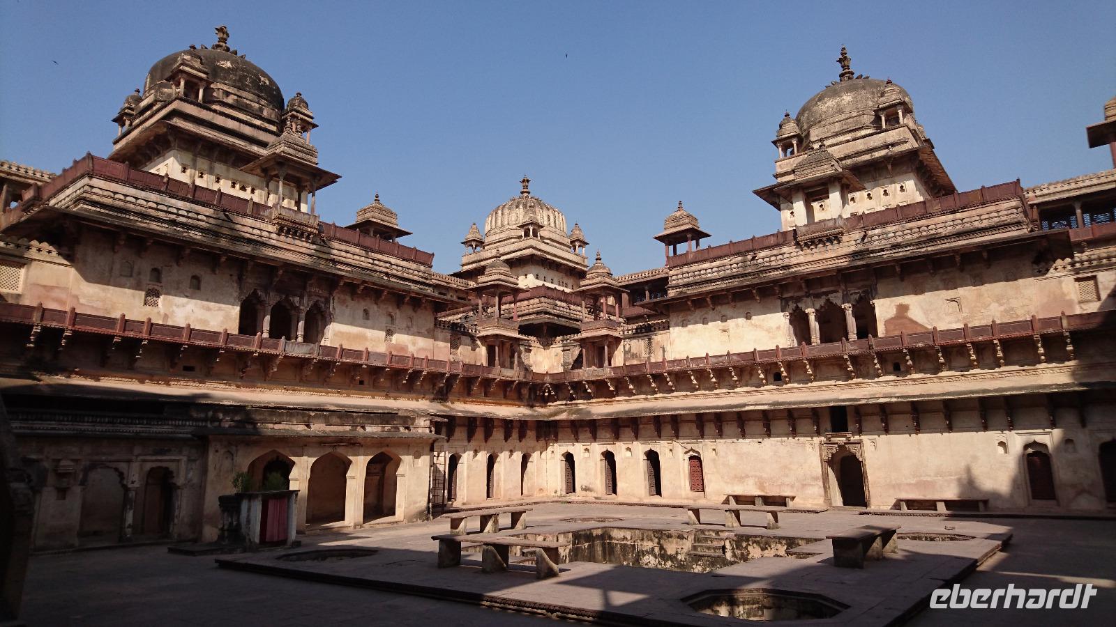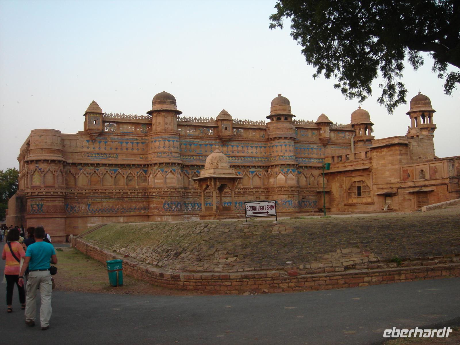 Danach checkten wir aus und die Fahrt ging nun gen Gwalior, wo wir am späten Nachmittag eintrafen und im letzten Tageslicht das Fort hoch über dem Ort besichtigten, darin heilige Kühe und Buckelrinder, aber auch Streifenhörnchen und manchen Vogel entdeckten. Später checkten wir im Hotel ein und genossen das Abendessen. Da dieses Hotel keine Lizenz für den Alkoholausschank besaß, bot uns nach dem gemeinsamen Verzehr des Geburtstagskuchens für Klaus unser Guide Bhawani an, ihn in die Stadt und da vielleicht in eine Bar zu begleiten. Einige von uns nutzten dies und machten so gleich Bekanntschaft mit dem Überqueren einer dicht befahrenen Straße in Indien und mit einer von außen gar nicht zu erkennenden Bar.
