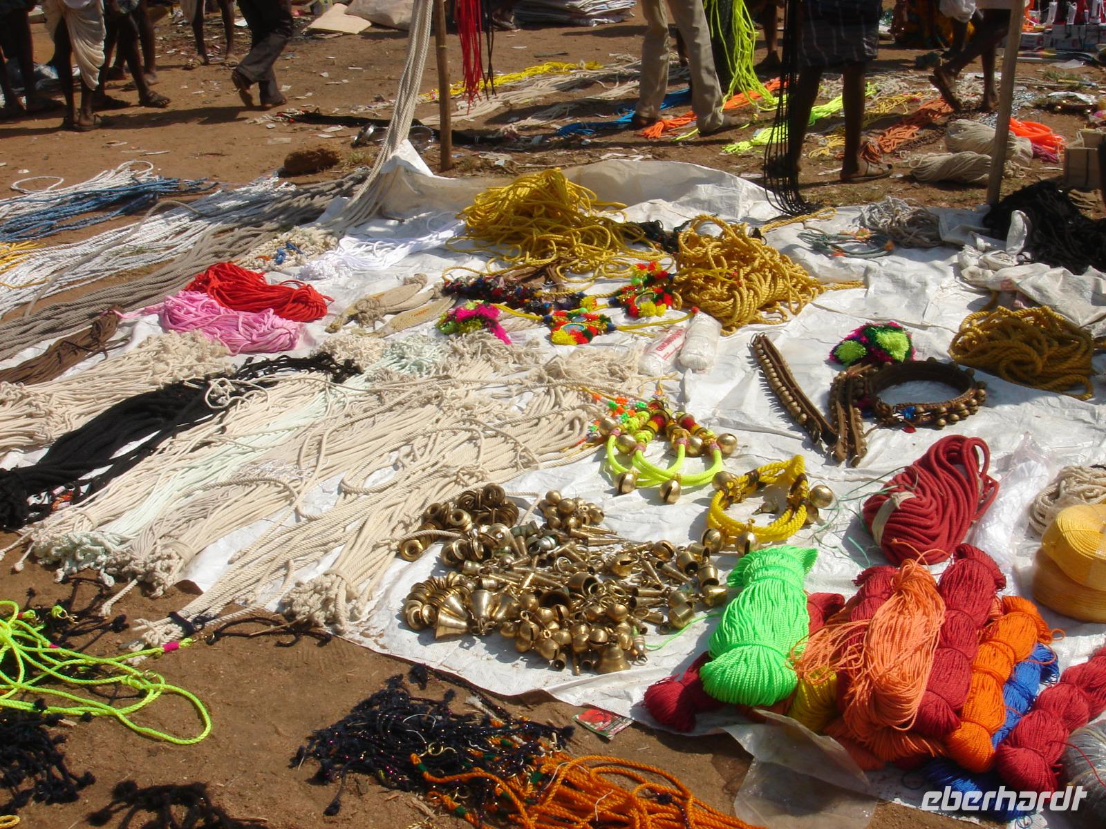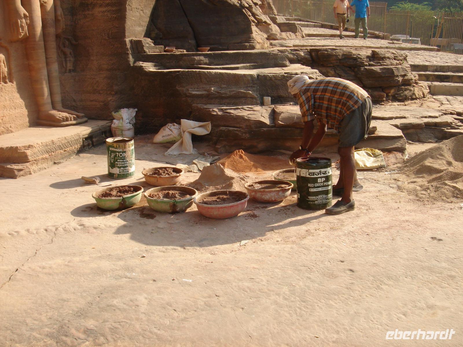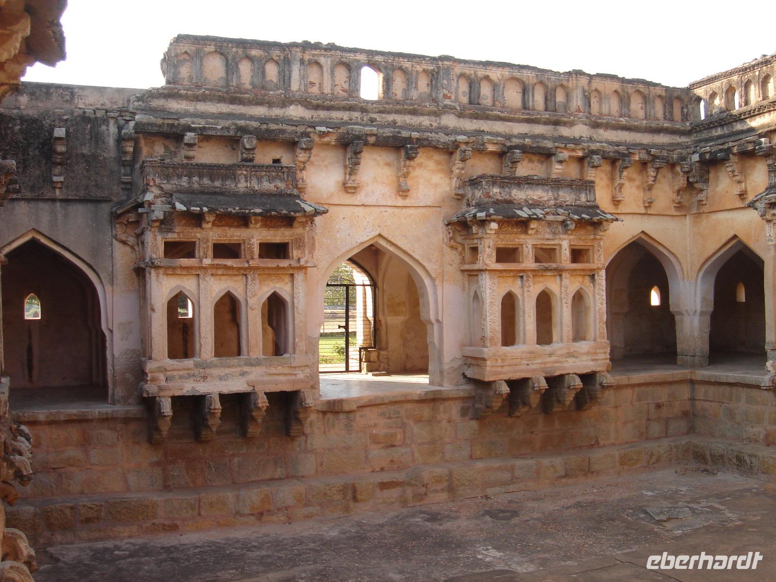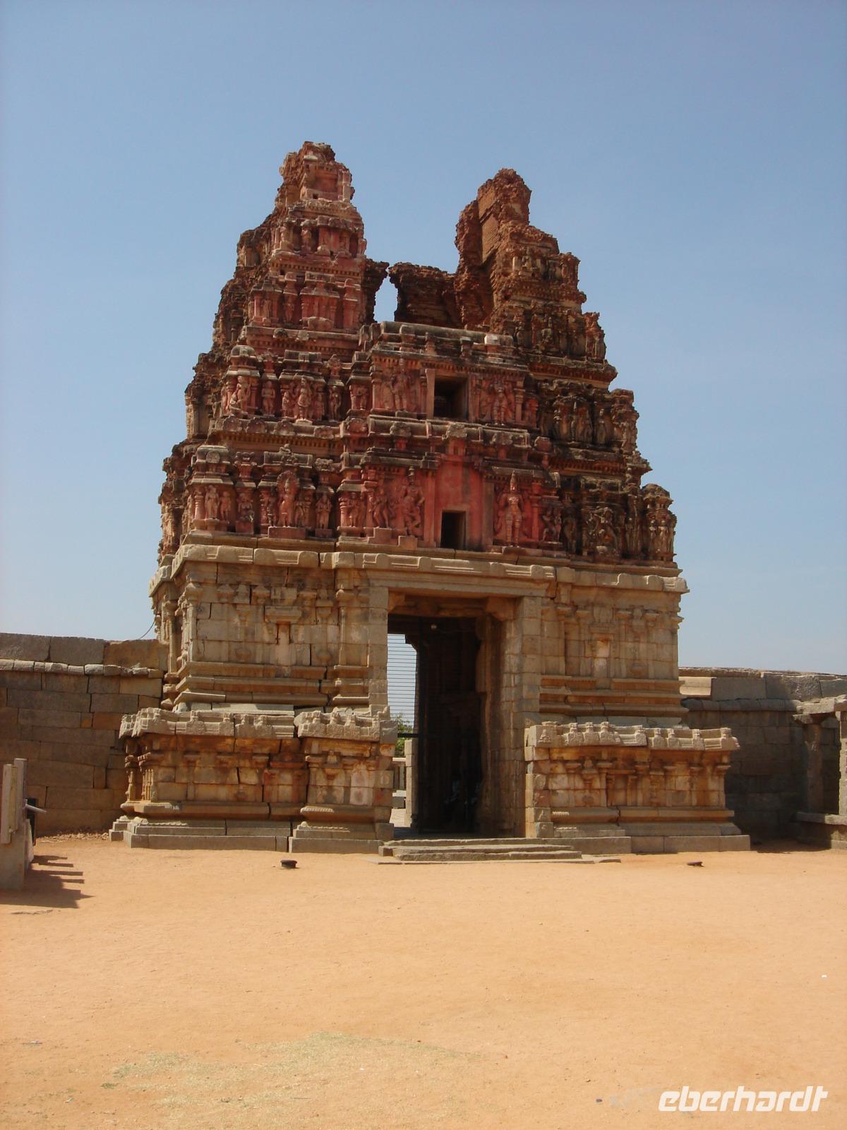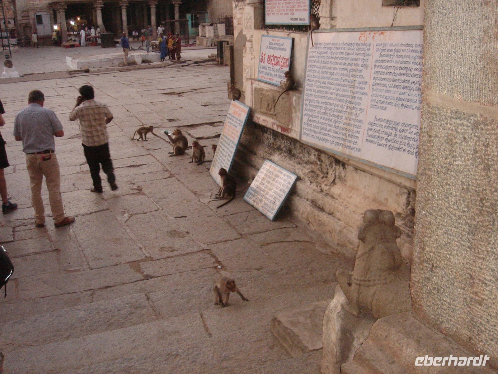 Happy Diwali! Wir schauten Bhawani fragend an, als er uns am Morgen alle umarmte und uns eben diesen Gruß entgegenschmetterte. Das fünftägige Fest begann heute und er berichtete uns, dass es heute neben vielen Freundlichkeiten untereinander vor allem ein Konsumfest ist, zu dem die Geschäfte besonders viel hochwertige Ware orderten, die Inder meist Waren ihrer Begierde Wochen oder Monate vorher dafür vorbestellten, um dann das mühsam erarbeitete oder geborgte Geld umzusetzen und endlich zu bekommen, was man sich so lange wünschte. Vor den Moped- und Motorradgeschäften standen Unmengen nagelneuer Maschinen, die konkurrierenden Mobilfunknetzbetreiber überwarfen sich mit Sonderangeboten und eine innovative Handyherstellerfirma freute sich unheimlich, weil ihre neuen Geräte gerade als Statussymbole manche sonst verschlossene Brieftasche weit öffnete. Also Happy Diwali! Doch wir hatten heute noch ganz Anderes vor. Den Besuch... ja, man ahnt es schon... einer Tempelanlage. Dazu auch noch einer besonders wichtigen. Der von Hampi, wo auf uns ein aus einem Stein gemeißelter Prozessionswagen warten sollte. Auf dem Weg dorthin wurde es immer heißer. Kurz vor der Tempelanlage verließen wir unseren klimatisierten Bus, wurden gleich von Händlern umlagert und fuhren umweltbewusst mit dem Elektromobil zum Anlagenzugang, dabei vorbei an unzähligen ehemaligen und neu errichteten Handelsständen verschiedener diese Anlage über die Jahrhunderte nutzenden Nationen, Religionen und Menschen. Die Anlage bot viel zu sehen. Shiva war in all seinen Reinkarnationen vorhanden, luftbekleidete Damen mit plastischem Körper und Mangobusen fanden sich als Relief in ähnlichen Formen, wie bereits vorher an anderer Stelle gesehen. Was wir hier jedoch das erste Mal entdeckten war, dass alle Erklärtafeln neben verschiedenen Schwarzschriftsprachen auch in Brailleschrift für Blinde und Sehbehinderte bereit standen.