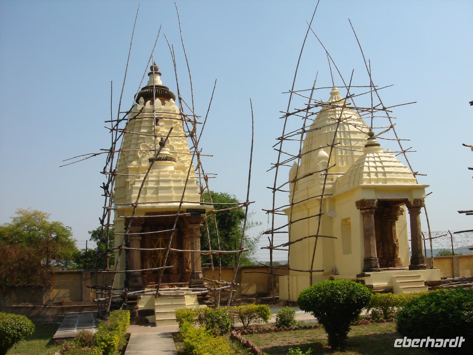 Am Morgen geht die Sonne auf. In Indien wird es dabei gleich sehr heiß. Noch hatten wir uns nicht an die Hitze gewöhnt und stöhnten, wenn wir aus dem stets gut klimatisierten Bus hinaus in die Umwelt traten. Doch dann stockte uns der Atem. Nicht die Hitze war daran schuld, sondern die aus dem Felsen gehauenen heiligen Figuren der Buddhagrotten von Gwalior. Einzigartig! Wir besichtigten alles intensiv, freuten uns, dass wir sogar auf den Figuren und in den Höhlen herumlaufen konnten, was in Deutschland sicher niemals möglich gewesen wäre, erfuhren, dass die Grotten wie viele andere noch zu entdeckenden Sehenswürdigkeiten von der UNESCO zum Weltkulturerbe gemacht wurden. Dann, als eine Mädchengruppe eben begann, vor den Grotten ihren gymnastischen Sport zu betreiben, fuhren wir noch einmal hinauf zum Fort und genossen die Sicht auf Stadt und Umgebung am Morgen, ehe wir die weite Fahrt nach Khajuraho antraten, welches wir am Abend erreichten, dann gleich im Hotel eincheckten und nach dem Abendessen schnell einschliefen.