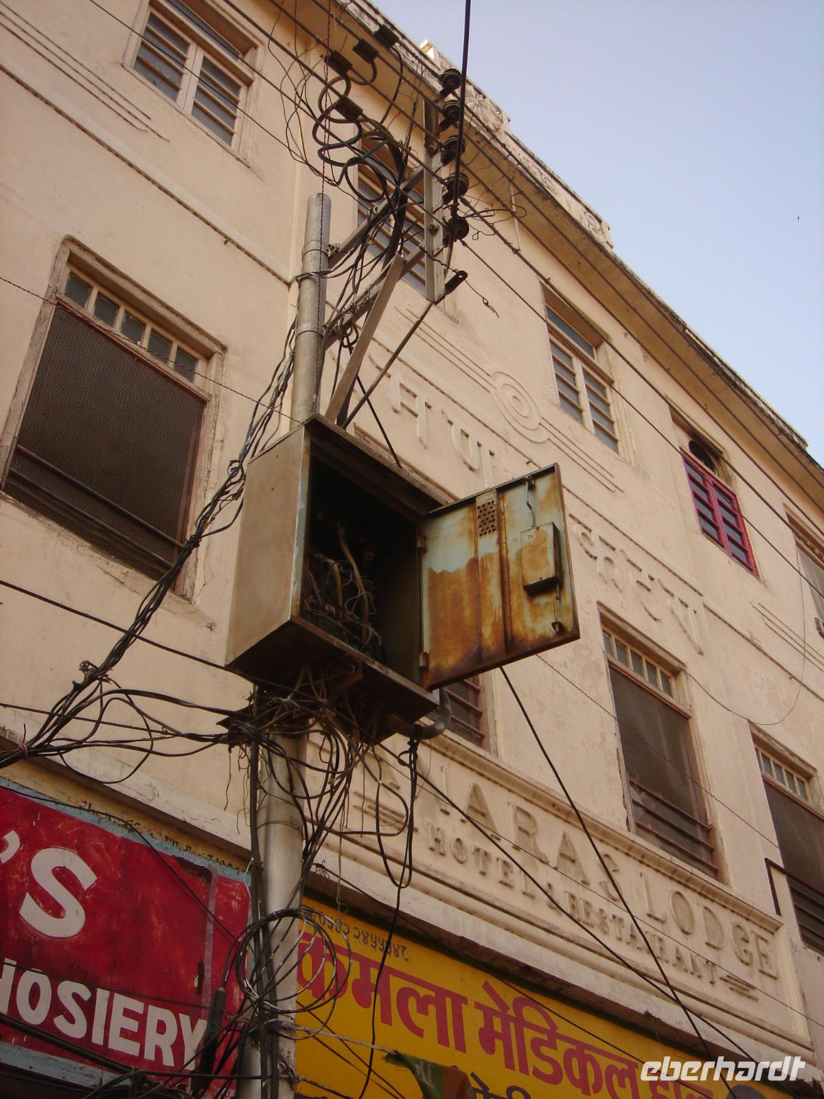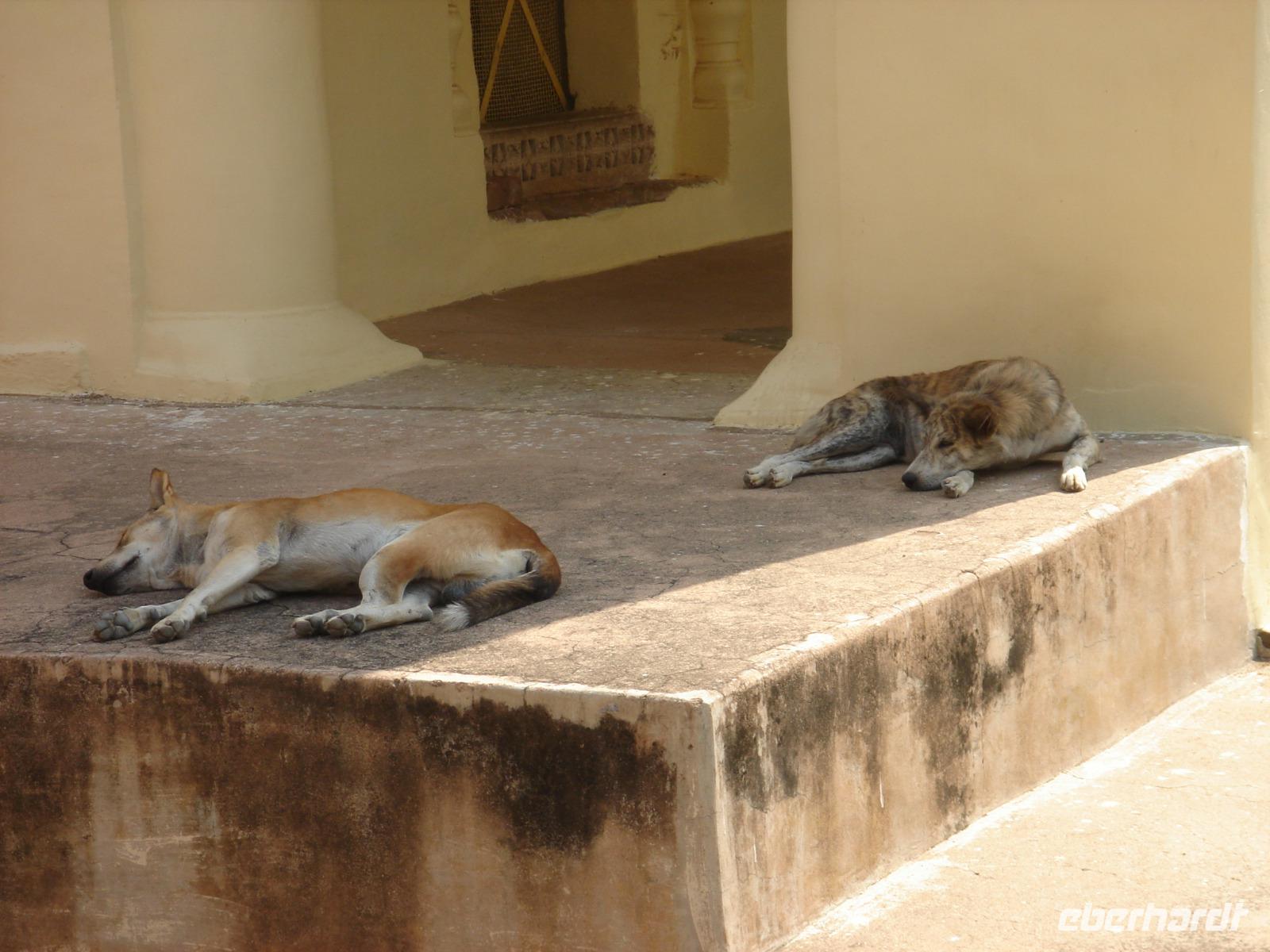 Wenige Stunden Schlaf waren uns vergönnt, doch wir wollten ja in Indien einiges sehen. Also saßen wir bald beim Frühstück, räumten dann die Zimmer und fanden uns vor dem Hotel wieder, von wo uns Bhawani gleich zum Spaziergang zum ersten Tempel um die Ecke einlud. Umherstreunende Hunde und etwas andere Ordnung in den Straßen boten uns einen ersten Eindruck von dem, was uns die nächsten Tage und Wochen erwarten würde.
