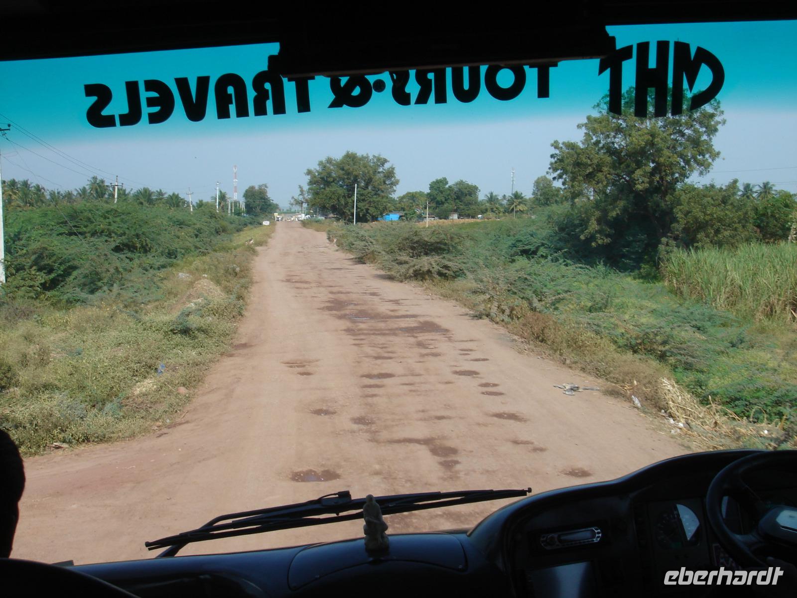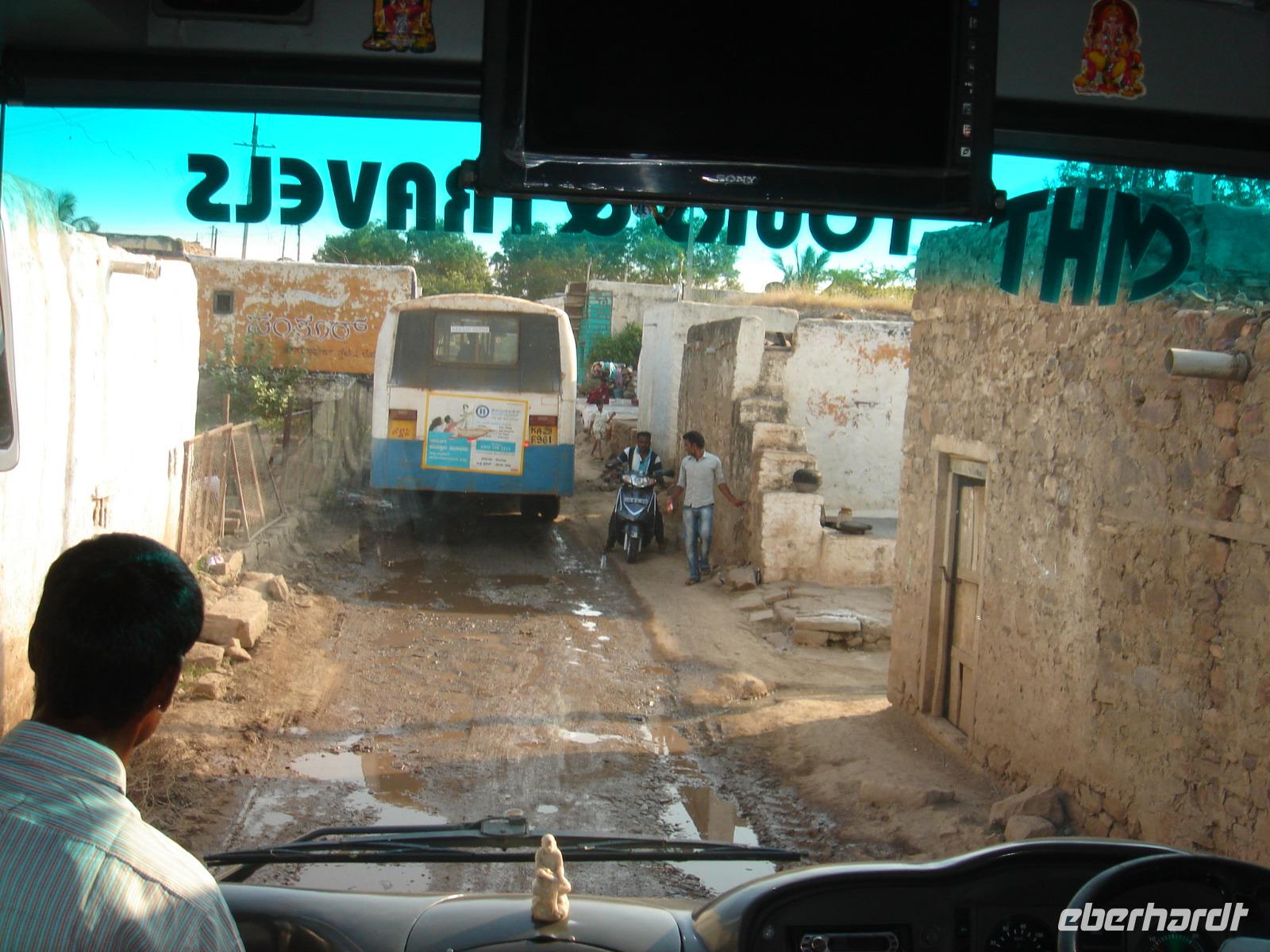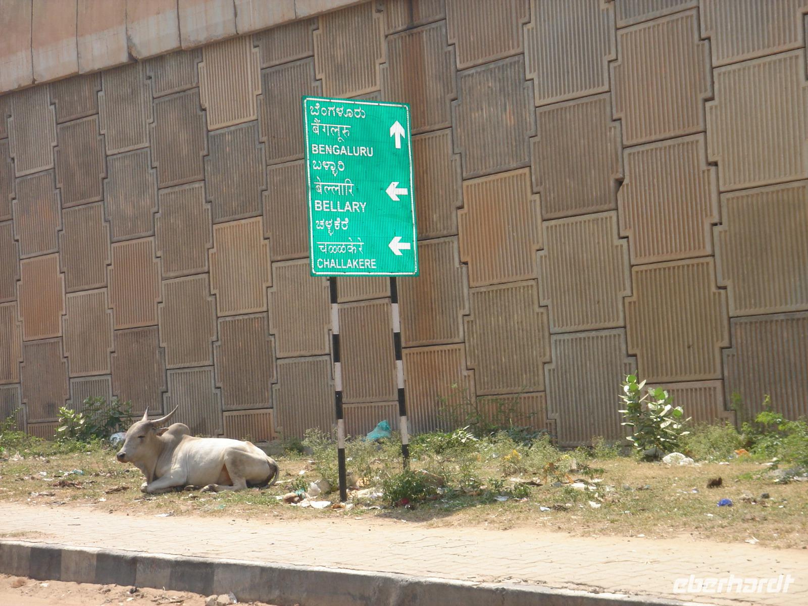 Nicht überall kann man fahren, nicht überall fliegen. Zum Fliegen benötigt man einen Start- und einen Zielflughafen. Zum Fahren reicht manchmal auch einem Bus ein Feldweg aus. So machten wir uns auf den Weg vom Hotel nach Bangalore. Lange Stunden Fahrt mit vielen Fotostopps an Vogelreservaten, Badeflüssen, Tankstellen, kleinen Orten lagen am Abend hinter uns. Heilige Kühe wanderten auf den besseren wie auch auf den schlechter ausgebauten Straßen herum und zwangen nicht nur uns zu akrobatischen Vorbeifahrt- oder Bremsmanövern und wir bemerkten einmal mehr, dass unser Fahrer, den man in der Branche auch ‚den Tiger' nannte, sehr gut mit dem Bus umgehen uns dich auf den Straßen auskennen musste, um dies ohne Unfall, Schaden oder zu ärgerlichem Geruckel für die Reisegäste zu meistern. Trotzdem rosteten unsere Rücken auf der Strecke etwas ein und wir waren froh, uns am Abend im Hotel in Bangalore strecken und nach dem Abendessen ausruhen zu können.