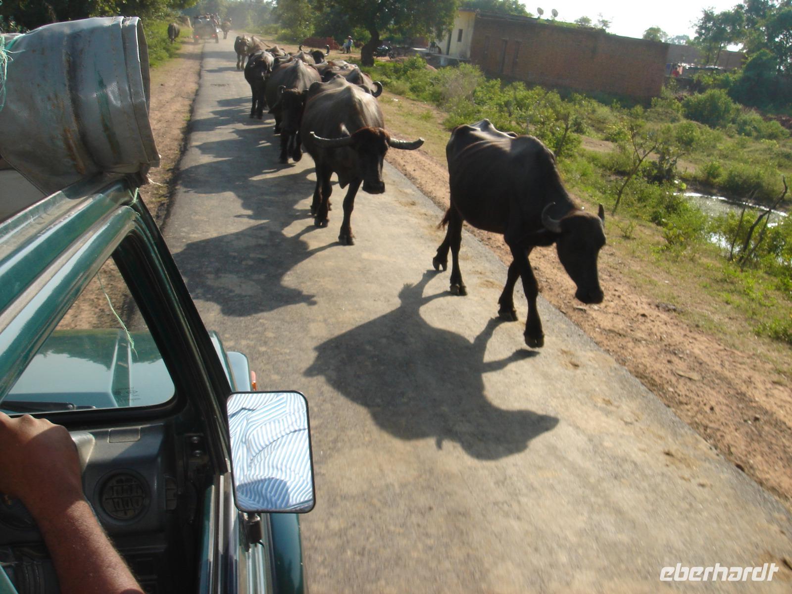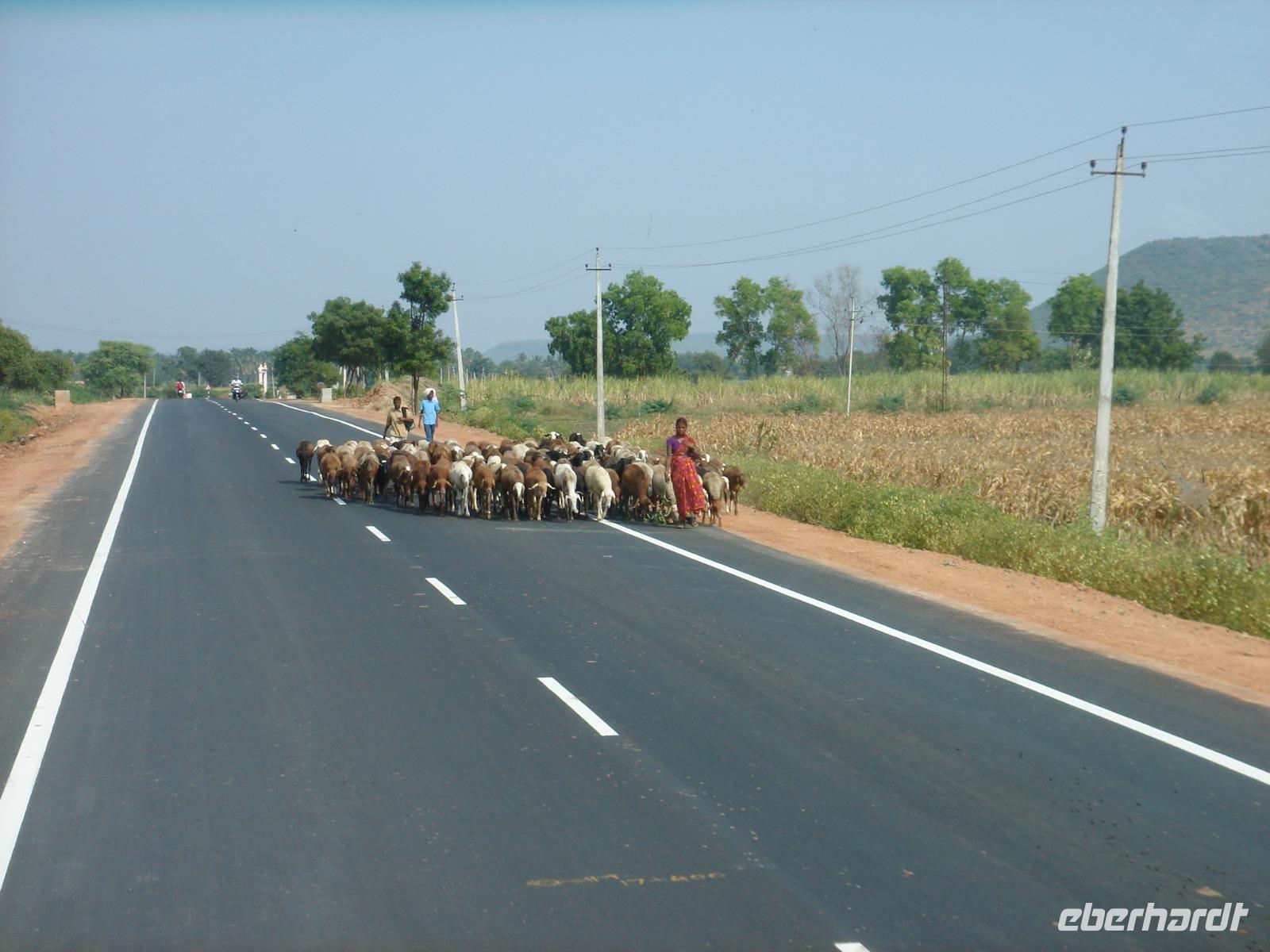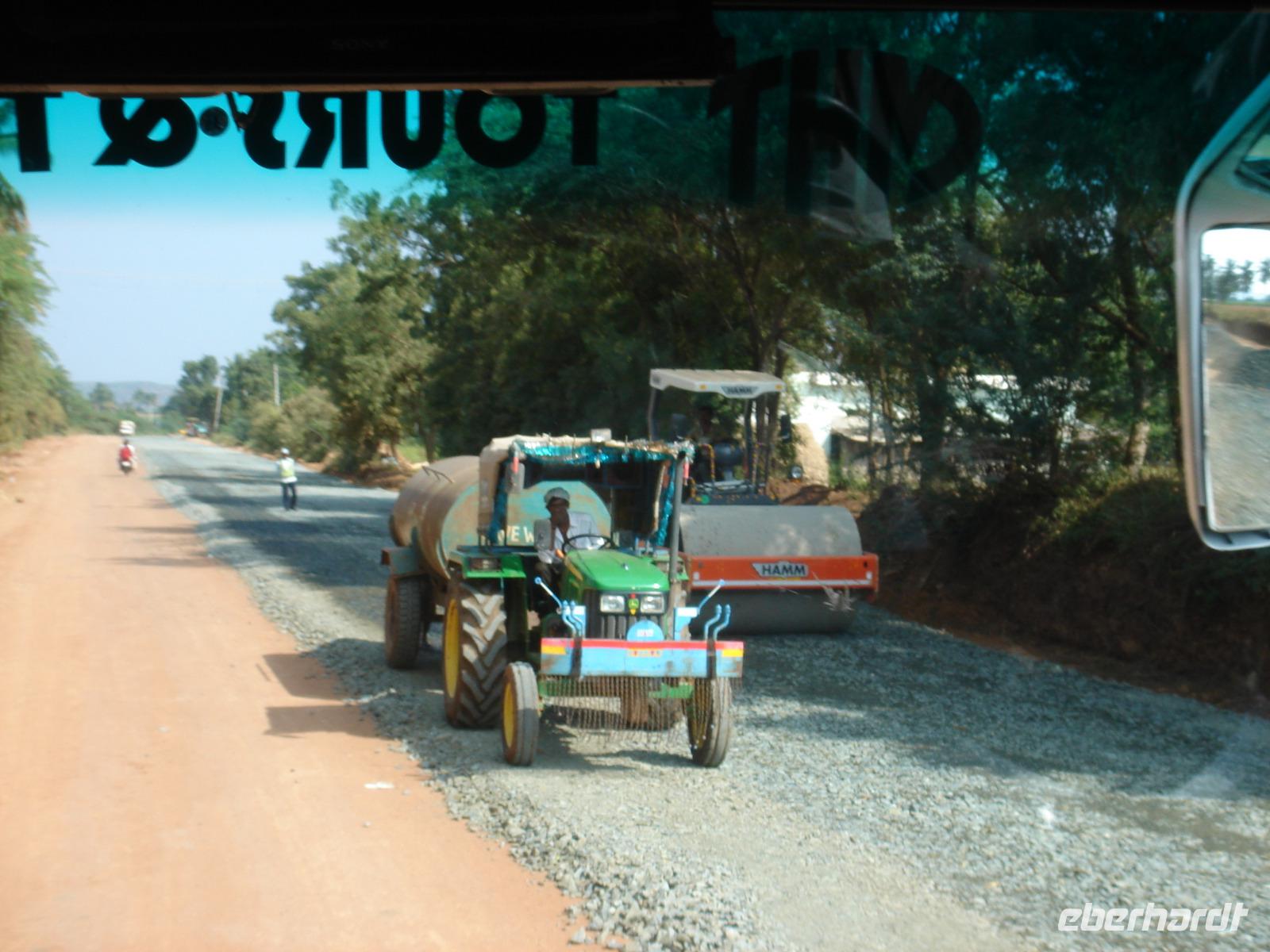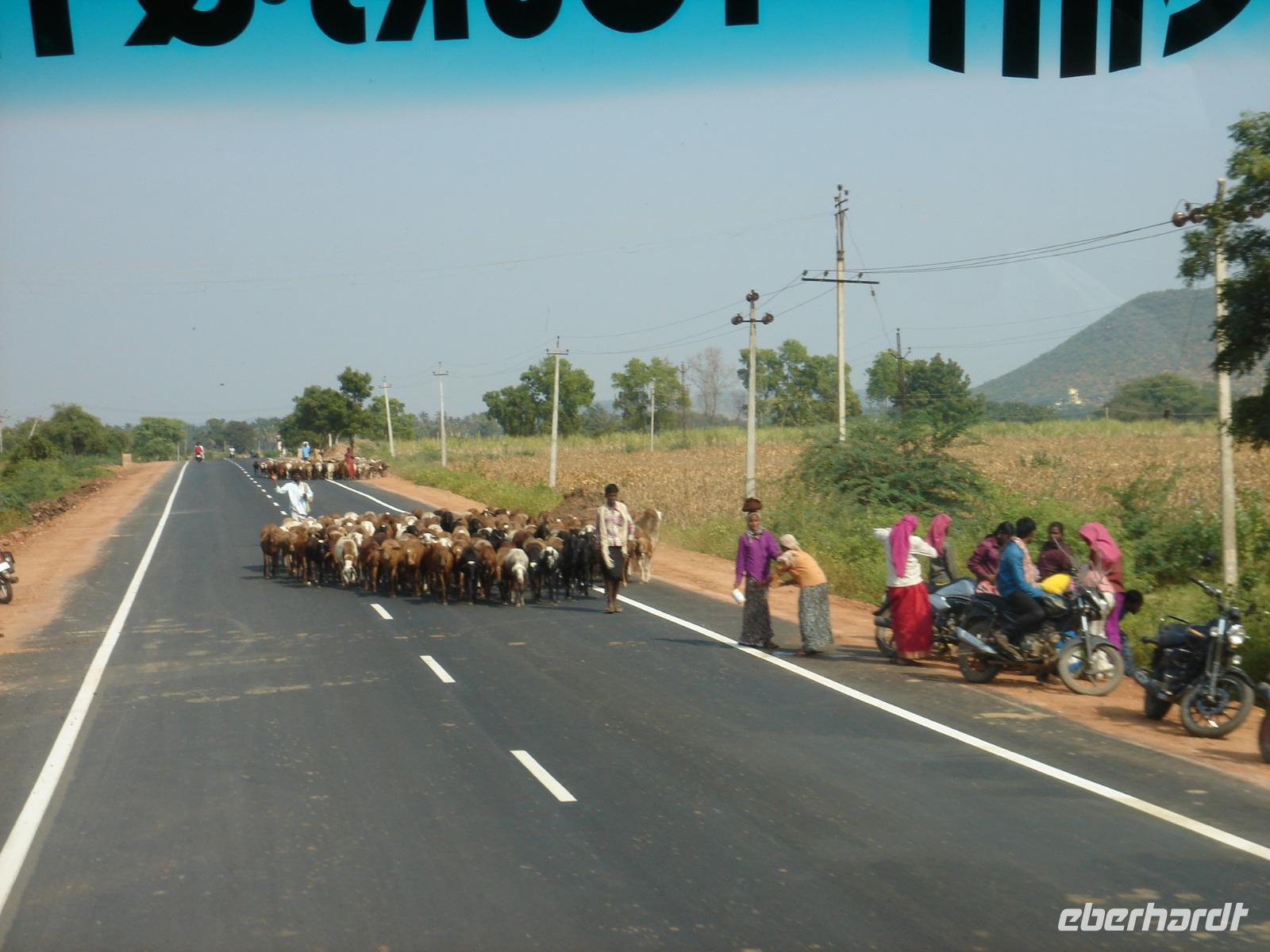 Nicht überall kann man fahren, nicht überall fliegen. Zum Fliegen benötigt man einen Start- und einen Zielflughafen. Zum Fahren reicht manchmal auch einem Bus ein Feldweg aus. So machten wir uns auf den Weg vom Hotel nach Bangalore. Lange Stunden Fahrt mit vielen Fotostopps an Vogelreservaten, Badeflüssen, Tankstellen, kleinen Orten lagen am Abend hinter uns. Heilige Kühe wanderten auf den besseren wie auch auf den schlechter ausgebauten Straßen herum und zwangen nicht nur uns zu akrobatischen Vorbeifahrt- oder Bremsmanövern und wir bemerkten einmal mehr, dass unser Fahrer, den man in der Branche auch ‚den Tiger' nannte, sehr gut mit dem Bus umgehen uns dich auf den Straßen auskennen musste, um dies ohne Unfall, Schaden oder zu ärgerlichem Geruckel für die Reisegäste zu meistern. Trotzdem rosteten unsere Rücken auf der Strecke etwas ein und wir waren froh, uns am Abend im Hotel in Bangalore strecken und nach dem Abendessen ausruhen zu können.