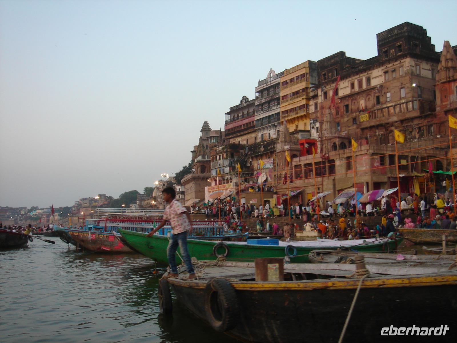 Zeitig am Morgen waren wir wach, fuhren diesmal mit dem Bus zum Ganges, sahen dann auf dem letzten Fußwegstück Menschen, die nach Varanasi kamen, um hier ihr Leben zu beenden, erlebten wieder vom Boot aus die morgendliche Tempelöffnung, fuhren noch ein gehöriges weiteres Stück den Fluss entlang, ehe wir zum verspäteten Frühstück ins Hotel zurückkehrten, dann noch einige Tempel in der Umgebung besuchten, am Abend ein wenig nahe des Hotels shoppten und uns darauf freuten, am nächsten Tag weitere Gäste zur Gruppe zu bekommen und in einen zumindest vom Namen her für uns Europäer recht bekannten Ort und Bundesstaat zu kommen. Farben, Rufe, Segnungen, Verkehr, all das waren ganz neue Eindrücke für uns, die wir erst einmal zu verarbeiten hatten.