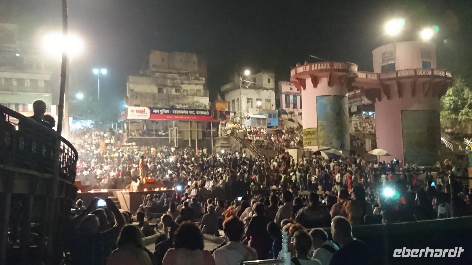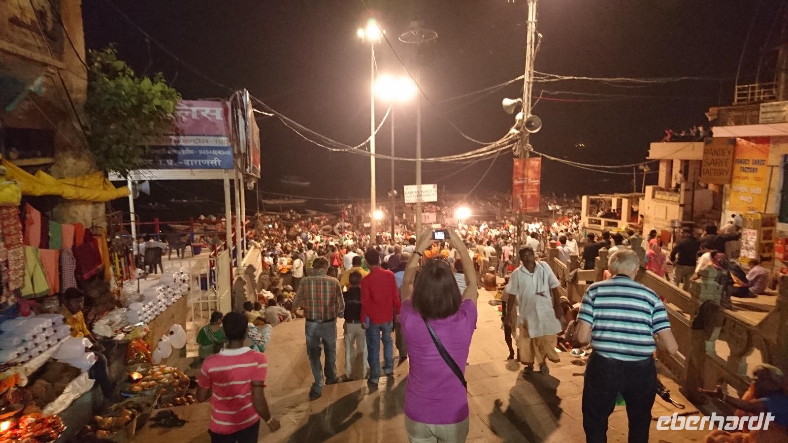 Weite ist in Indien relativ. Hat man viel Zeit, kann man pilgern und dabei zu Fuß gut und gerne Hunderte, wenn nicht gar tausende Kilometer zurücklegen. Nichts für uns. Wir wollten in eine der heiligsten Stätte Indiens und wählten dazu den Flieger. Vorher feierten wir erst den Geburtstag unseres Alterspräsidenten, der majestätisch den Turban entgegennahm und ebenso fleißig trug. Dann ging es zum Flughafen. Am späten Nachmittag landeten wir in Varanasi, checkten im Hotel ein und trafen uns bald wieder zur Rikschafahrt zum Ganges, wo wir die allabendliche Tempelschließungszeremonie erleben wollten. Dabei waren wir nicht unbedingt allein. Tausende schoben sich oder fuhren gleich uns durch die engen Straßen. Das Hupen der TukTuks, das Klingeln der Rikschas, die Rufe der Fußgänger, dazwischen ruhig mitten im Wege herumliegende heilige Kühe, uns in der Hoffnung auf ein Geschäft begleitende fliegende Händler, ein für uns undefinierbarer Geruch über der Stadt, gleißendes Licht und doch stets freundlich schauende Inder stimmten uns auf das ein, was wir am Fluss der Flüsse erleben sollten. An den Ghats versammelten sich tausende. Wir mieteten ein Boot und fuhren ein Stück auf den Fluss hinaus, von wo wir einen guten Blick auf die Zeremonie, andere Boote, Tempel, weitere Ghats am Ufer und den Hauptverbrennungsplatz Varanasis hatten. Jeder von uns setzte eine brennende Schwimmkerze ins Wasser, verbunden mit einem sicher erfüllbaren Wunsch, ehe wir nach der beeindruckenden Zeremonie wieder an Land gingen und mit den Rikschas zum Abend- und Geburtstagskuchenessen, einem kleinen desinfizierenden Umtrunk und Schlafen ins Hotel zurückkehrten.