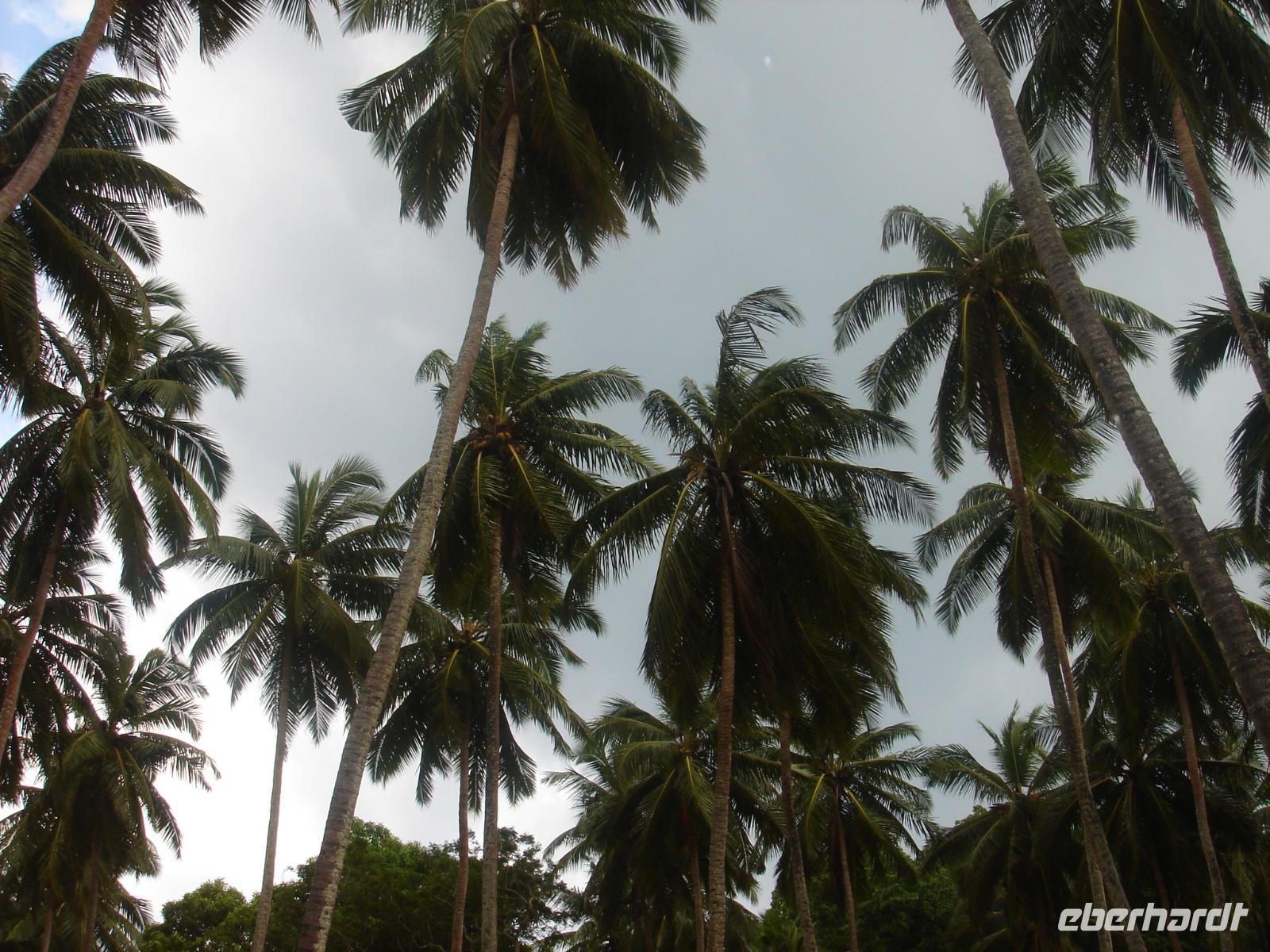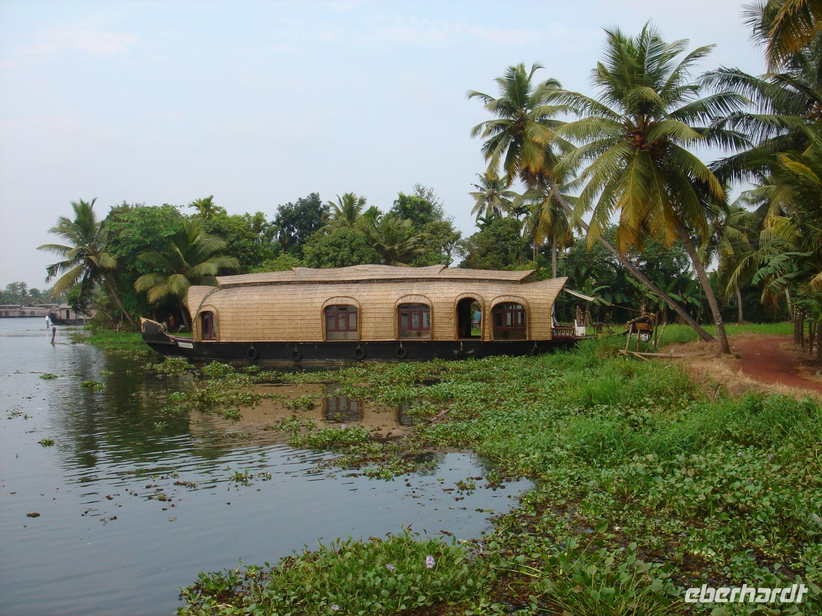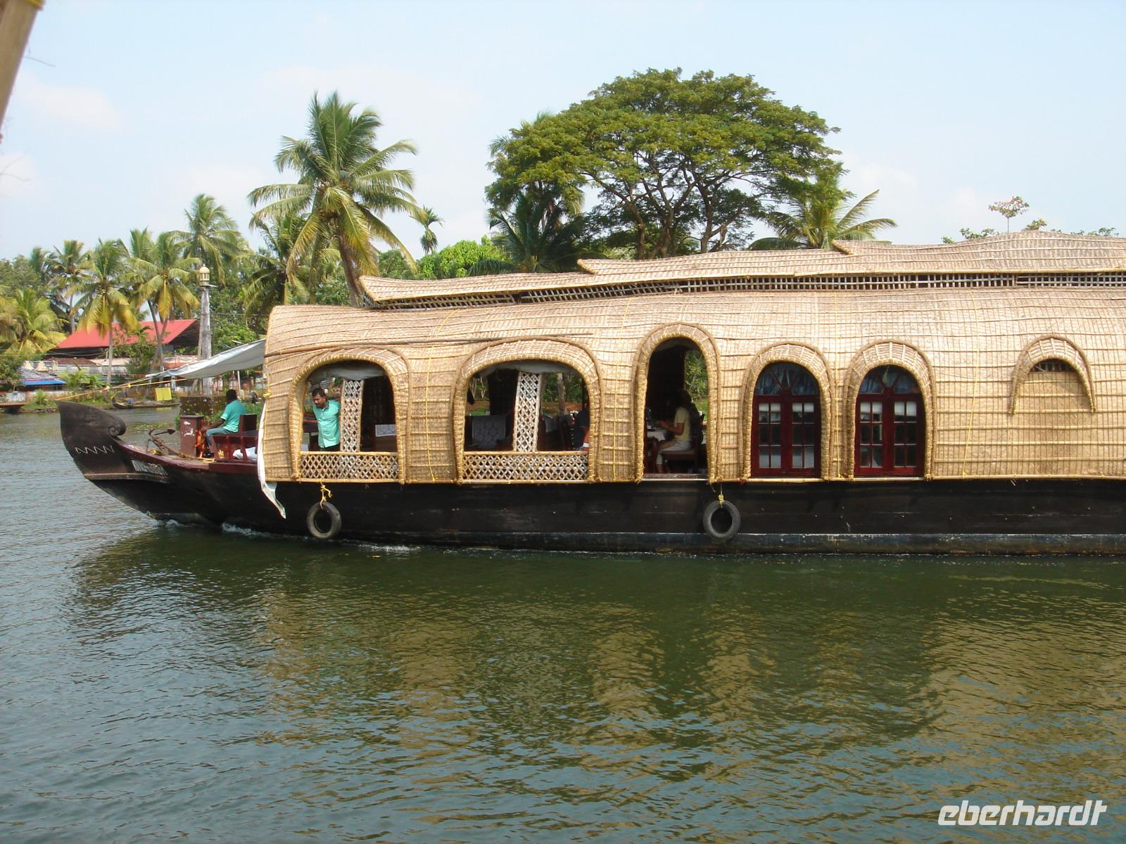 In Indien feierte man schon einige Tage, aus Deutschland erreichten uns heute Meldungen zum dortigen kaum mehr gefeierten und nur noch in Sachsen freien Feiertag, dem Reformationstag. Darum umarmten wir uns heute am Morgen vielleicht noch ein wenig intensiver und freuten uns auf einen tollen Tag. Die Fahrt begann damit, dass wir nach einer Weile eine Kokosseilerei besuchten. Vielleicht kann man diese auch als Kokosweberei bezeichnen? Da werden nicht nur aus der Ummantelung der Kokosnüsse Seile gemacht, sondern aus diesen in verschiedenen Dicken und Farben Teppiche und andere nützliche Dinge gefertigt. Dies geschieht auf stabilen und besonders großen Webstühlen, an denen jeweils zwei Weber arbeiten. Dann jedoch ging es weiter zum absoluten Highlight der Tour. Kann man das so sagen? Ja und nein. Es gab so vieles bisher, was besonders war. Trotzdem freuten wir uns sicher nicht zu Unrecht auf die kommenden Stunden. Wir fuhren nach Aleppey, einen Ort, den jeder Inder gern besuchen möchte. Sicher gibt es da auch einen Tempel, aber der ist nicht der Grund für diese Sehnsucht, die wir ebenso teilten. In Aleppey legen die Hausboote der Backwaters an und ab. Wir erledigten das Check-in, welches nicht viel anders ablief, als jenes fast jeden Abend im neuen Hotel. Dann brachte uns eine kleine Barkasse hinaus zu unseren vier Hausbooten, auf denen wir nun einen guten Tag zubringen würden. Freundlich wurden wir begrüßt, man zeigte uns unsere Zimmer auf den Booten und bat uns schon zum Mittagessen. Später legten die Boote ab und wir fuhren auf den Backwaters, sahen viele Tiere, Entenschwärme, legten nahe eines kleinen Marktes an, genossen später die Ruhe der Fahrt und ließen uns dabei von unserer drei Bediensteten je Boot mit Kaffee, Süßigkeiten, frisch gepresstem Saft und später Abendessen verwöhnen. Am Abend legten wir alle gemeinsam an, blieben aber auf dem Boot, um am Morgen zum Frühstück wieder ein Stück auf dem Wasser zurückzulegen.