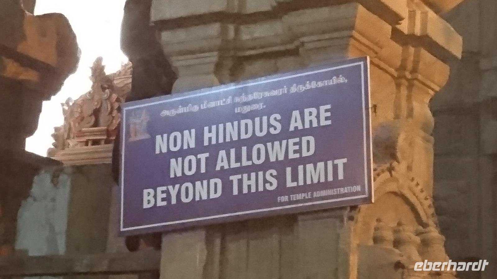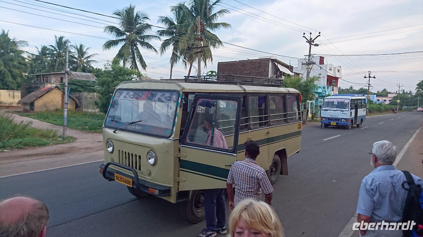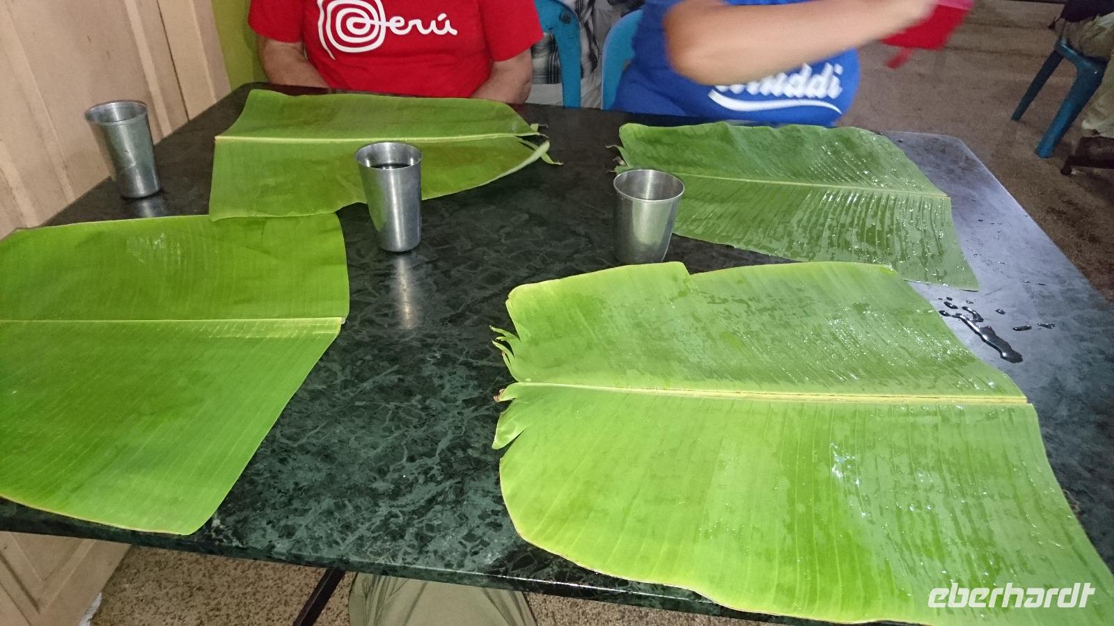 Heute war unser Ziel Thanjavore. Die Fahrt dahin war lang und Bhawani hatte schon gute Ideen, wo wir für Bedürfnisse, die sich nicht aufschieben ließen, aber auch fürs Mittagessen anhalten würden. Bis zum zeitigen Nachmittag lief auch alles nach Plan. Doch dann erreichten wir jenes Hotel, in dem ein Tisch für unser Essen bestellt war. Zuversichtlich fuhren wir zur Dachterrasse hinauf, doch da verkündete man uns, dass wir eine gute halbe Stunde auf das essen oder den freien Tisch warten müssten. Zeit die wir aufgrund der Fahrtstrecke einfach nicht hatten. Doch Bhawani, unser Organisationskünstler, hatte gleich eine andere Idee, für die er sich laufend entschuldigte, was wir gar nicht verstanden. Er führte uns nämlich in ein typisches Mittagsrestaurant der Inder. Etwas spartanisch eingerichtet, mit einem kleinen Gebetsort versehen, sah es erst nach unserem Verständnis nicht einladend aus. Doch dann saßen wir an den Tischen und vor uns lagen Bananenblätter. Diese wurden mit Wasser gereinigt und wenig später erschien ein Mann, der uns auf die Blätter verschiedene mit Gewürzen angebratene Gemüse legte, dazu Reis verteilte. Besteck? Fehlanzeige. Dafür Wasser zum Reinigen der Hände, Servietten und... Finger Unsere eigenen Finger. Aufpassen! In Indien gilt die linke Hand als unrein. Also nicht damit in den Speisen herumrühren oder gar essen. Es war lustig und eine ganz neue Erfahrung. Satt wurden wir uns wollen dieses Erlebnis auf keinen Fall missen. Nein, Bhawani, dafür musst Du Dich absolut nicht entschuldigen!!! Dann ging es weiter zum Tempel von Thanjavore und nach diesem Erlebnis schließlich ins Hotel, wo wir fast traurig auf Messer, gabel und Löffel schauten, dann jedoch lieber nach unseren europäischen Grundsätzen aßen. Wir waren schließlich nicht die einzigen Touristen im Hotel!
