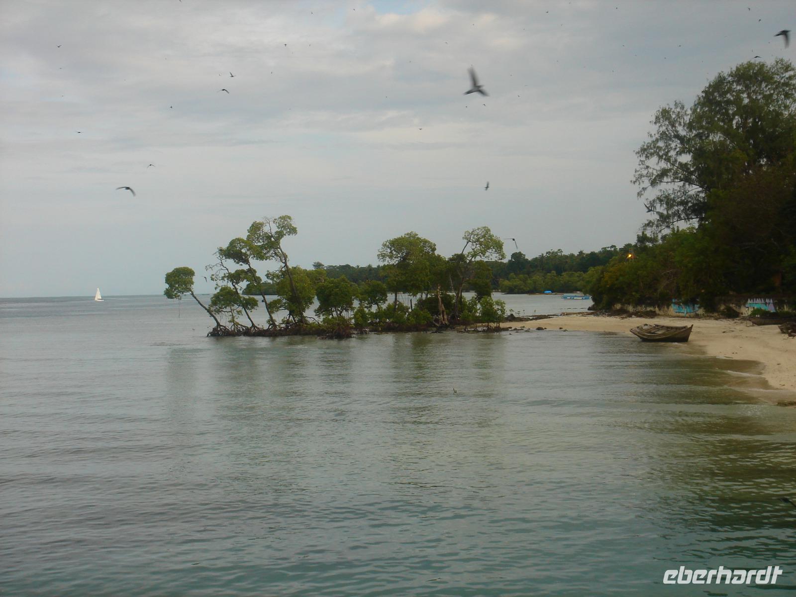 Mitten in der Nacht aufstehen? Ja, wir wagten es denn wir hatten eine lange Fahrt vor uns, die zudem an Termine gebunden war. Woher kommen die Zigeuner? Auch von den Andamanen, wo sie nördlich von Port Blair ein riesiges Gebiet bewohnen und eigentlich keinerlei Kontakt zur Außenwelt haben wollen. Nach verschiedenen Zwischenfällen in den vergangenen Jahrzehnten, durchqueren Fahrzeuge dieses Gebiet heute nur noch per geschütztem Convoy. Bewaffnetes Militär steigt an einem Checkpoint zu und nur zu bestimmten Zeiten setzt sich solch ein Convoy in Bewegung. Hat man das geschützte Gebiet durchquert, landet man an einem kleinen Fährhafen. Die Fähre brachte uns hinüber zu den Mangrovenwäldern, die wir dann per Schnellboot durchquerten und anschleißend zu einer kleinen Tropfsteinhöhle wanderten. Danach ging es noch zu einem zu wissenschaftlichen Zwecken genutzten Schlammvulkan und schließlich nahmen wir noch am Fährhafen ein leckeres Mittagessen ein, ehe es in gleicher Art und sehr spät am Abend zurück nah Port Blair ging. Gier genossen wir das Abendessen und feierten dann noch spontan mit einem guten indischen Whisky den letzten Tag auf den Andamanen.