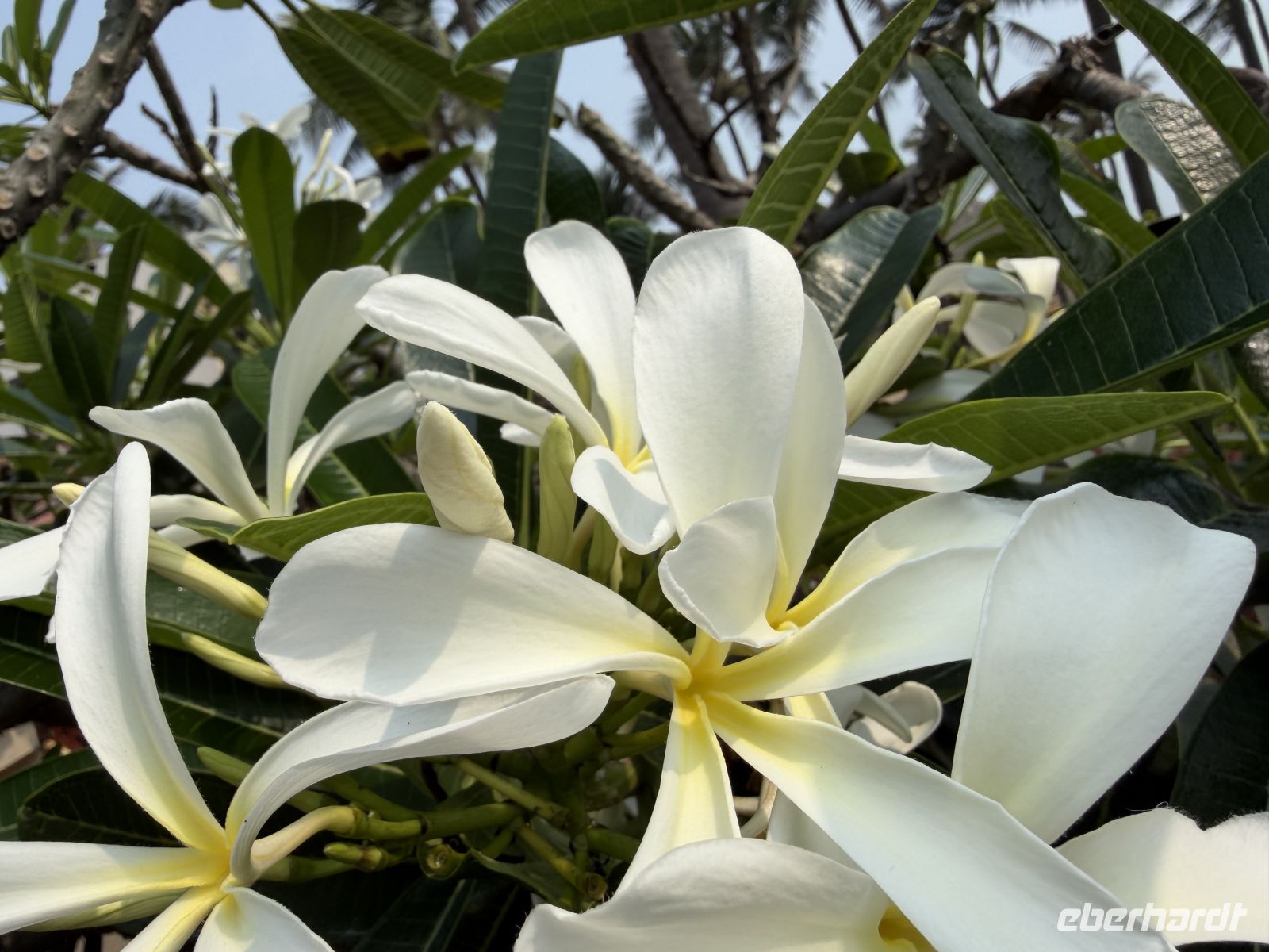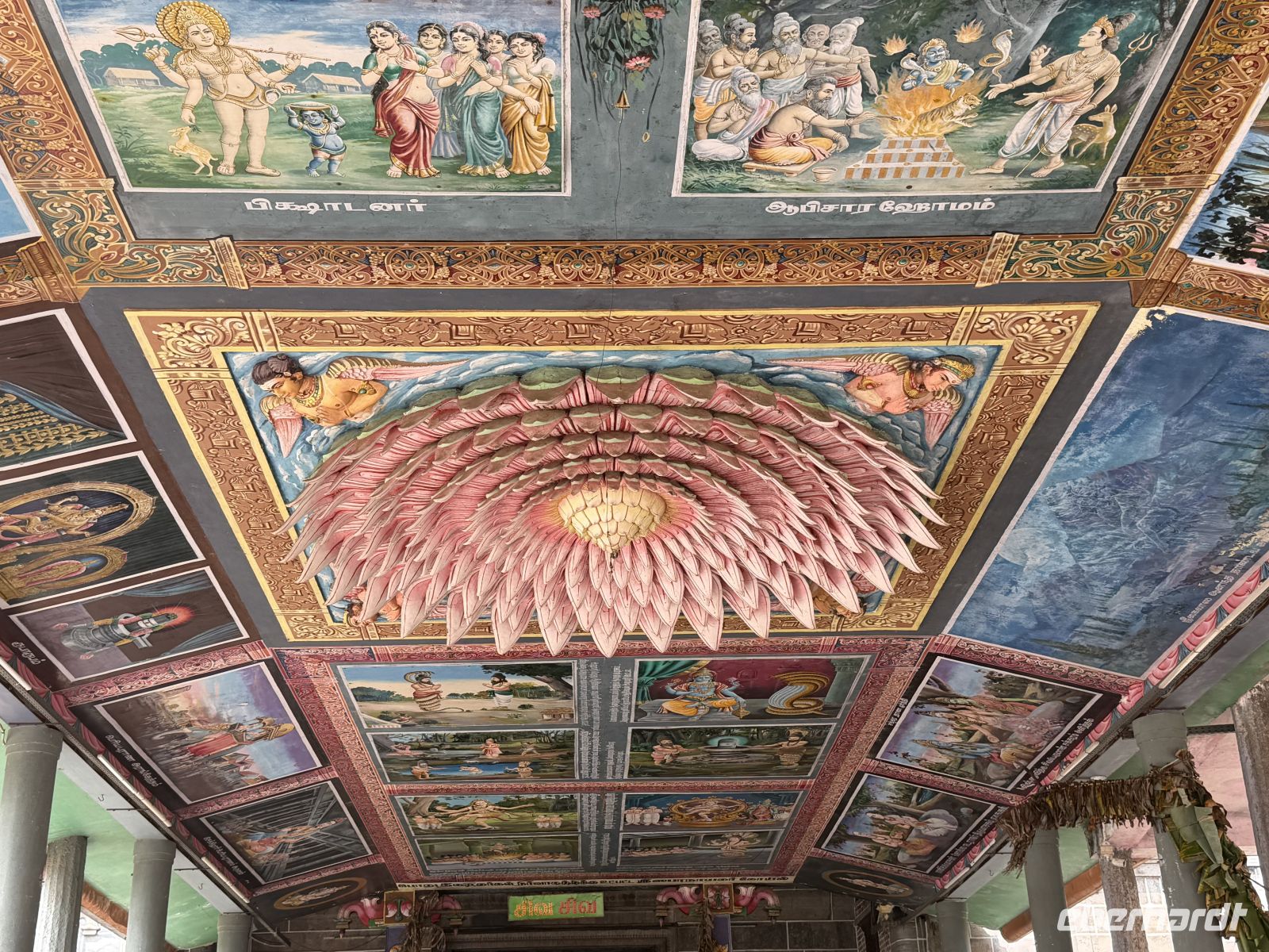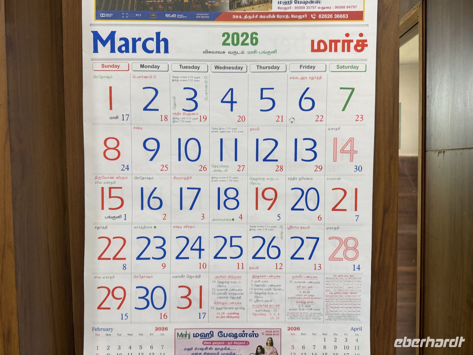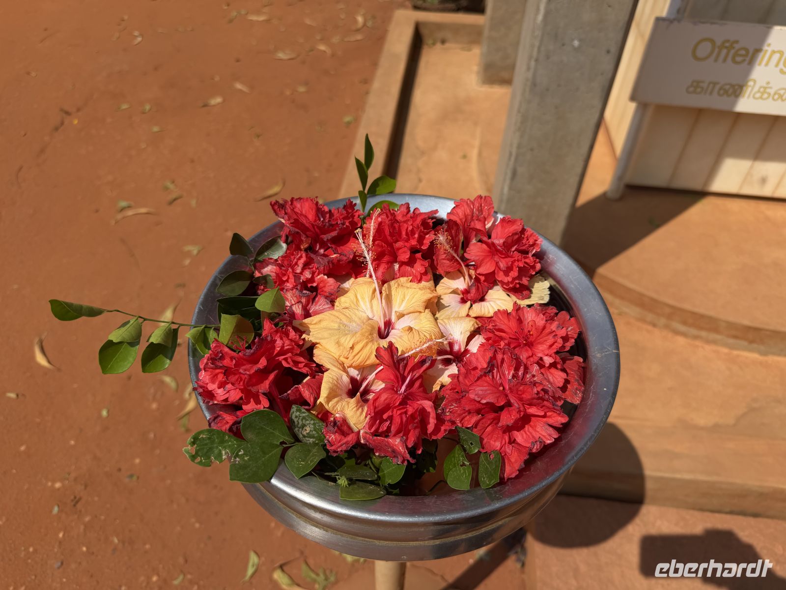 Heute geht es nach Kumbakonam, was im fruchtbaren Cauvery Delta in Tamil Nadu liegt. Erstes Ziel, Chidambaram mit dem Nataraja Tempelkomplex. Auf dem Weg erzählt uns Bhawani, wie eine hinduistische Beerdigung abläuft mit seinen Ritualen und die damit verbundenen familiären und beruflichen Gegebenheiten. Wir fahren am heiligen Kalveri Fluss vorbei. Der südliche Fluss ist genauso heilig, wie der Ganges im Norden, jedoch nicht so verschmutzt. Die Chola Dynastie brachte eine leicht andere Bauweise mit sich. Der Tempelkomplex ist der Reinkarnation Shivas als Nataraja (Herrn des Tanzes) geweiht. Der kosmische Tanz, der die Schöpfung und Auflösung symbolisiert. Ursprünglich vor dem 7.ten Jh. erbaut und in der heutigen Struktur zwischen 10.-13. Jh. unter den Cholas erweitert. Vier monomentale Gopurams (Eingangstürme), das goldbedeckte Heiligtum und 108 Tanzdarstellungen, die in Stein gemeißelt sind. Sie stellen die Körperhaltung mit Arm und Beingestiken da. Die Darstellungen sind genaue Ablaufpläne der ältesten systematischen Tanzgrammatiken der Welt, sozusagen der Grundbaustein aller klassischen indischen Tanzformen. Wir beobachten die Brahmanen, wie sie mit ihren Henkelmännern zur Arbeit kommen. Natürlich oberkörperfrei, damit die kosmische Energie fließen kann. Wir sind beeindruckt von den wunderschönen bunten Decken und Gemälden an den Wänden. Auf dem Gelände wachsen Kanonenkugelbäume, die wunderschöne Blüten hervorbringen.