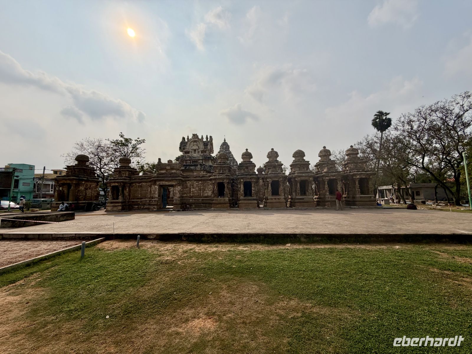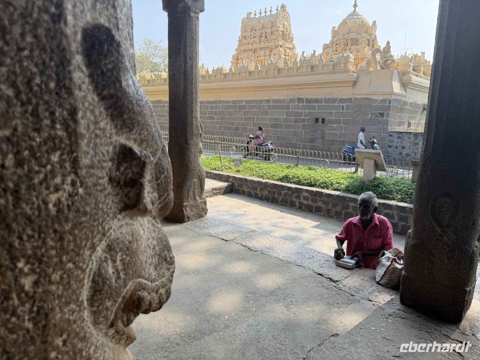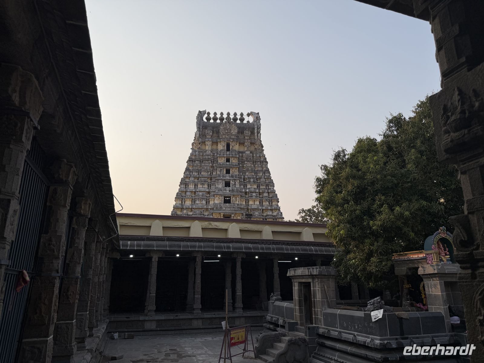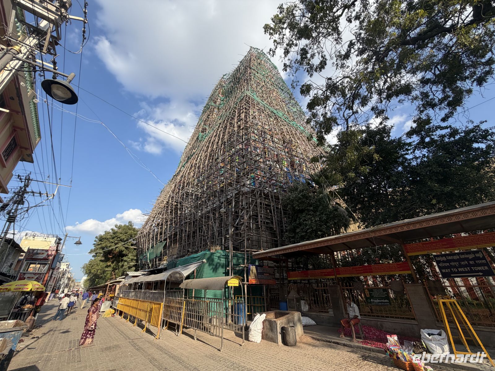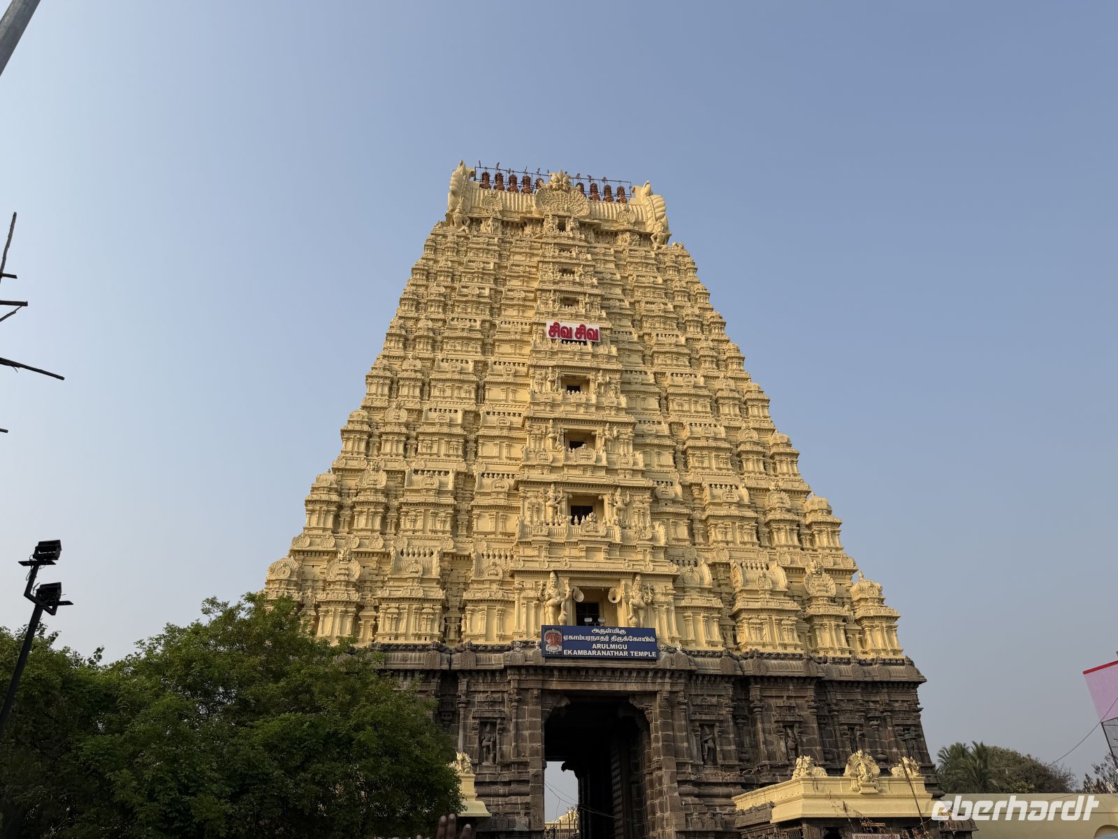 Im Stadtzentrum laufen wir auf den großen Gopuram (ca.60m) des Vaikunteswara Tempels zu. Errichtet 1509 vom Krishnadevaraja Herrscher. Das Inneren wird mit einem Bambus Gerüste aufgebaut. Barfuß laufen wir über Teppiche zum Ekambareshvara Tempel. Das größte Sakrale Bauwerk der Stadt Kranchipuram ist Shiva und dem Element Erde gewidmet.