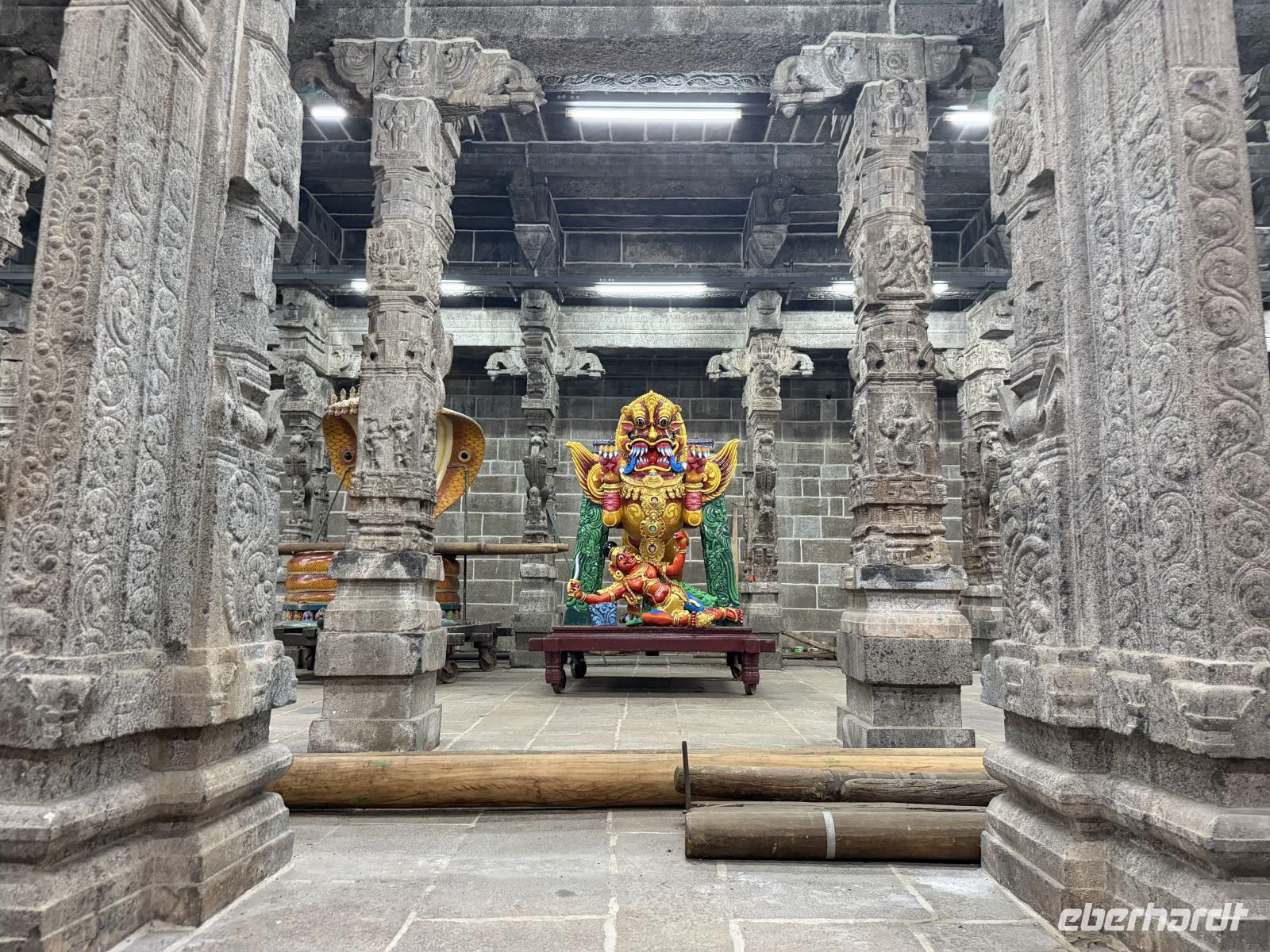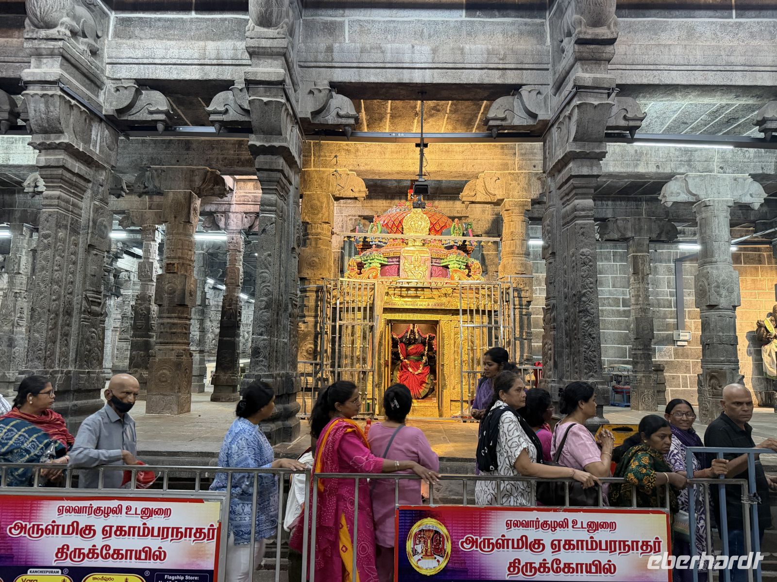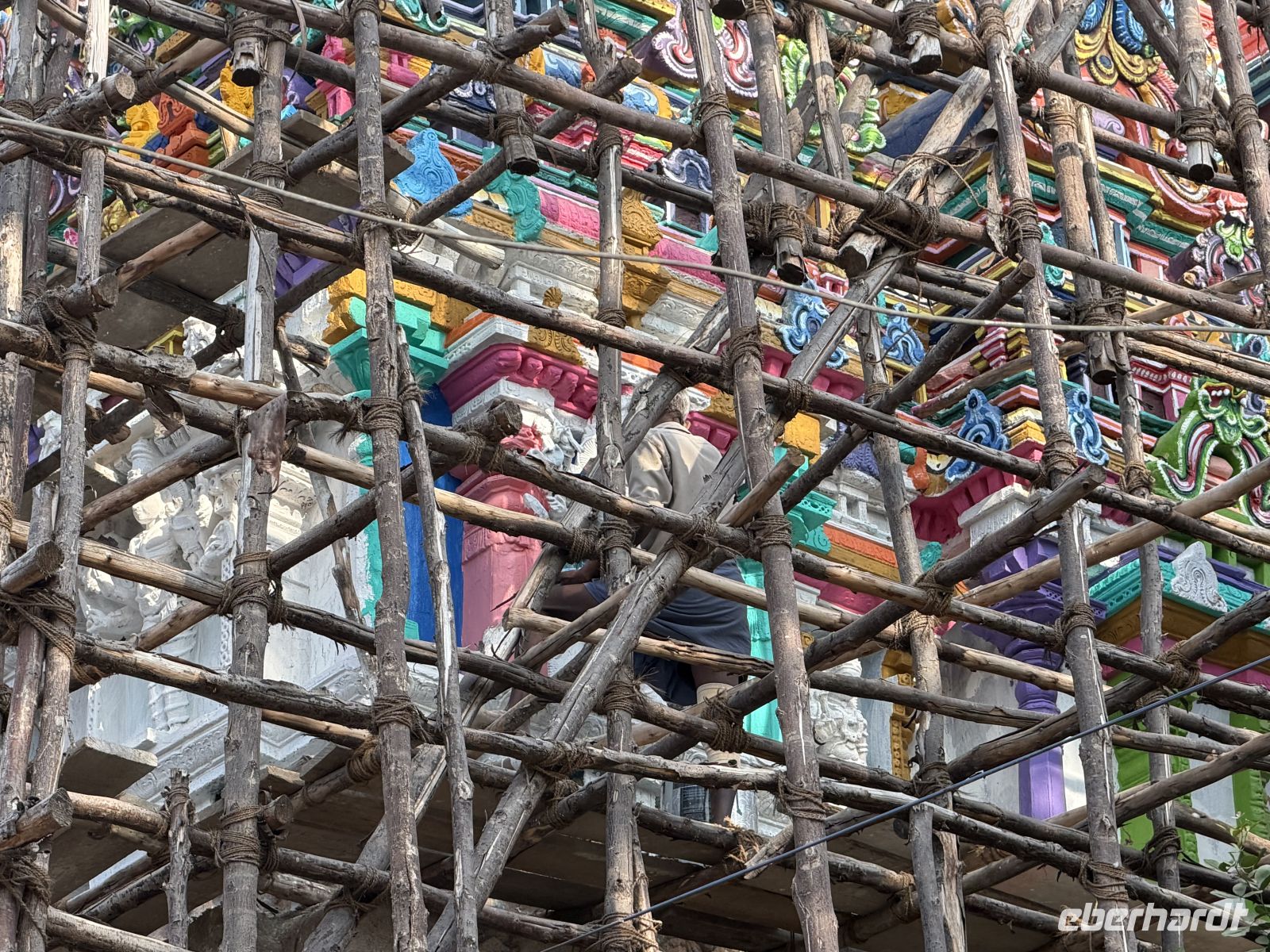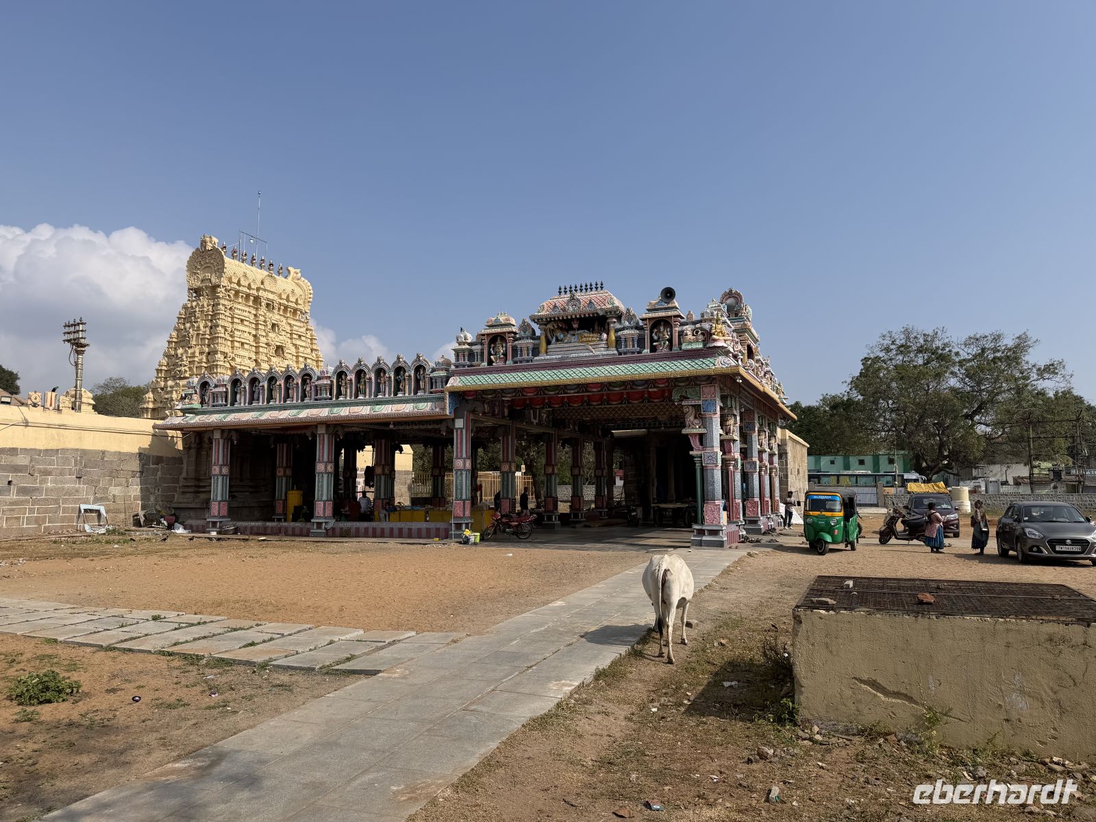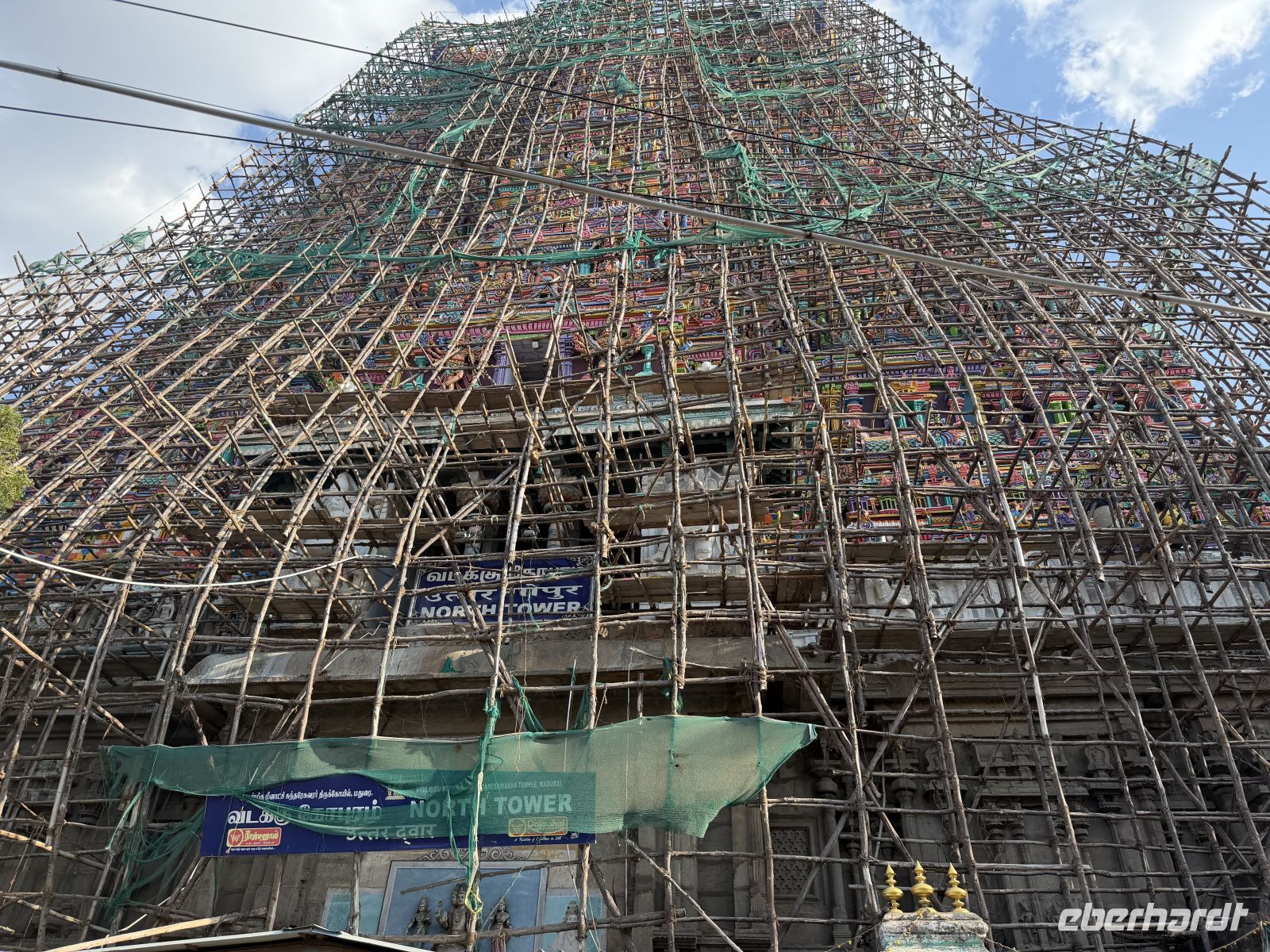Im Stadtzentrum laufen wir auf den großen Gopuram (ca.60m) des Vaikunteswara Tempels zu. Errichtet 1509 vom Krishnadevaraja Herrscher. Das Inneren wird mit einem Bambus Gerüste aufgebaut. Barfuß laufen wir über Teppiche zum Ekambareshvara Tempel. Das größte Sakrale Bauwerk der Stadt Kranchipuram ist Shiva und dem Element Erde gewidmet.