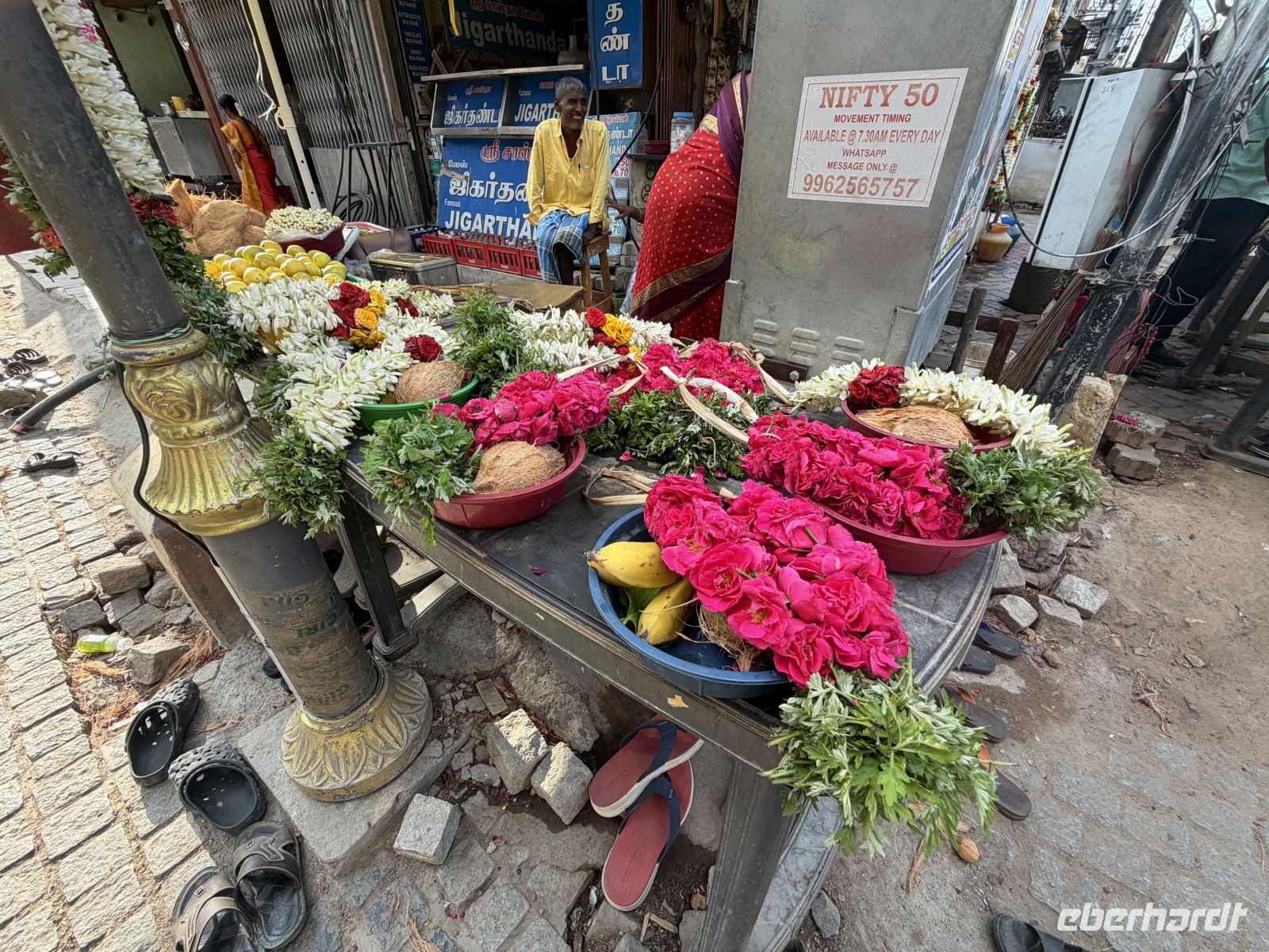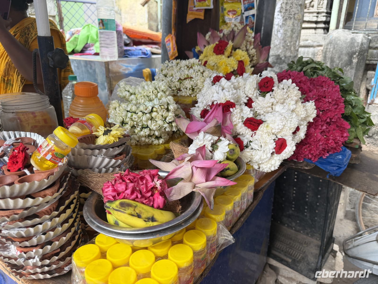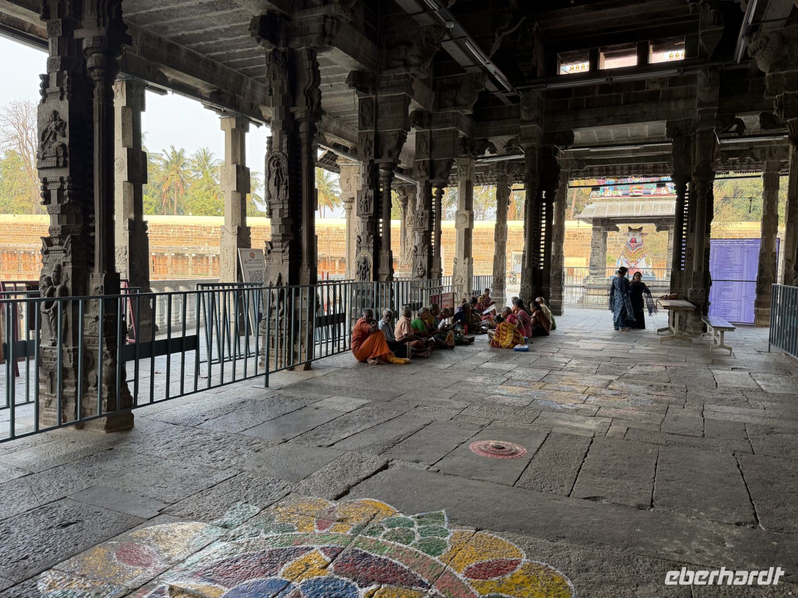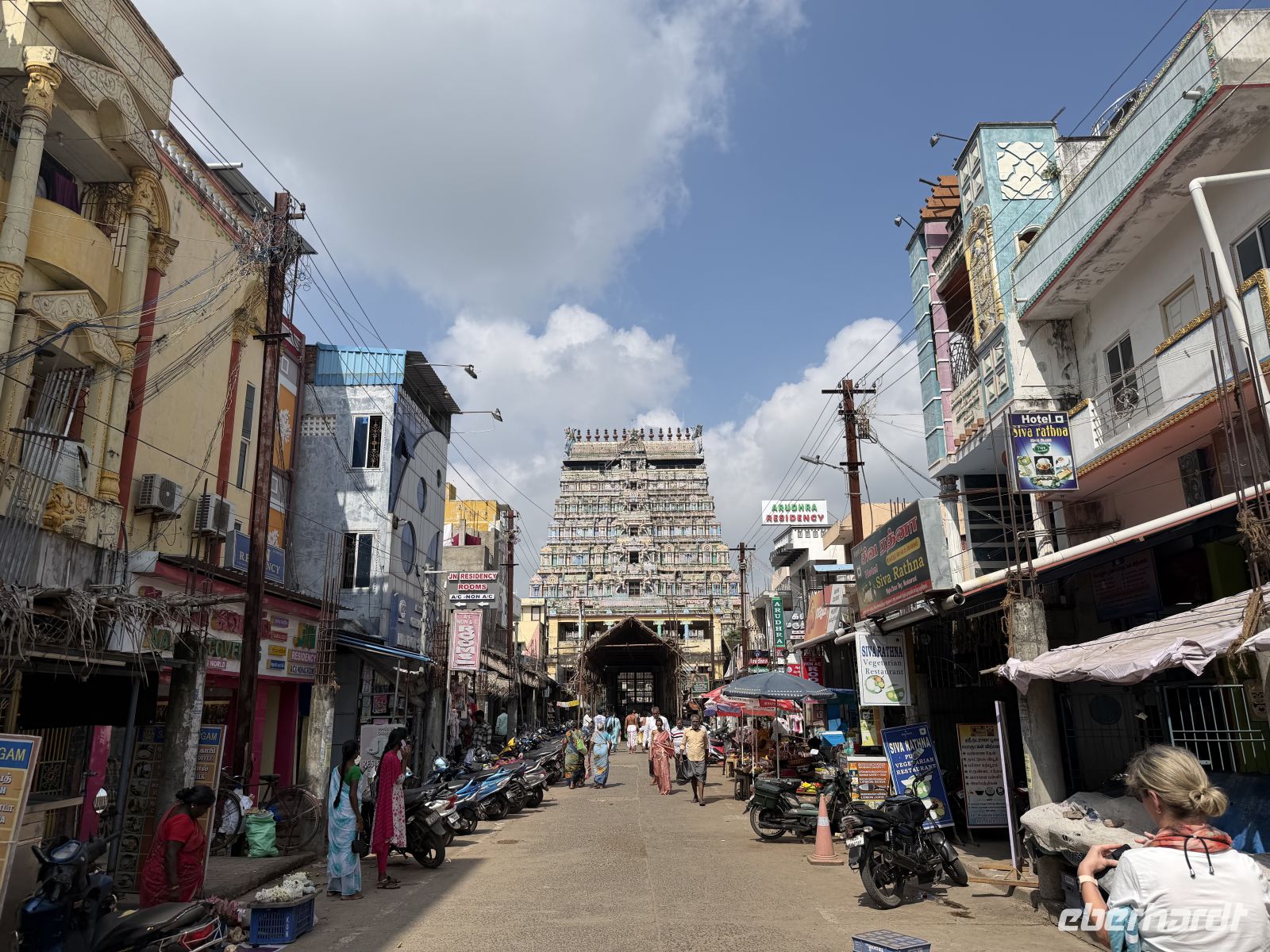 Im Stadtzentrum laufen wir auf den großen Gopuram (ca.60m) des Vaikunteswara Tempels zu. Errichtet 1509 vom Krishnadevaraja Herrscher. Das Inneren wird mit einem Bambus Gerüste aufgebaut. Barfuß laufen wir über Teppiche zum Ekambareshvara Tempel. Das größte Sakrale Bauwerk der Stadt Kranchipuram ist Shiva und dem Element Erde gewidmet.