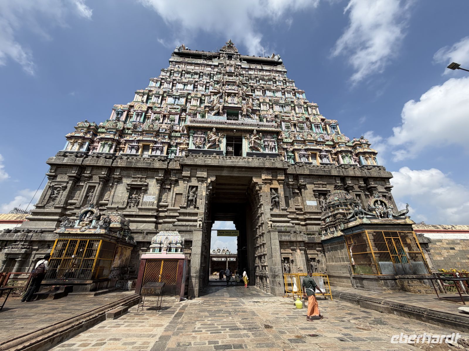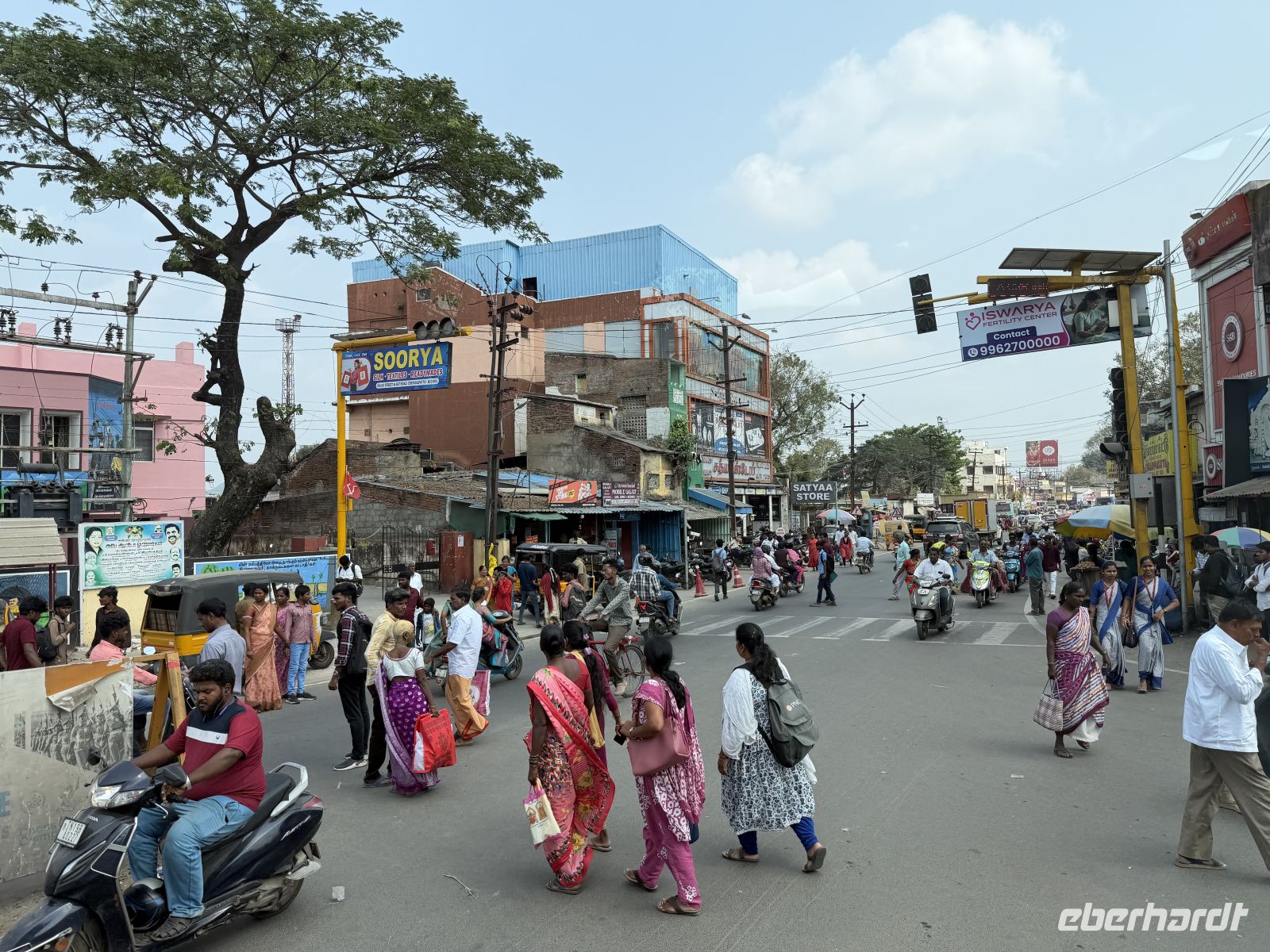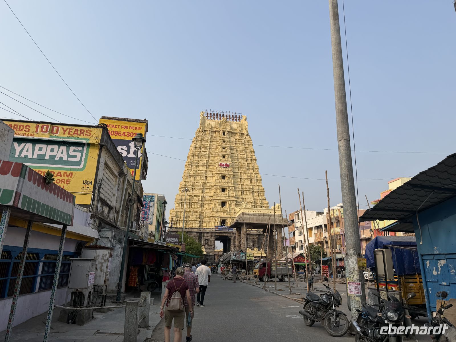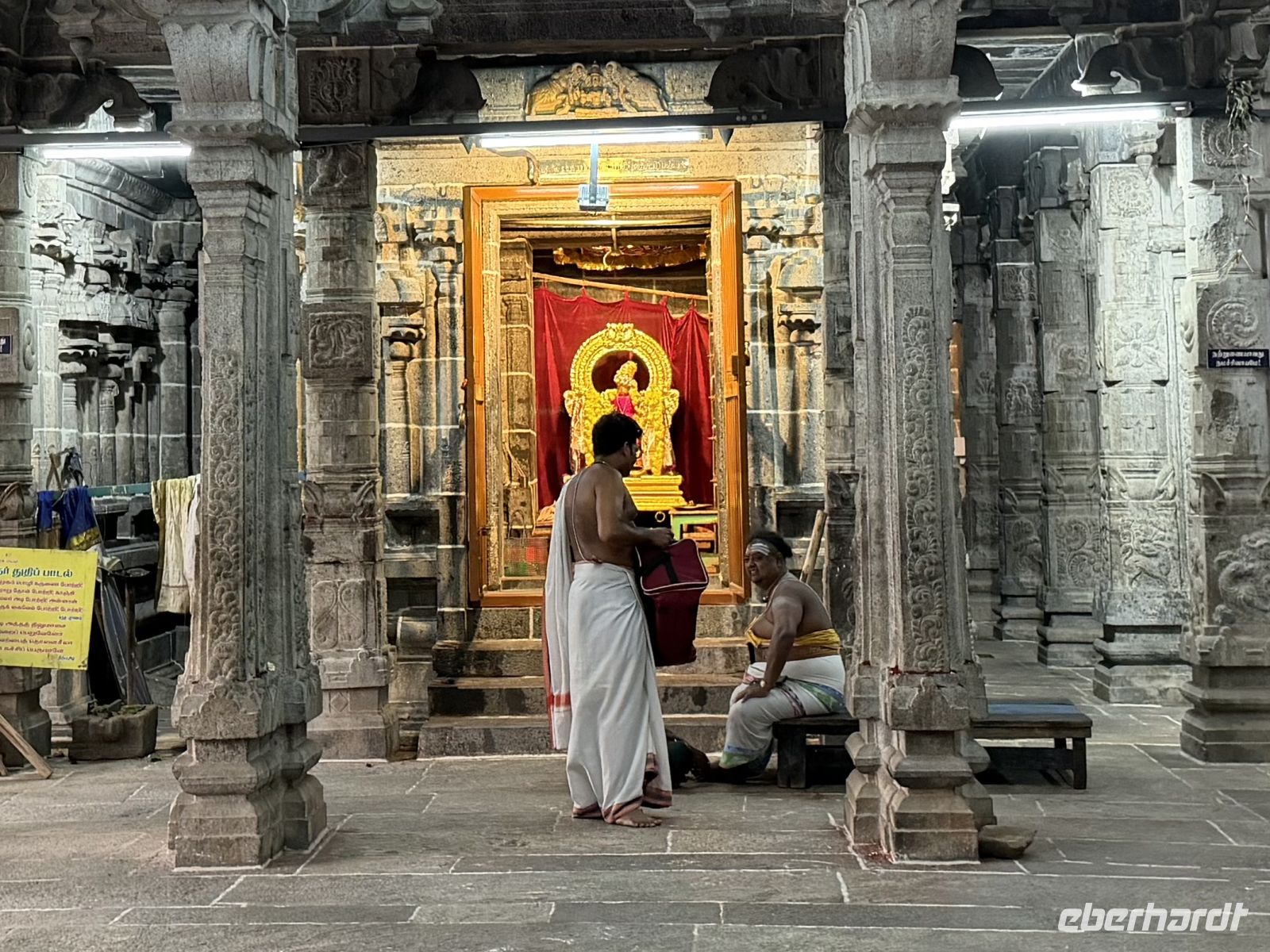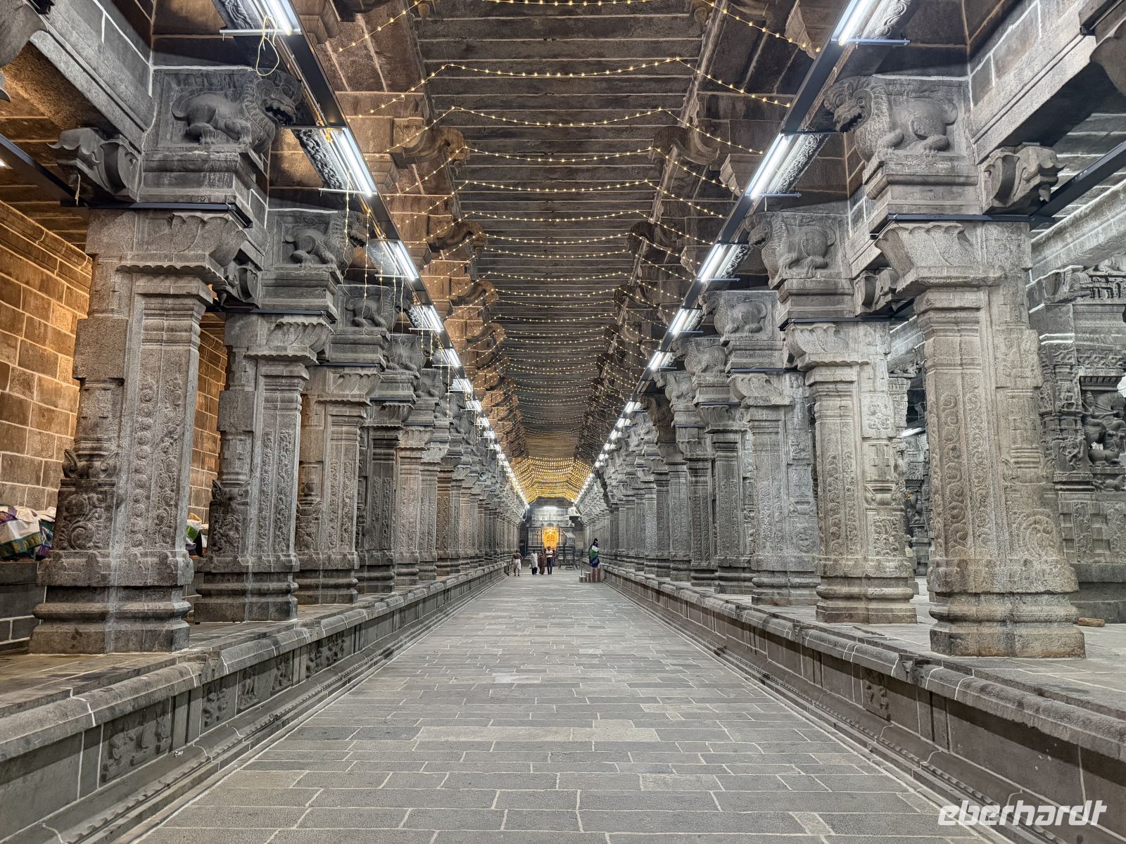 Im Stadtzentrum laufen wir auf den großen Gopuram (ca.60m) des Vaikunteswara Tempels zu. Errichtet 1509 vom Krishnadevaraja Herrscher. Das Inneren wird mit einem Bambus Gerüste aufgebaut. Barfuß laufen wir über Teppiche zum Ekambareshvara Tempel. Das größte Sakrale Bauwerk der Stadt Kranchipuram ist Shiva und dem Element Erde gewidmet.