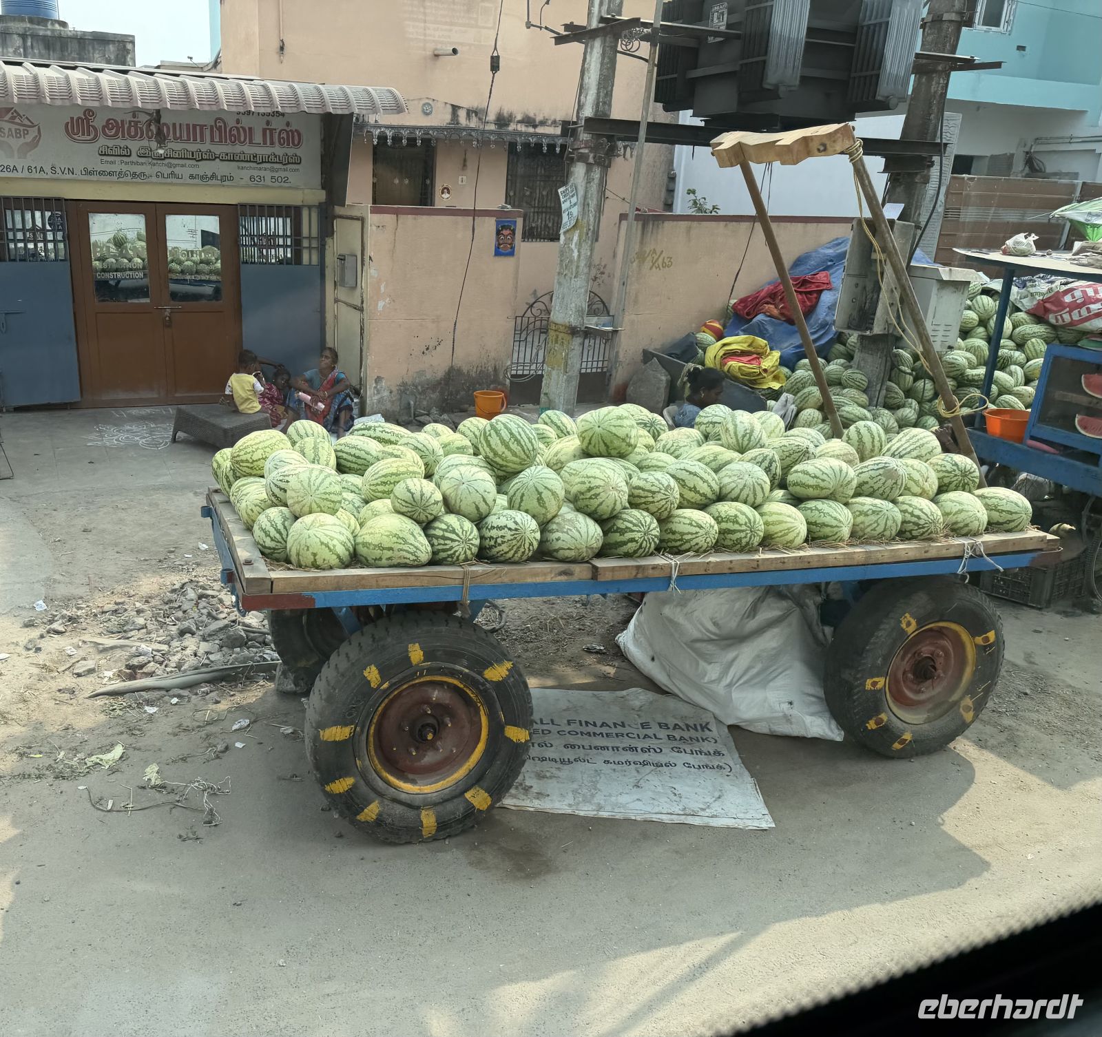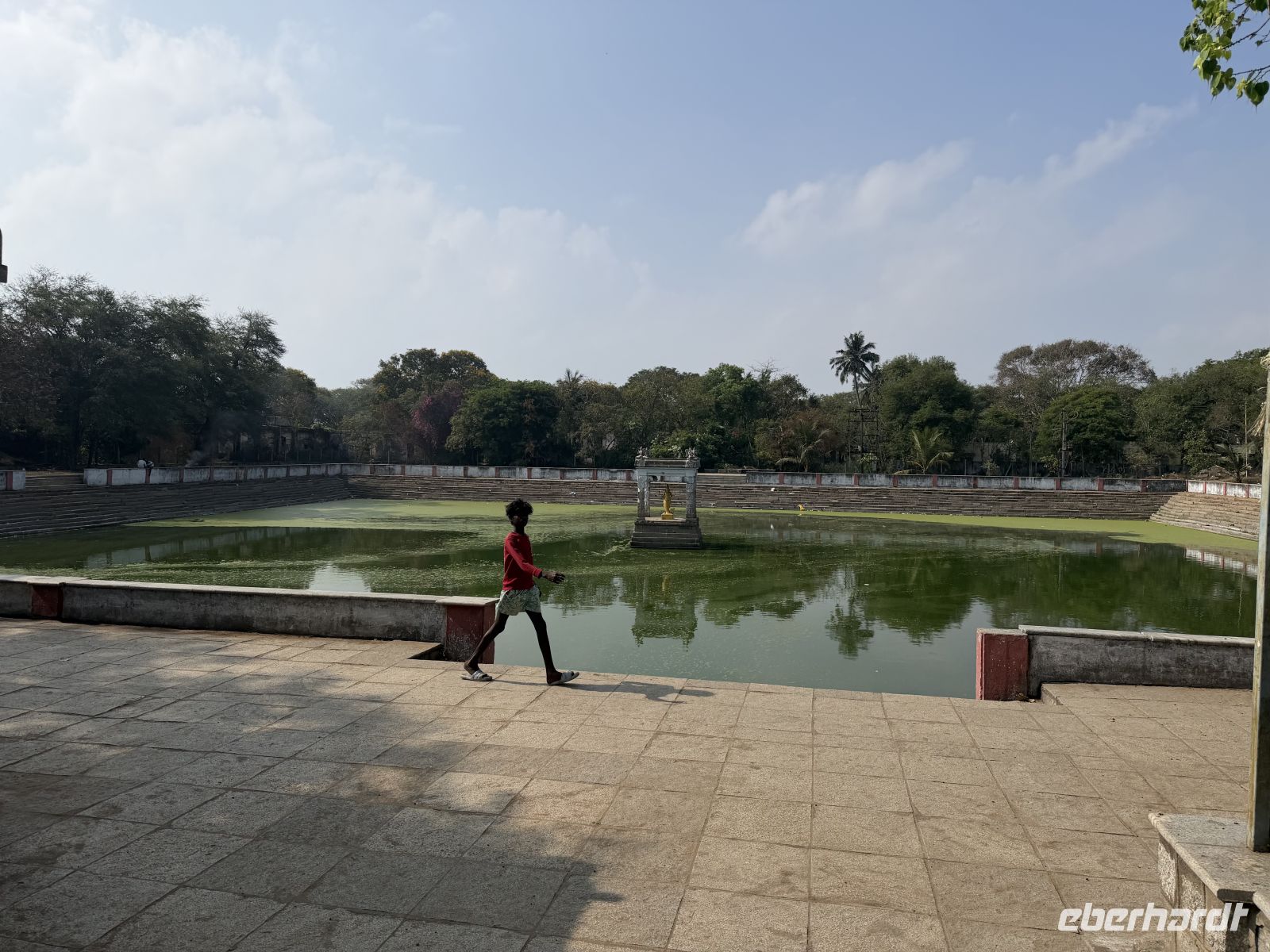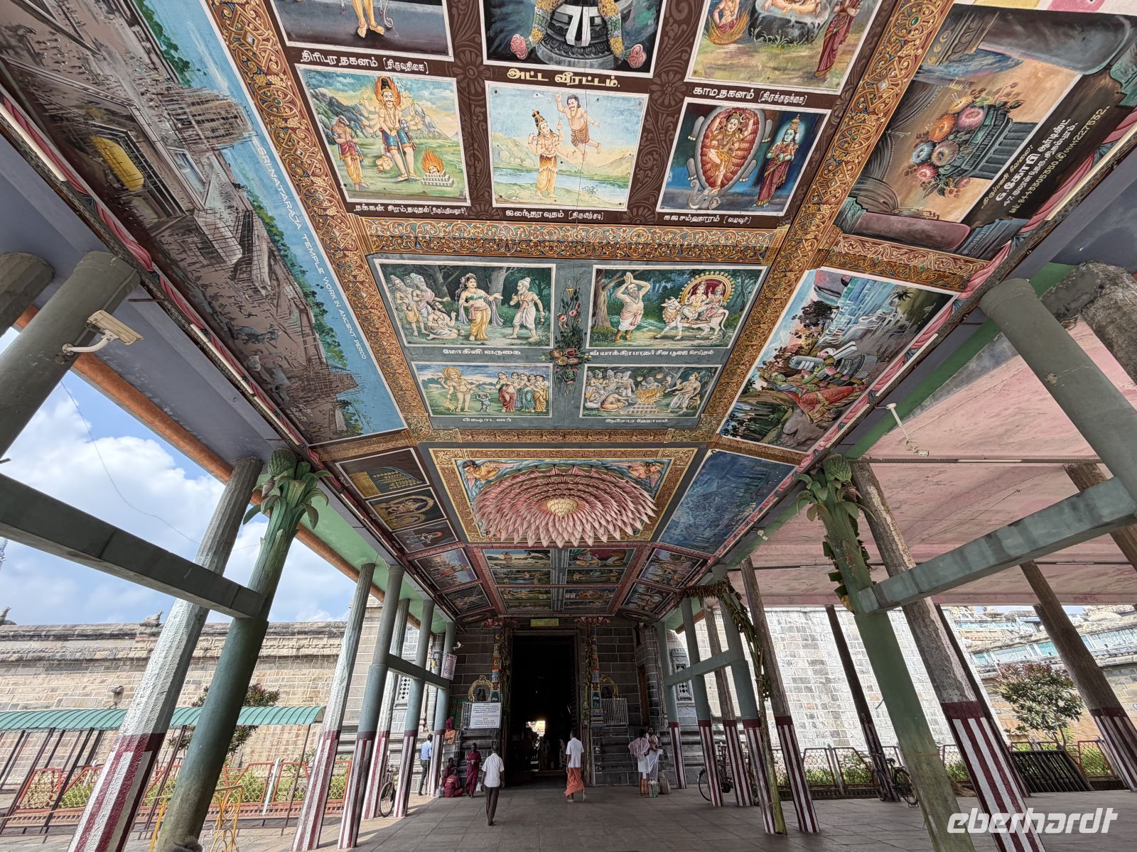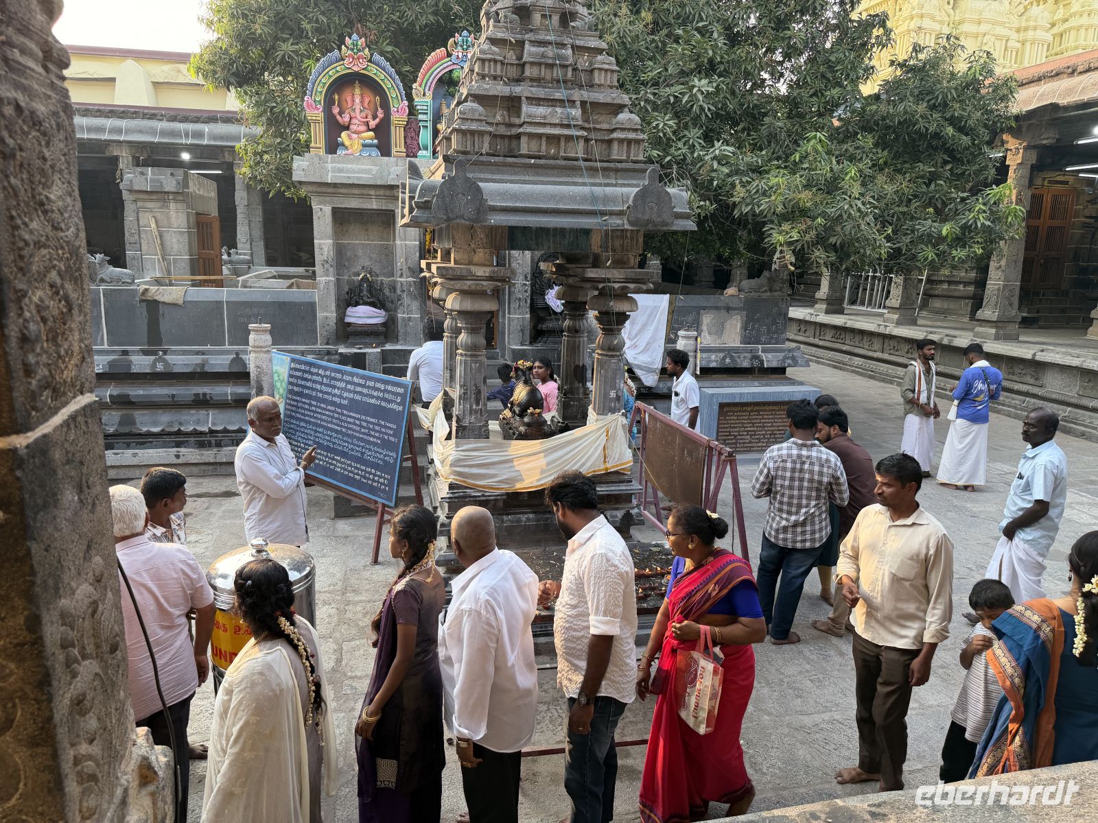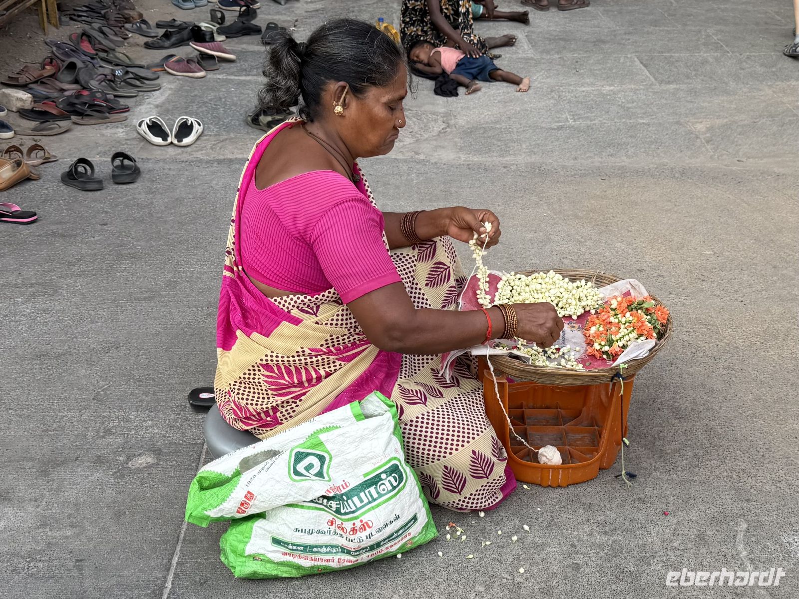 Im Stadtzentrum laufen wir auf den großen Gopuram (ca.60m) des Vaikunteswara Tempels zu. Errichtet 1509 vom Krishnadevaraja Herrscher. Das Inneren wird mit einem Bambus Gerüste aufgebaut. Barfuß laufen wir über Teppiche zum Ekambareshvara Tempel. Das größte Sakrale Bauwerk der Stadt Kranchipuram ist Shiva und dem Element Erde gewidmet.