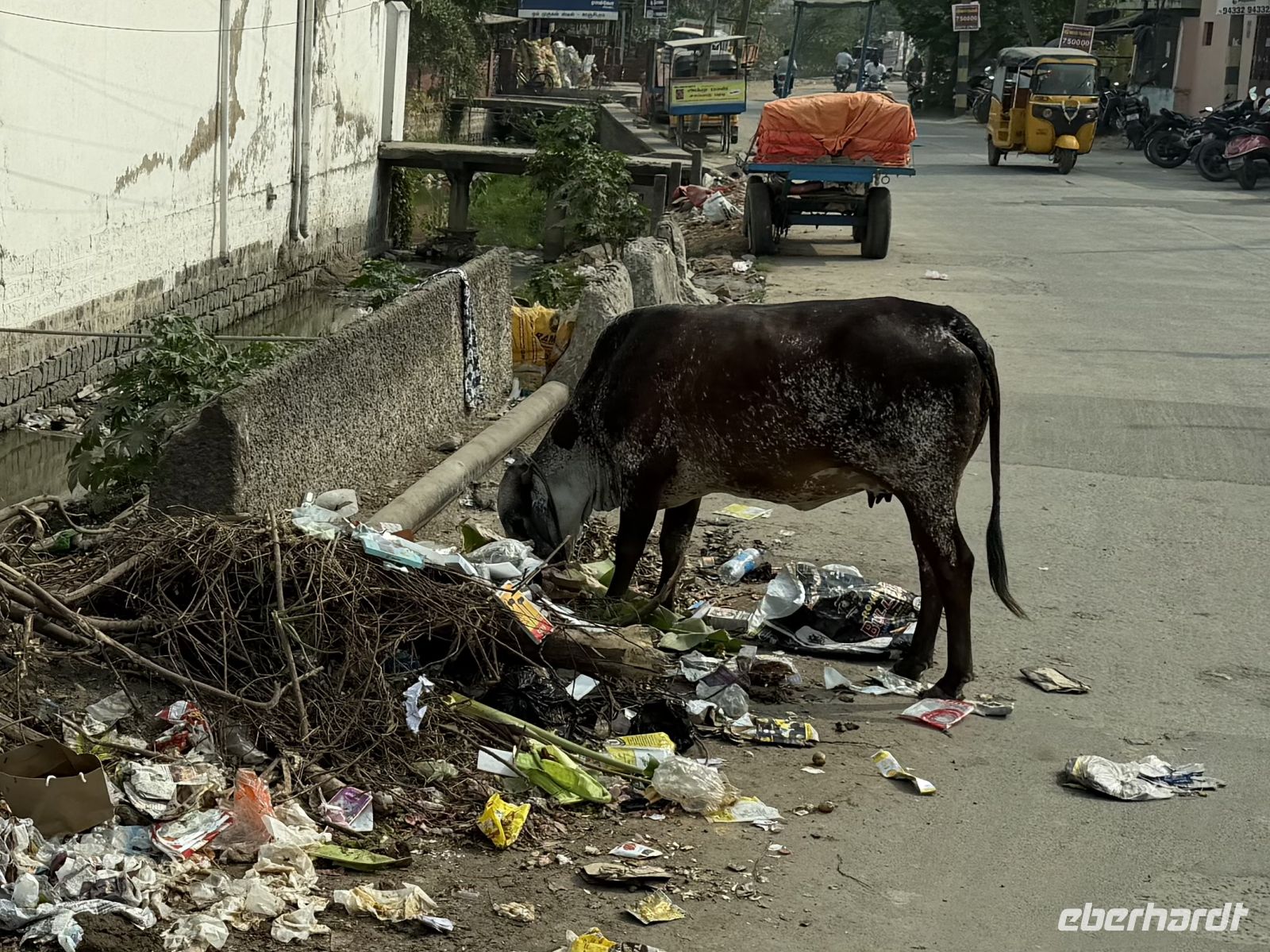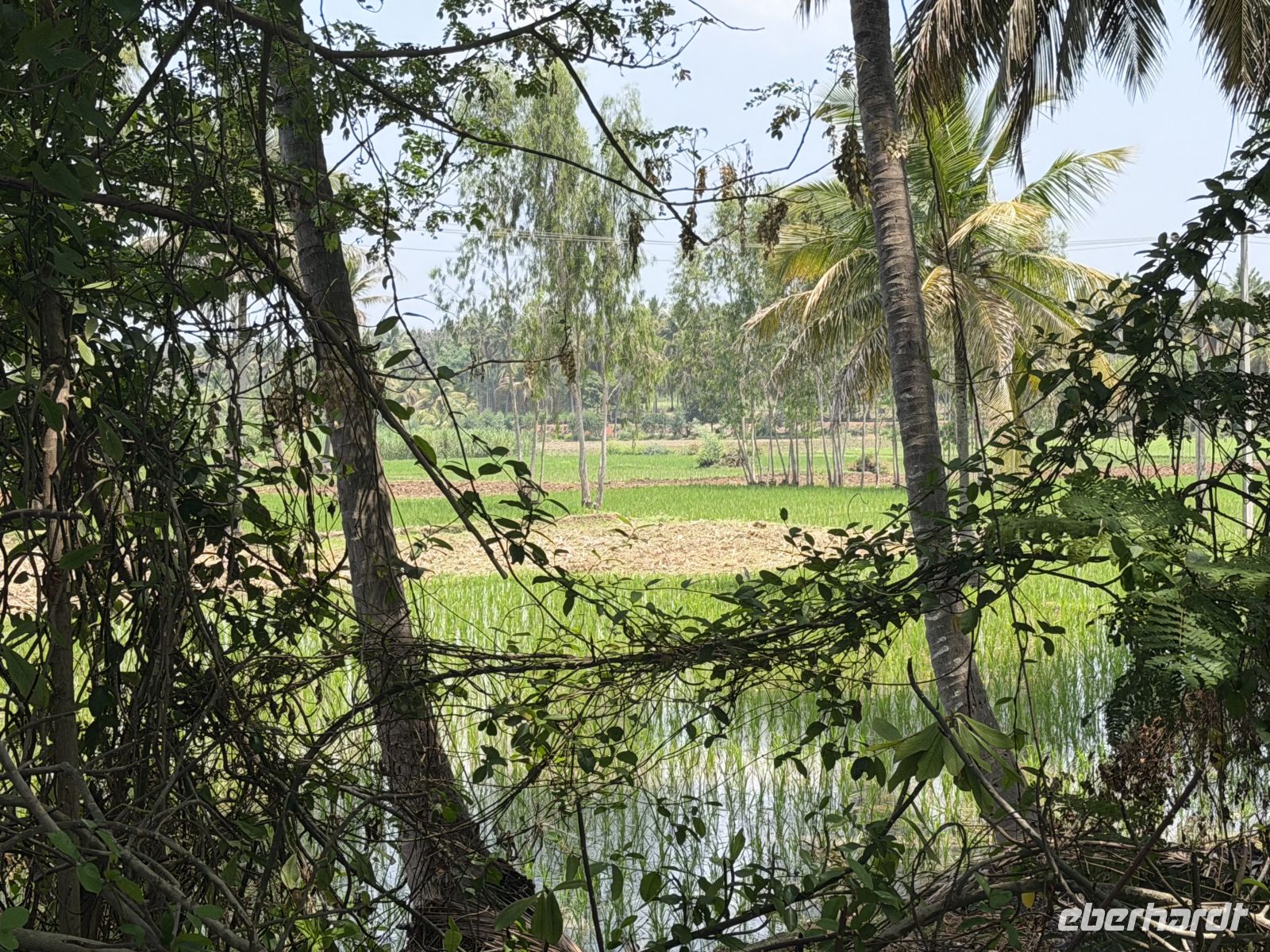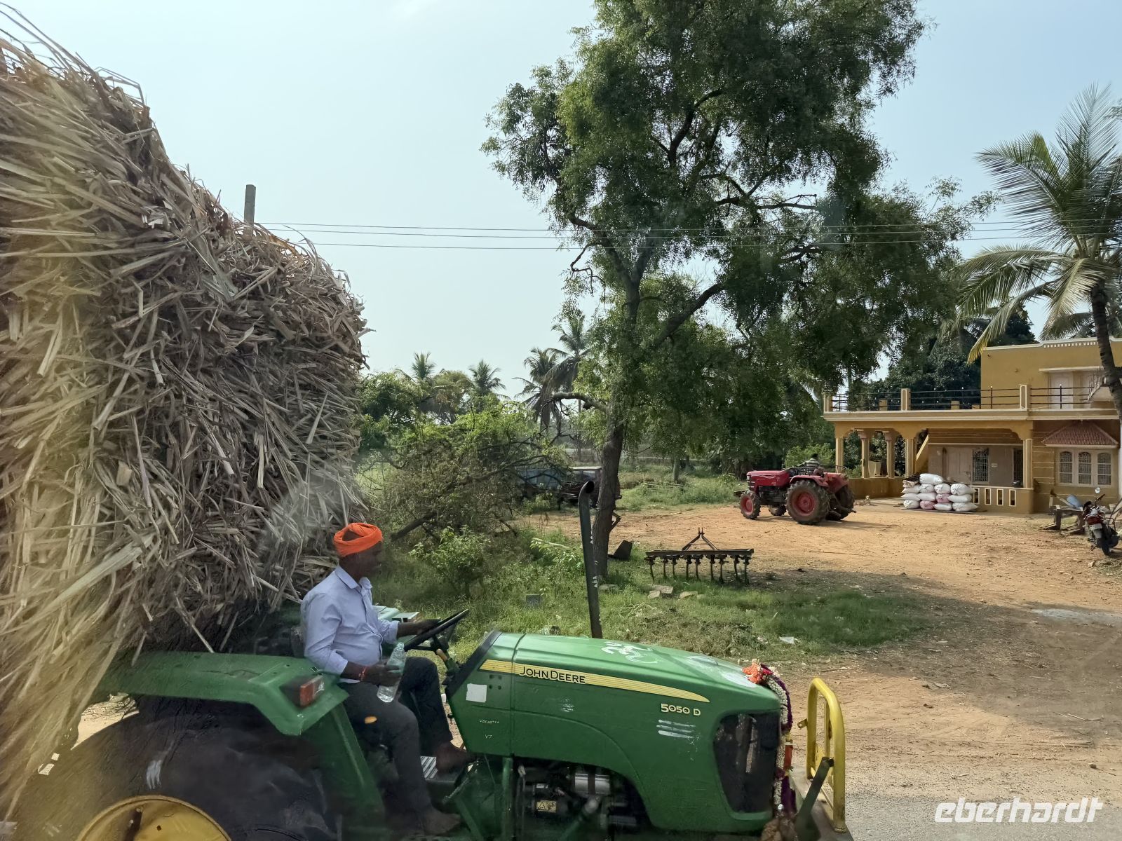 Heraus laufen wir durch den Gopuram an einem riesigen Seidenbaum vorbei ins Dorf. Eberhardt Travel spendiert eine frische Kokosnuss und unsere Tour geht weiter.