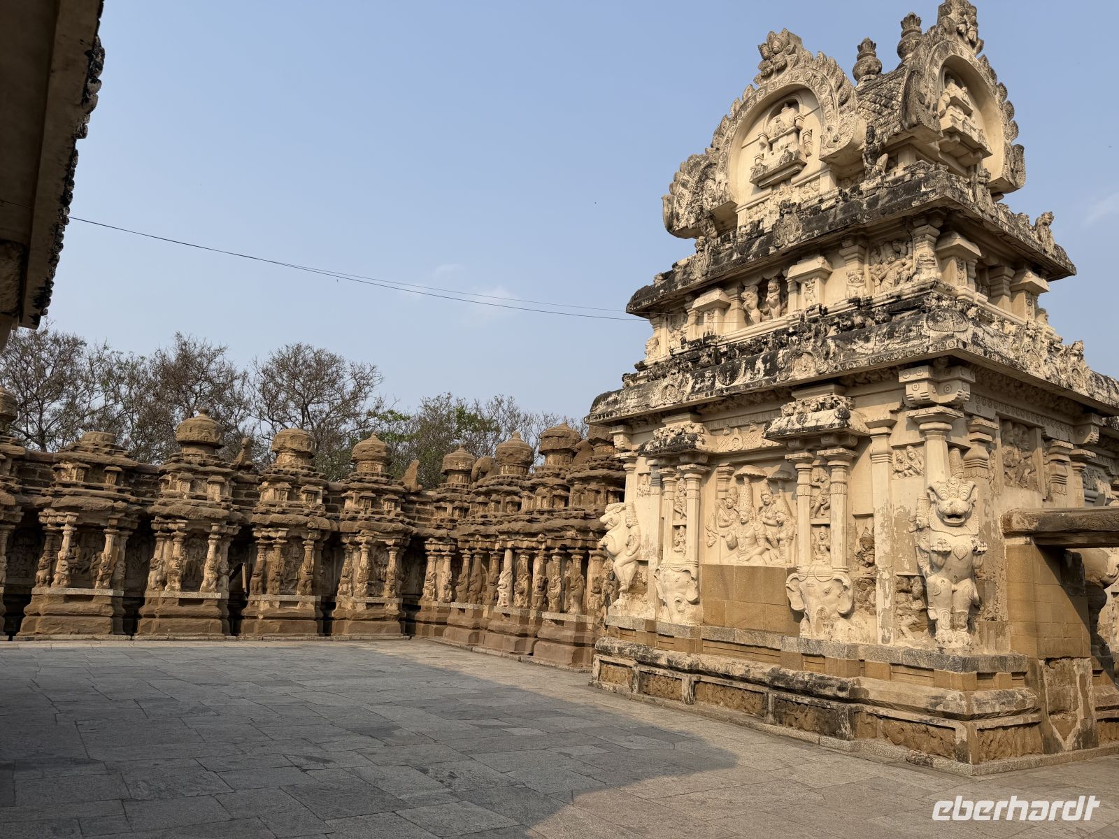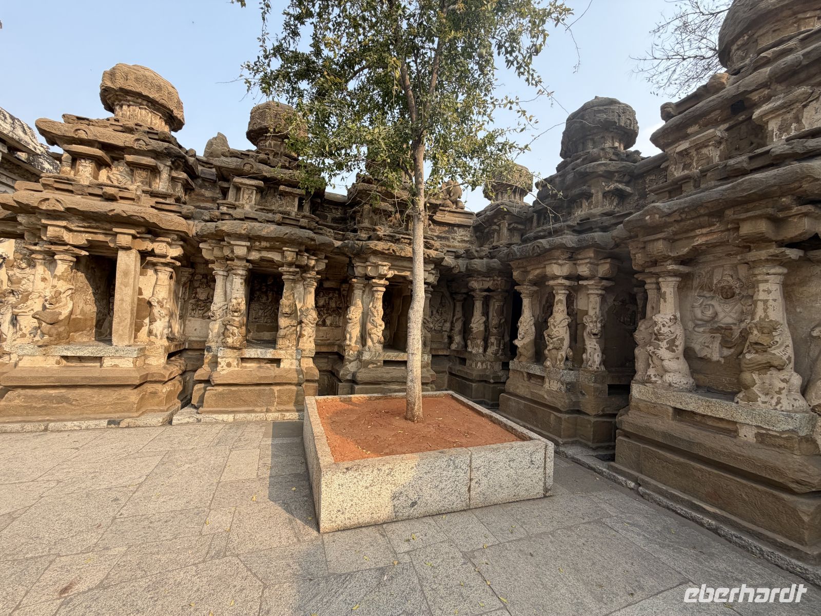 Etwas müde vom Flug, aber voller Erwartungen durchlaufen wir ohne Probleme die Einreise und sammeln unsere Koffer ein. Bhawani, unser indischer Reiseleiter wartet schon auf uns und begrüßt uns herzlich mit einem Willkommensgeschenk. Wir steigen in den Bus und machen uns auf zum Hotel in Mathukadu. Wir fallen in unsere Betten und dürfen erst mal ausschlafen, in Ruhe frühstücken und die Anlage erkunden, die am Golf von Bengalen liegt. Mittags machen wir uns dann auf dem Weg nach Kanchipuram. Die Tempel in Indien haben meistens eine Mittagsruhe zwischen 13:00 und 16:00 Uhr. Am westlichen Rand der Stadt Kanchipuram besuchen wir den Tempel Kailasanatha. Es ist eines der ältesten Shiva Tempel aus dem 8. Jahrhundert und wurde von der Pallava Dynastie erbaut. Reich verzierte Reliefs im warmen, fast goldig gelben Sandstein gehauen Darstellungen von Shiva – mal tanzend, meditierend oder kämpfend verleiht der dravidischen Architektur eine einmalige Eleganz. Viele kleine Schreine positionieren sich um das Hauptheiligtum (Vimana) wie ein steinerner Berg, dem mystischen Wohnsitz Shivas -Kailash. Im inneren des Heiligtums befindet sich der 16-eckige schwarz Lingam.
