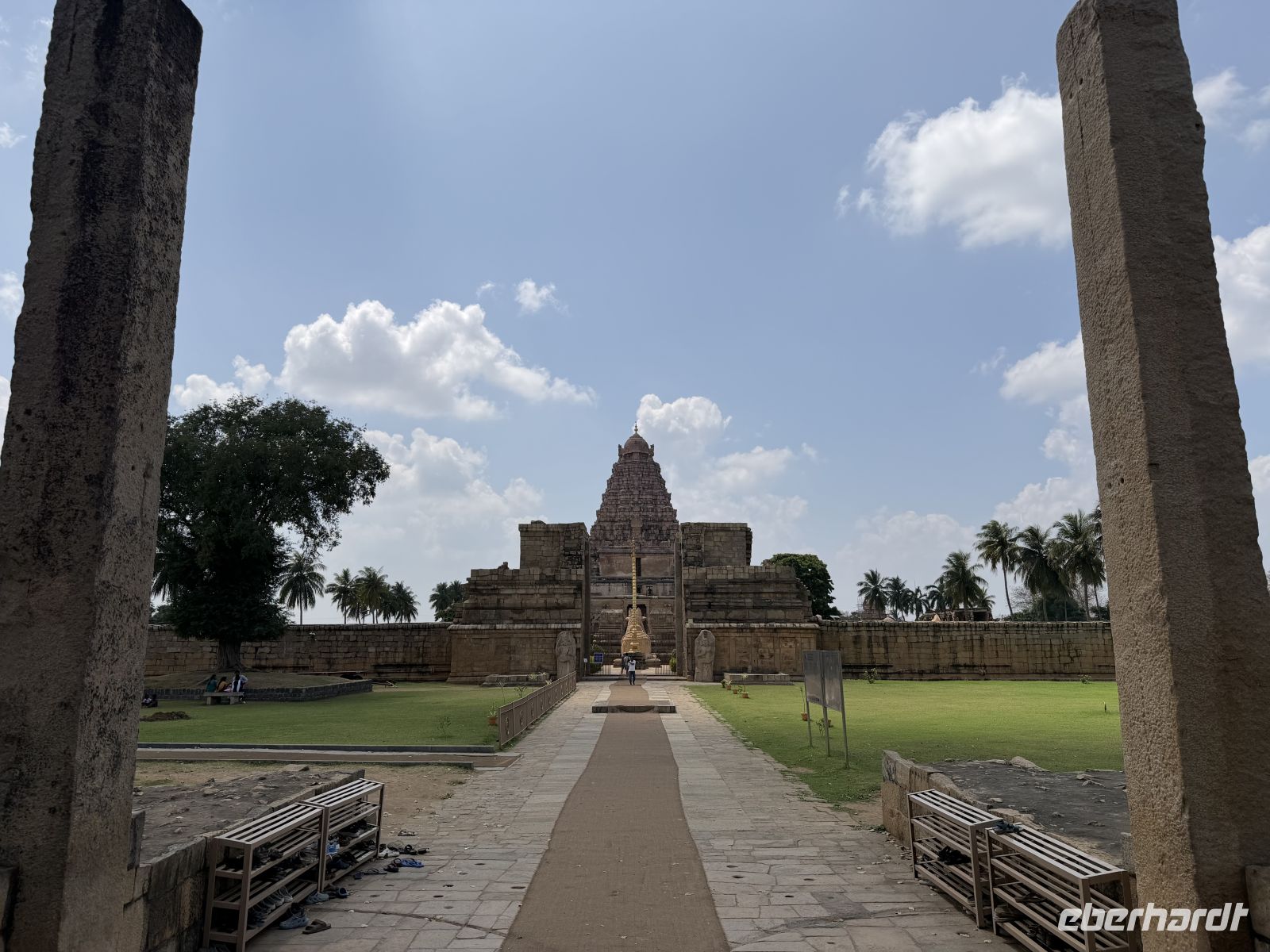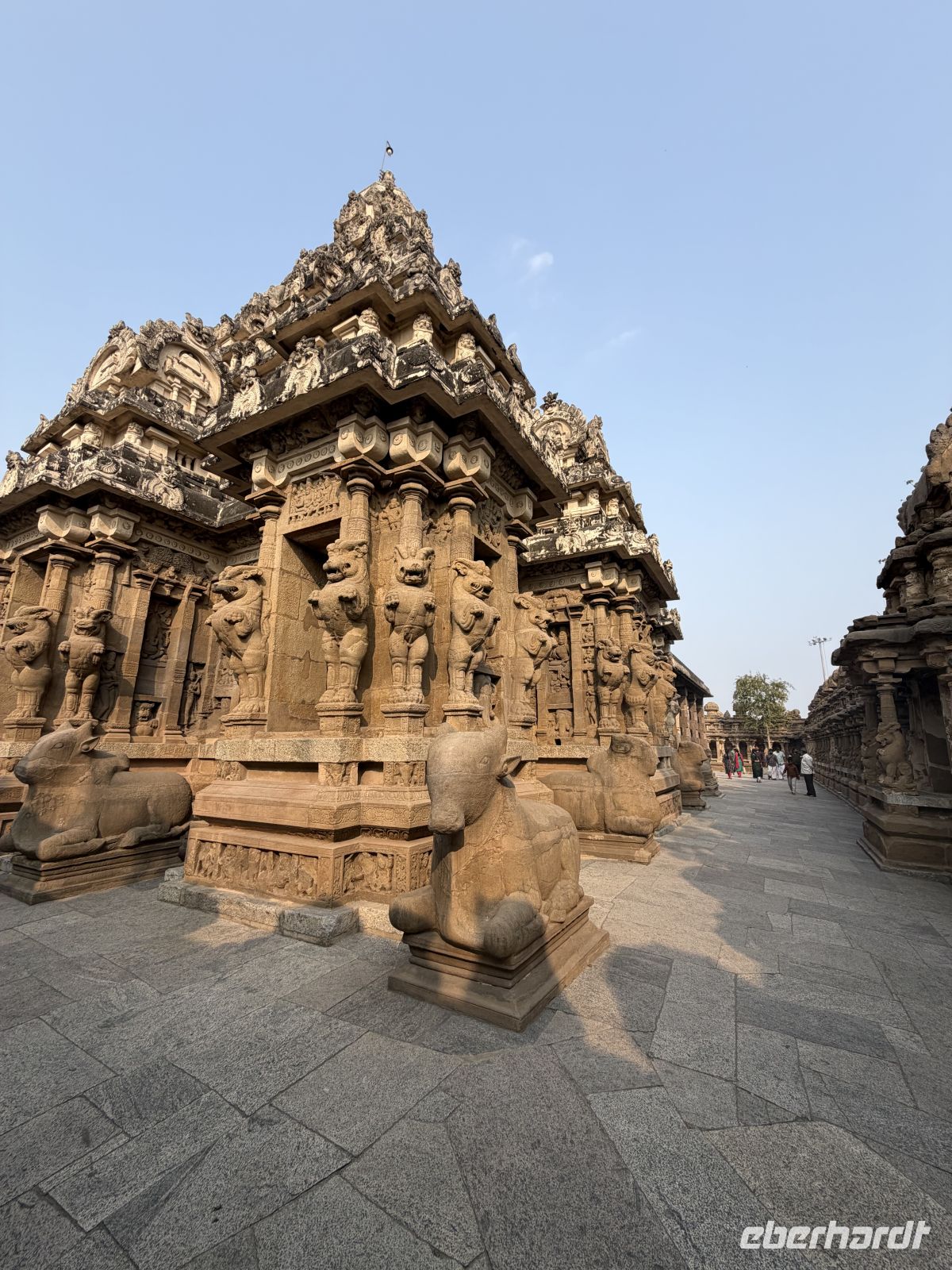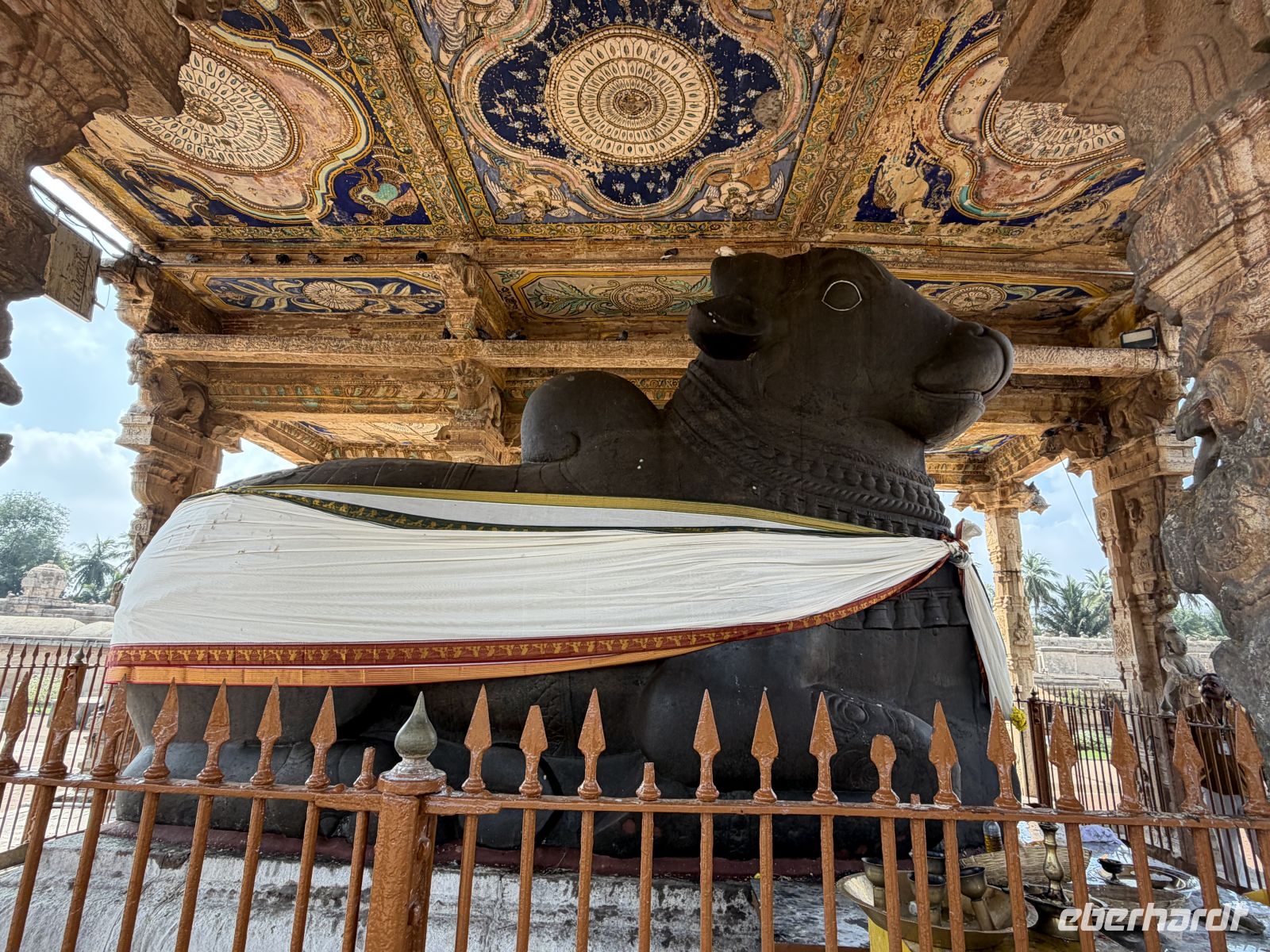 Weiter geht es nach Gangaikondacholapuram. Der Brihasisvara Tempel ist ebenfalls aus der Chola Dynasty und wurde im 11. Jh. vom Rajendra Chola I als Herzstück seiner neuen Hauptstadt errichtet. Das politische Manifest aus Stein, UNESCO Weltkulturerbe ist in strenger Ost-West Achse gebaut, auf den Sonnenaufgang gerichtet. Der Nandi Bulle ist natürlich auch perfekt auf das Heiligtum ausgerichtet. Wir wissen von unserem Reiseleiter, wo Nandis sind, ist Shiva nicht weit 😉