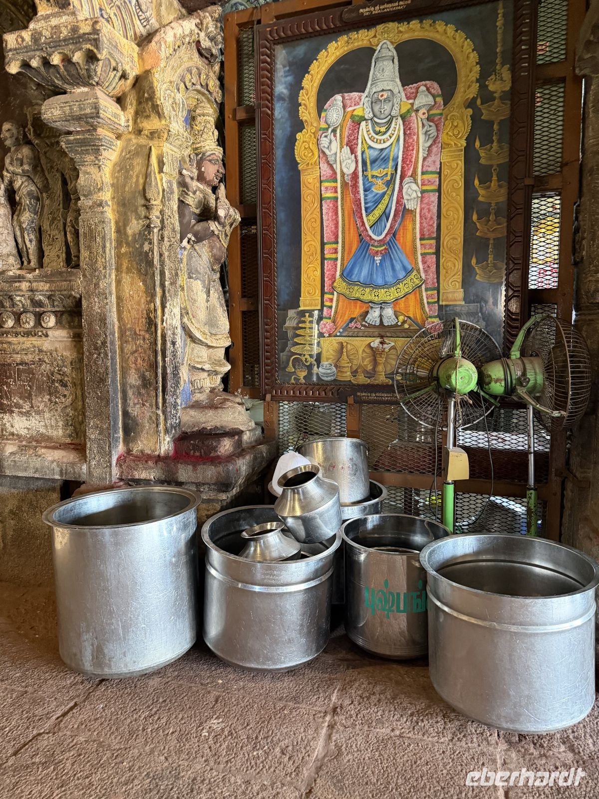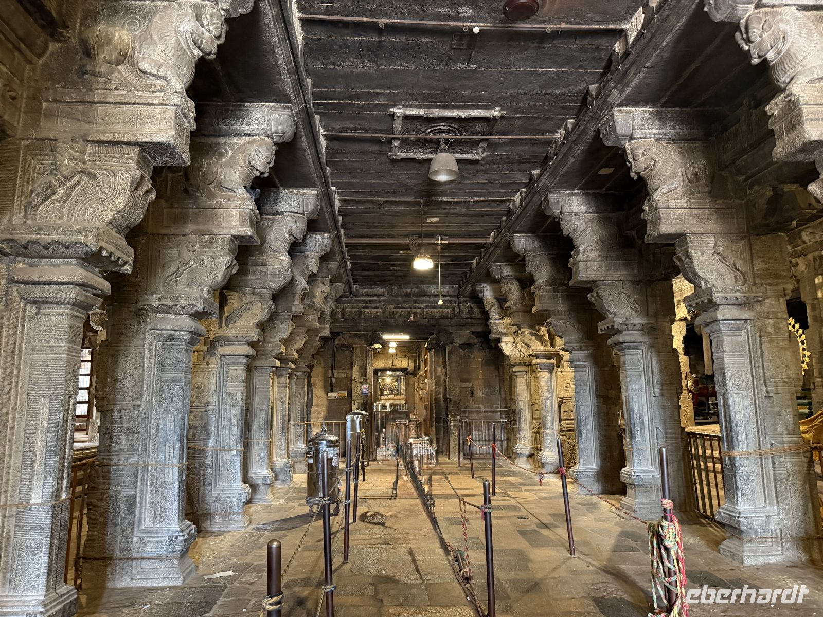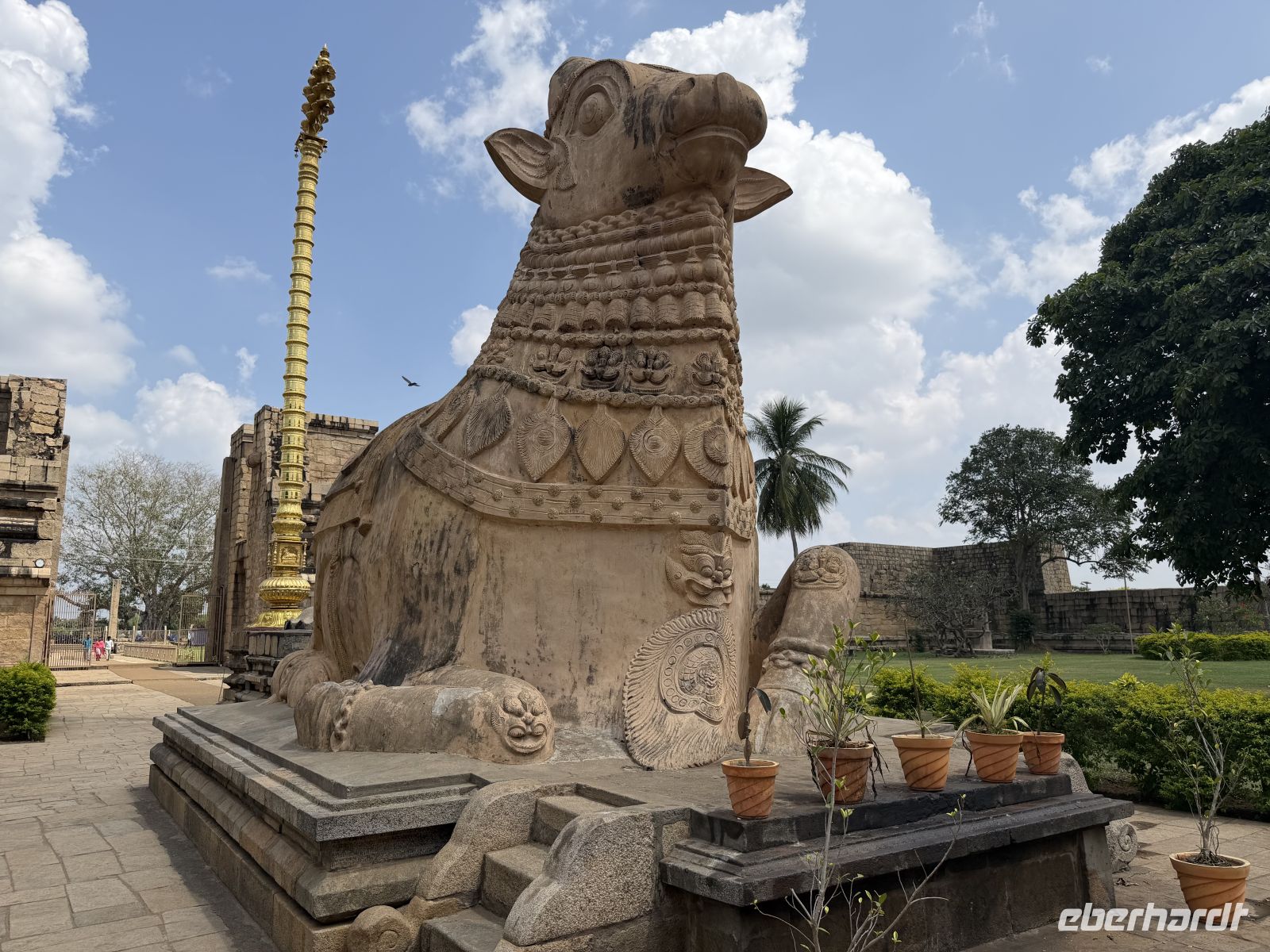 Weiter geht es nach Gangaikondacholapuram. Der Brihasisvara Tempel ist ebenfalls aus der Chola Dynasty und wurde im 11. Jh. vom Rajendra Chola I als Herzstück seiner neuen Hauptstadt errichtet. Das politische Manifest aus Stein, UNESCO Weltkulturerbe ist in strenger Ost-West Achse gebaut, auf den Sonnenaufgang gerichtet. Der Nandi Bulle ist natürlich auch perfekt auf das Heiligtum ausgerichtet. Wir wissen von unserem Reiseleiter, wo Nandis sind, ist Shiva nicht weit 😉
